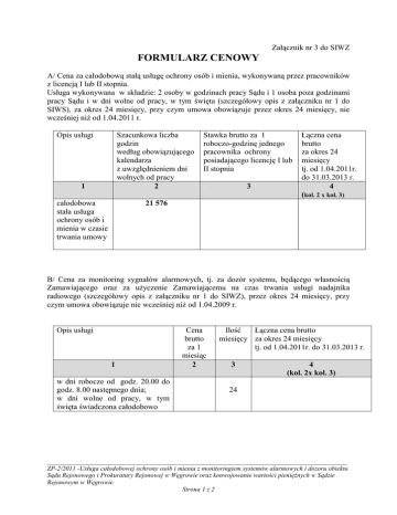 Załącznik nr 3 do SIWZ FORMULARZ CENOWY A/ Cena za całodobową stałą usługę ochrony osób i mienia, wykonywaną przez pracowników z licencją I lub II stopnia. Usługa wykonywana w składzie: 2 osoby w godzinach pracy Sądu i 1 osoba poza godzinami pracy Sądu i w dni wolne od pracy, w tym święta (szczegółowy opis z załączniku nr 1 do SIWS), za okres 24 miesięcy, przy czym umowa obowiązuje przez okres 24 miesięcy, nie wcześniej niŜ od 1.04.2011 r. Opis usługi Szacunkowa liczba godzin według obowiązującego kalendarza z uwzględnieniem dni wolnych od pracy 2 1 całodobowa stała usługa ochrony osób i mienia w czasie trwania umowy Stawka brutto za 1 roboczo-godzinę jednego pracownika ochrony posiadającego licencję I lub II stopnia 3 Łączna cena brutto za okres 24 miesięcy tj. od 1.04.2011r. do 31.03.2013 r. 4 (kol. 2 x kol. 3) 21 576 B/ Cena za monitoring sygnałów alarmowych, tj. za dozór systemu, będącego własnością Zamawiającego oraz za uŜyczenie Zamawiającemu na czas trwania usługi nadajnika radiowego (szczegółowy opis z załączniku nr 1 do SIWZ), przez okres 24 miesięcy, przy czym umowa obowiązuje nie wcześniej niŜ od 1.04.2009 r. Opis usługi 1 w dni robocze od godz. 20.00 do godz. 8.00 następnego dnia; w dni wolne od pracy, w tym święta świadczona całodobowo Cena brutto za 1 miesiąc 2 Ilość Łączna cena brutto miesięcy za okres 24 miesięcy tj. od 1.04.2011r. do 31.03.2013 r. 3 4 (kol. 2x kol. 3) 24 __________________________________________________________________________________________ ZP-2/2011 -Usługa całodobowej ochrony osób i mienia z monitoringiem systemów alarmowych i dozoru obiektu Sądu Rejonowego i Prokuratury Rejonowej w Węgrowie oraz konwojowanie wartości pienięŜnych w Sądzie Rejonowym w Węgrowie Strona 1 z 2 C/ Cena za konwojowanie wartości pienięŜnych wykonywane przez pracowników z licencją I lub II stopnia, rozliczana miesięcznie - przybliŜona ilość konwojów wyniesienie 30 szt. miesięcznie (szczegółowy opis z załączniku nr 1 do SIWZ), za okres 24 miesięcy, przy czym umowa obowiązuje nie wcześniej niŜ od 1.04.2011 r. Opis usługi Cena brutto za 1 konwój 1 2 zakładana ilość konwojów w miesiącu – 40. Cena brutto za 1 miesiąc 3 ( 40 szt. x kol.2) Ilość miesięcy 4 Razem cena brutto za okres 24 miesięcy tj. od 1.04.2011 do 31.03.2013 r. 5 (kol.3x kol.4) 24 Wartość oferty (po zsumowaniu wartości uzyskanych na usługi A, B i C) wynosi: - ogółem brutto .................................. zł (słownie:........................................................................................................................................ .......................................................................................................................................) złotych. Data i podpis (czytelny lub z pieczątką) ………………………. (Podpis osoby uprawnionej lub osób uprawnionych do reprezentowania wykonawcy w dokumentach rejestrowych lub we właściwym upowaŜnieniu) ZATWIERDZAM wzór dokumentu: Węgrów, dnia 07.02.2011 r. ______________________ __________________________________________________________________________________________ ZP-2/2011 -Usługa całodobowej ochrony osób i mienia z monitoringiem systemów alarmowych i dozoru obiektu Sądu Rejonowego i Prokuratury Rejonowej w Węgrowie oraz konwojowanie wartości pienięŜnych w Sądzie Rejonowym w Węgrowie Strona 2 z 2