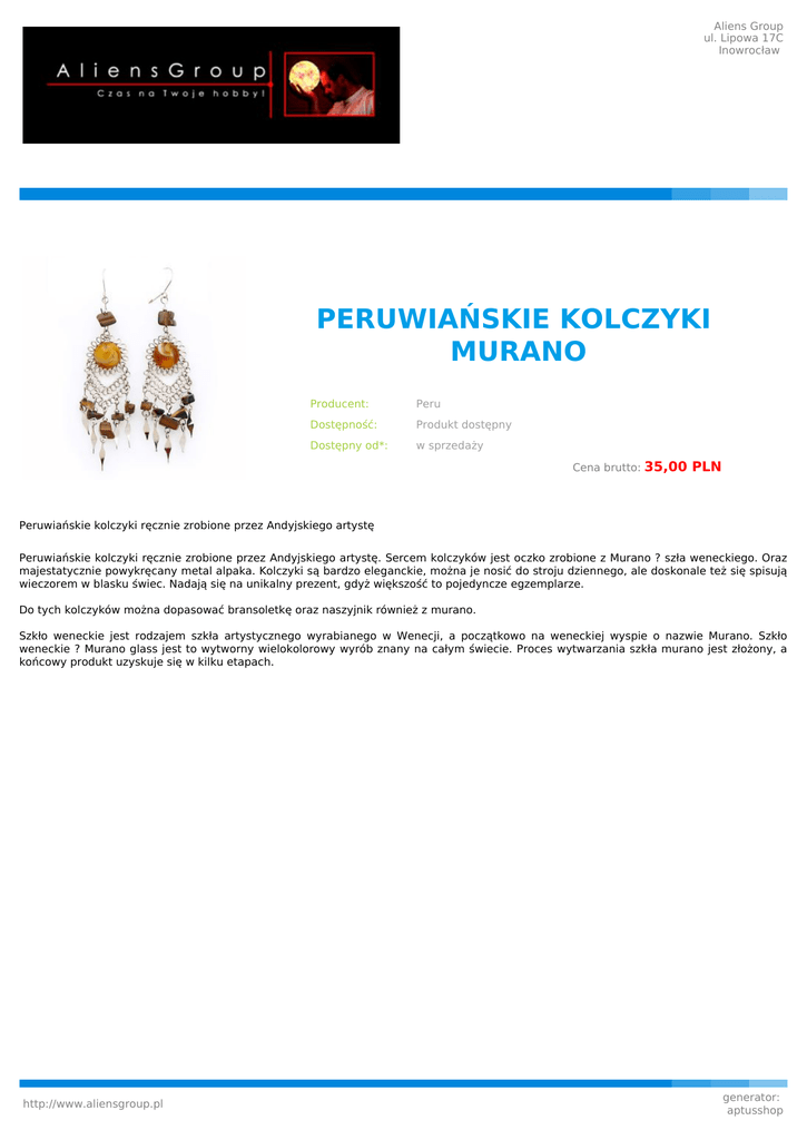 Aliens Group ul. Lipowa 17C Inowrocław PERUWIAŃSKIE KOLCZYKI MURANO Producent: Peru Dostępność: Produkt dostępny Dostępny od*: w sprzedaży Cena brutto: 35,00 PLN Peruwiańskie kolczyki ręcznie zrobione przez Andyjskiego artystę Peruwiańskie kolczyki ręcznie zrobione przez Andyjskiego artystę. Sercem kolczyków jest oczko zrobione z Murano ? szła weneckiego. Oraz majestatycznie powykręcany metal alpaka. Kolczyki są bardzo eleganckie, można je nosić do stroju dziennego, ale doskonale też się spisują wieczorem w blasku świec. Nadają się na unikalny prezent, gdyż większość to pojedyncze egzemplarze. Do tych kolczyków można dopasować bransoletkę oraz naszyjnik również z murano. Szkło weneckie jest rodzajem szkła artystycznego wyrabianego w Wenecji, a początkowo na weneckiej wyspie o nazwie Murano. Szkło weneckie ? Murano glass jest to wytworny wielokolorowy wyrób znany na całym świecie. Proces wytwarzania szkła murano jest złożony, a końcowy produkt uzyskuje się w kilku etapach. http://www.aliensgroup.pl generator: aptusshop