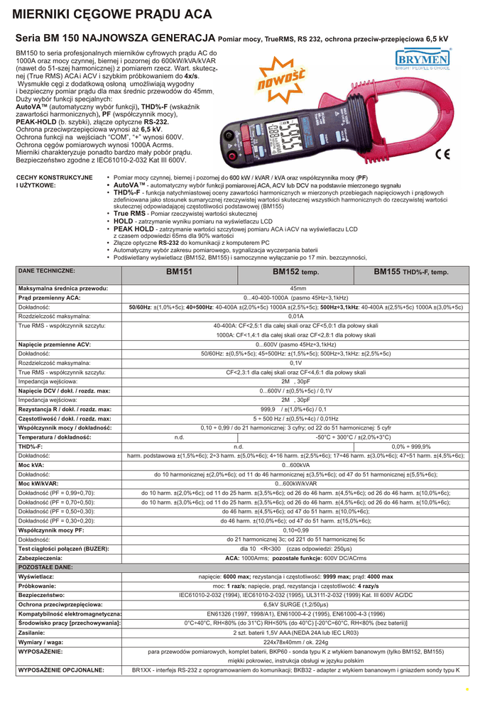 MIERNIKI CÊGOWE PR¥DU ACA Seria BM 150 NAJNOWSZA GENERACJA Pomiar mocy, TrueRMS, RS 232, ochrona przeciw-przepiêciowa 6,5 kV BM150 to seria profesjonalnych mierników cyfrowych pr¹du AC do 1000A oraz mocy czynnej, biernej i pozornej do 600kW/kVA/kVAR (nawet do 51-szej harmonicznej) z pomiarem rzecz. Wart. skutecznej (True RMS) ACA i ACV i szybkim próbkowaniem do 4x/s. Wysmuk³e cêgi z dodatkow¹ os³on¹ umo¿liwiaj¹ wygodny i bezpieczny pomiar pr¹du dla max œrednic przewodów do 45mm. Du¿y wybór funkcji specjalnych: AutoVA™ (automatyczny wybór funkcji), THD%-F (wskaŸnik zawartoœci harmonicznych), PF (wspó³czynnik mocy), PEAK-HOLD (b. szybki), z³¹cze optyczne RS-232. Ochrona przeciwprzepiêciowa wynosi a¿ 6,5 kV. Ochrona funkcji na wejœciach “COM”, “+” wynosi 600V. Ochrona cêgów pomiarowych wynosi 1000A Acrms. Mierniki charakteryzuje ponadto bardzo ma³y pobór pr¹du. Bezpieczeñstwo zgodne z IEC61010-2-032 Kat III 600V. CECHY KONSTRUKCYJNE I U¯YTKOWE: • Pomiar mocy czynnej, biernej i pozornej do 600 kW / kVAR / kVA oraz wspó³czynnika mocy (PF) • AutoVA™ - automatyczny wybór funkcji pomiarowej ACA, ACV lub DCV na podstawie mierzonego sygna³u • THD%-F - funkcja natychmiastowej oceny zawartoœci harmonicznych w mierzonych przebiegach napiêciowych i pr¹dowych • • • • • • zdefiniowana jako stosunek sumarycznej rzeczywistej wartoœci skutecznej wszystkich harmonicznych do rzeczywistej wartoœci skutecznej odpowiadaj¹cej czêstotliwoœci podstawowej (BM155) True RMS - Pomiar rzeczywistej wartoœci skutecznej HOLD - zatrzymanie wyniku pomiaru na wyœwietlaczu LCD PEAK HOLD - zatrzymanie wartoœci szczytowej pomiaru ACA i ACV na wyœwietlaczu LCD z czasem odpowiedzi 65ms dla 90% wartoœci Z³¹cze optyczne RS-232 do komunikacji z komputerem PC Automatyczny wybór zakresu pomiarowego, sygnalizacja wyczerpania baterii Podœwietlany wyœwietlacz (BM152, BM155) i samoczynne wy³¹czanie po 17 min. bezczynnoœci, DANE TECHNICZNE: BM151 BM152 temp. Maksymalna œrednica przewodu: Æ45mm Pr¹d przemienny ACA: Dok³adnoœæ: BM155 THD%-F, temp. 0...40-400-1000A (pasmo 45Hz÷3,1kHz) 50/60Hz: ±(1,0%+5c); 40÷500Hz: 40-400A ±(2,0%+5c) 1000A ±(2,5%+5c); 500Hz÷3,1kHz: 40-400A ±(2,5%+5c) 1000A ±(3,0%+5c) Rozdzielczoœæ maksymalna: 0,01A True RMS - wspó³czynnik szczytu: 40-400A: CF<2,5:1 dla ca³ej skali oraz CF<5,0:1 dla po³owy skali 1000A: CF<1,4:1 dla ca³ej skali oraz CF<2,8:1 dla po³owy skali Napiêcie przemienne ACV: 0...600V (pasmo 45Hz÷3,1kHz) Dok³adnoœæ: 50/60Hz: ±(0,5%+5c); 45÷500Hz: ±(1,5%+5c); 500Hz÷3,1kHz: ±(2,5%+5c) Rozdzielczoœæ maksymalna: 0,1V True RMS - wspó³czynnik szczytu: CF<2,3:1 dla ca³ej skali oraz CF<4,6:1 dla po³owy skali Impedancja wejœciowa: 2MW, 30pF Napiêcie DCV / dok³. / rozdz. max: 0...600V / ±(0,5%+5c) / 0,1V Impedancja wejœciowa: 2MW, 30pF Rezystancja R / dok³. / rozdz. max: 999,9W / ±(1,0%+6c) / 0,1W Czêstotliwoœæ / dok³. / rozdz. max: 5 ÷ 500 Hz / ±(0,5%+4c) / 0,01Hz Wspó³czynnik mocy / dok³adnoœæ: 0,10 ÷ 0,99 / do 21 harmonicznej: 3 cyfry; od 22 do 51 harmonicznej: 5 cyfr Temperatura / dok³adnoœæ: THD%-F: Dok³adnoœæ: Moc kVA: Dok³adnoœæ: Moc kW/kVAR: n.d. -50°C ÷ 300°C / ±(2,0%+3°C) n.d. 0,0% ÷ 999,9% harm. podstawowa ±(1,5%+6c); 2÷3 harm. ±(5,0%+6c); 4÷16 harm. ±(2,5%+6c); 17÷46 harm. ±(3,0%+6c); 47÷51 harm. ±(4,5%+6c); 0...600kVA do 10 harmonicznej ±(2,0%+6c); od 11 do 46 harmonicznej ±(3,5%+6c); od 47 do 51 harmonicznej ±(5,5%+6c); 0...600kW/kVAR Dok³adnoœæ (PF = 0,99÷0,70): do 10 harm. ±(2,0%+6c); od 11 do 25 harm. ±(3,5%+6c); od 26 do 46 harm. ±(4,5%+6c); od 26 do 46 harm. ±(10,0%+6c); Dok³adnoœæ (PF = 0,70÷0,50): do 10 harm. ±(3,0%+6c); od 11 do 25 harm. ±(3,5%+6c); od 26 do 46 harm. ±(4,5%+6c); od 26 do 46 harm. ±(10,0%+6c); Dok³adnoœæ (PF = 0,50÷0,30): do 46 harm. ±(4,5%+6c); od 47 do 51 harm. ±(10,0%+6c); Dok³adnoœæ (PF = 0,30÷0,20): do 46 harm. ±(10,0%+6c); od 47 do 51 harm. ±(15,0%+6c); Wspó³czynnik mocy PF: Dok³adnoœæ: Test ci¹g³oœci po³¹czeñ (BUZER): Zabezpieczenia: 0,10÷0,99 do 21 harmonicznej 3c; od 221 do 51 harmonicznej 5c dla 10W<R<300W (czas odpowiedzi: 250µs) ACA: 1000Arms; pozosta³e funkcje: 600V DC/ACrms POZOSTA£E DANE: Wyœwietlacz: Próbkowanie: Bezpieczeñstwo: Ochrona przeciwprzepiêciowa: napiêcie: 6000 max; rezystancja i czêstotliwoœæ: 9999 max; pr¹d: 4000 max moc: 1 raz/s; napiêcie, pr¹d, rezystancja i czêstotliwoœæ: 4 razy/s IEC61010-2-032 (1994), IEC61010-2-032 (1995), UL3111-2-032 (1999) Kat. III 600V AC/DC 6,5kV SURGE (1,2/50µs) Kompatybilnoœæ elektromagnetyczna: EN61326 (1997, 1998/A1), EN61000-4-2 (1995), EN61000-4-3 (1996) Œrodowisko pracy [przechowywania]: 0°C÷40°C, RH<80% (do 31°C) RH<50% (do 40°C) [-20°C÷60°C, RH<80% (bez baterii)] Zasilanie: 2 szt. baterii 1,5V AAA (NEDA 24A lub IEC LR03) Wymiary / waga: 224x78x40mm / ok. 224g WYPOSA¯ENIE: para przewodów pomiarowych, komplet baterii, BKP60 - sonda typu K z wtykiem bananowym (tylko BM152, BM155) miêkki pokrowiec, instrukcja obs³ugi w jêzyku polskim WYPOSA¯ENIE OPCJONALNE: BR1XX - interfejs RS-232 z oprogramowaniem do komunikacji; BKB32 - adapter z wtykiem bananowym i gniazdem sondy typu K