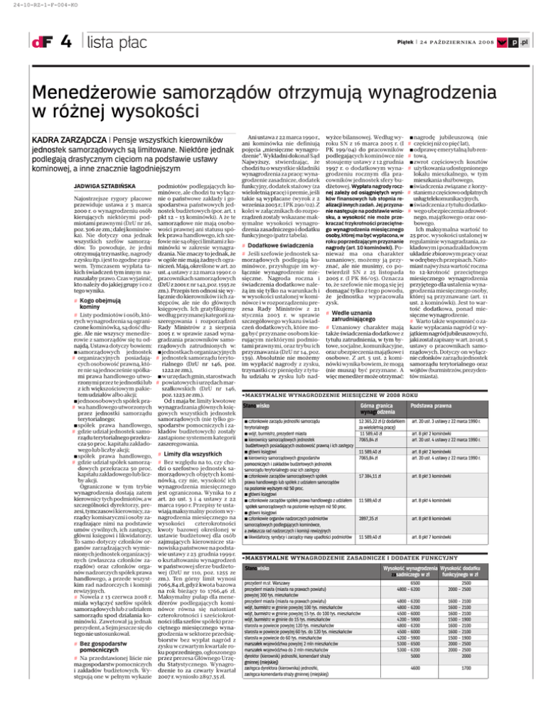 24-10-RZ-1-F-004-KO 4 lista płac Piątek | 24 października 2008 Menedżerowie samorządów otrzymują wynagrodzenia w różnej wysokości KADRA ZARZĄDCZA | Pensje wszystkich kierowników jednostek samorządowych są limitowane. Niektóre jednak podlegają drastycznym cięciom na podstawie ustawy kominowej, a inne znacznie łagodniejszym JADWIGA SZTABIŃSKA Najostrzejsze rygory płacowe przewiduje ustawa z 3 marca 2000 r. o wynagrodzeniu osób kierujących niektórymi podmiotami prawnymi (DzU nr 26, poz. 306 ze zm.; dalej kominówka). Nie dotyczy ona jednak wszystkich szefów samorządów. To powoduje, że jedni otrzymują trzynastkę, nagrody z zysku itp. i jest to zgodne z prawem. Tymczasem wypłata takich świadczeń tym innym naruszałaby prawo. Czas wyjaśnić, kto należy do jakiej grupy i co z tego wynika. # Kogo obejmują kominy # Listy podmiotów i osób, których wynagrodzenia są ograniczone kominówką, są dość długie. Ale nie wszyscy menedżerowie z samorządów się tu odnajdą. Ustawa dotyczy bowiem: ∑ samorządowych jednostek # organizacyjnych posiadających osobowość prawną, które nie są jednocześnie spółkami prawa handlowego utworzonymi przez te jednostki lub z ich większościowym pakietem udziałów albo akcji; ∑ jednoosobowych spółek pra# wa handlowego utworzonych przez jednostki samorządu terytorialnego; ∑ spółek prawa handlowego, # gdzie udział jednostek samorządu terytorialnego przekracza 50 proc. kapitału zakładowego lub liczby akcji; ∑ spółek prawa handlowego, # gdzie udział spółek samorządowych przekracza 50 proc. kapitału zakładowego lub liczby akcji. Ograniczone w tym trybie wynagrodzenia dostają zatem kierownicy tych podmiotów, a w szczególności dyrektorzy, prezesi, tymczasowi kierownicy, zarządcy komisaryczni i osoby zarządzające nimi na podstawie umów cywilnych, ich zastępcy, główni księgowi i likwidatorzy. To samo dotyczy członków organów zarządzających wymienionych jednostek organizacyjnych (zwłaszcza członków zarządów) oraz członków organów nadzorczych spółek prawa handlowego, a przede wszystkim rad nadzorczych i komisji rewizyjnych. # Nowela z 13 czerwca 2008 r. miała wyłączyć szefów spółek samorządowych lub z udziałem samorządu spod działania kominówki. Zawetował ją jednak prezydent, a Sejm jeszcze się do tego nie ustosunkował. # Bez gospodarstw pomocniczych # Na przedstawionej liście nie ma gospodarstw pomocniczych i zakładów budżetowych. Występują one w pełnym wykazie podmiotów podlegających kominówce, ale chodzi tu wyłącznie o państwowe zakłady i gospodarstwa państwowych jednostek budżetowych (por. art. 1 pkt 12 – 13 kominówki). A że te samorządowe nie mają osobowości prawnej ani statusu spółek prawa handlowego, ich szefowie nie są objęci limitami z kominówki w zakresie wynagradzania. Nie znaczy to jednak, że w ogóle nie mają żadnych ograniczeń. Mają, określone w art. 20 ust. 4 ustawy z 22 marca 1990 r. o pracownikach samorządowych (DzU z 2001 r. nr 142, poz. 1593 ze zm.). Przepis ten odnosi się wyłącznie do kierowników i ich zastępców, ale nie do głównych księgowych. Ich gratyfikujemy według przyznanej kategorii zaszeregowania i rozporządzeń Rady Ministrów z 2 sierpnia 2005 r. w sprawie zasad wynagradzania pracowników samorządowych zatrudnionych w: ∑ jednostkach organizacyjnych # jednostek samorządu terytorialnego (DzU nr 146, poz. 1222 ze zm.), ∑ w urzędach gmin, starostwach # powiatowych i urzędach marszałkowskich (DzU nr 146, poz. 1223 ze zm.). Od 1 maja br. limity kwotowe wynagradzania głównych księgowych wszystkich jednostek samorządowych (nie tylko gospodarstw pomocniczych i zakładów budżetowych) zostały zastąpione systemem kategorii zaszeregowania. # Limity dla wszystkich # Bez względu na to, czy chodzi o szefostwo jednostek samorządowych objętych kominówką, czy nie, wysokość ich wynagrodzenia miesięcznego jest ograniczona. Wynika to z art. 20 ust. 3 i 4 ustawy z 22 marca 1990 r. Przepisy te ustawiają maksymalny poziom wynagrodzenia miesięcznego na wysokości czterokrotności kwoty bazowej określonej w ustawie budżetowej dla osób zajmujących kierownicze stanowiska państwowe na podstawie ustawy z 23 grudnia 1999 r. o kształtowaniu wynagrodzeń w państwowej sferze budżetowej (DzU nr 110, poz. 1255 ze zm.). Ten górny limit wynosi 7065,84 zł, gdyż kwota bazowa na rok bieżący to 1766,46 zł. Maksymalny pułap dla menedżerów podlegających kominówce równa się natomiast czterokrotności i sześciokrotności (dla szefów spółek) przeciętnego miesięcznego wynagrodzenia w sektorze przedsiębiorstw bez wypłat nagród z zysku w czwartym kwartale roku poprzedniego, ogłoszonego przez prezesa Głównego Urzędu Statystycznego. Wynagrodzenie to za czwarty kwartał 2007 r. wyniosło 2897,35 zł. Ani ustawa z 22 marca 1990 r., ani kominówka nie definiują pojęcia „miesięczne wynagrodzenie”. Wykładni dokonał Sąd Najwyższy, stwierdzając, że chodzi tu o wszystkie składniki wynagrodzenia za pracę: wynagrodzenie zasadnicze, dodatek funkcyjny, dodatek stażowy (za wieloletnią pracę) i premie, jeśli takie są wypłacane (wyrok z 2 września 2003 r.; I PK 290/02). Z kolei w załącznikach do rozporządzeń zostały wskazane maksymalne wysokości wynagrodzenia zasadniczego i dodatku funkcyjnego (patrz tabela). # Dodatkowe świadczenia # Jeśli szefowie jednostek samorządowych podlegają kominówce, przysługuje im wyłącznie wynagrodzenie miesięczne. Nagroda roczna i świadczenia dodatkowe należą im się tylko na warunkach i w wysokości ustalonej w kominówce i w rozporządzeniu prezesa Rady Ministrów z 21 stycznia 2003 r. w sprawie szczegółowego wykazu świadczeń dodatkowych, które mogą być przyznane osobom kierującym niektórymi podmiotami prawnymi, oraz trybu ich przyznawania (DzU nr 14, poz. 139). Absolutnie nie możemy im wypłacić nagrody z zysku, 