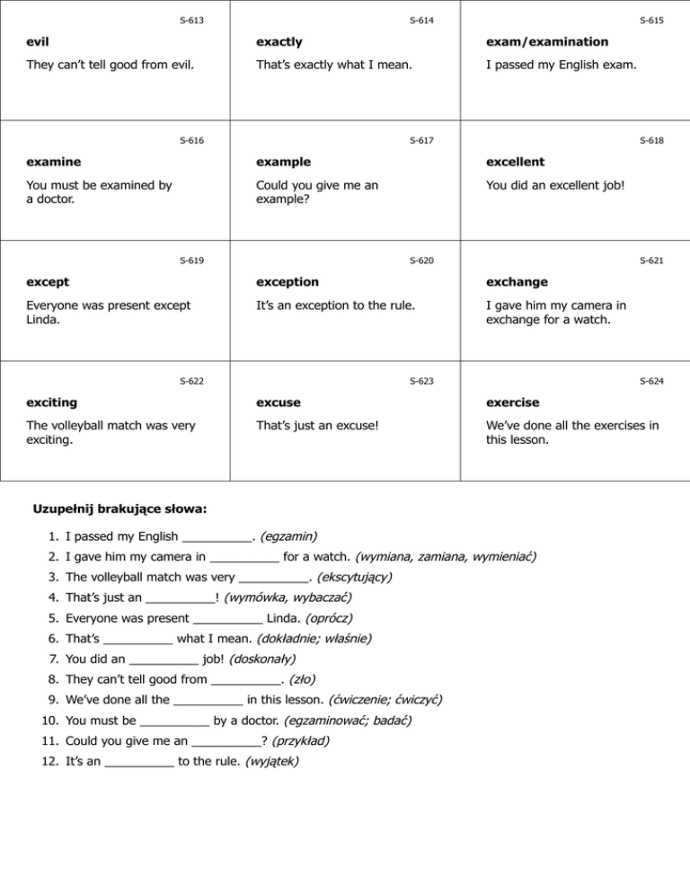 S-613 S-614 S-615 evil exactly exam/examination They can’t tell good from evil. That’s exactly what I mean. I passed my English exam. S-616 S-617 S-618 examine example excellent You must be examined by a doctor. Could you give me an example? You did an excellent job! S-619 S-620 S-621 except exception exchange Everyone was present except Linda. It’s an exception to the rule. I gave him my camera in exchange for a watch. S-622 S-623 S-624 exciting excuse exercise The volleyball match was very exciting. That’s just an excuse! We’ve done all the exercises in this lesson. Uzupełnij brakujące słowa: 1. I passed my English __________. (egzamin) 2. I gave him my camera in __________ for a watch. (wymiana, zamiana, wymieniać) 3. The volleyball match was very __________. (ekscytujący) 4. That’s just an __________! (wymówka, wybaczać) 5. Everyone was present __________ Linda. (oprócz) 6. That’s __________ what I mean. (dokładnie; właśnie) 7. You did an __________ job! (doskonały) 8. They can’t tell good from __________. (zło) 9. We’ve done all the __________ in this lesson. (ćwiczenie; ćwiczyć) 10. You must be __________ by a doctor. (egzaminować; badać) 11. Could you give me an __________? (przykład) 12. It’s an __________ to the rule. (wyjątek) S-615 S-614 S-613 egzamin dokładnie; właśnie zło Zdałem egzamin z angielskiego. Właśnie to mam na myśli. Nie potrafią odróżnić dobra od zła. www.isel.edu.pl www.isel.edu.pl www.isel.edu.pl S-618 S-617 S-616 doskonały przykład egzaminować; badać Wykonałeś doskonałą pracę! Mógłbyś podać mi przykład? Musisz być zbadany przez lekarza. www.isel.edu.pl www.isel.edu.pl www.isel.edu.pl S-621 S-620 S-619 wymiana, zamiana, wymieniać wyjątek oprócz To wyjątek od reguły. Wszyscy byli obecni, oprócz Lindy. Dałem mu aparat w zamian za zegarek. www.isel.edu.pl www.isel.edu.pl www.isel.edu.pl S-624 S-623 S-622 ćwiczenie; ćwiczyć wymówka, wybaczać ekscytujący Zrobiliśmy wszystkie ćwiczenia w tej lekcji. To tylko wymówka! Mecz siatkówki był bardzo ekscytujący. www.isel.edu.pl Odpowiedzi: 1. exam 2. exchange 3. exciting 4. excuse 5. except 6. exactly 7. excellent 8. evil 9. exercises 10. examined 11. example 12. exception www.isel.edu.pl www.isel.edu.pl