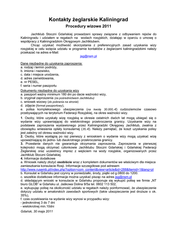 Kontakty żeglarskie Kaliningrad Procedury wizowe 2011 Jachtklub Stoczni Gdańskiej prowadzeni sprawy związane z odbywaniem rejsów do Kaliningradu i udziałem w regatach na wodach rosyjskich, działając w oparciu o umowę o współpracy z Kaliningradzkim Okręgowym Jachtklubem. Chcąc uzyskać możliwość skorzystania z preferencyjnych zasad uzyskania wizy rosyjskiej w celu wzięcia udziału w programie kontaktów z żeglarzami kaliningradzkimi należy przekazać na adres e-Mail: [email protected] Dane niezbędne do uzyskania zaproszenia: a. rodzaj i termin podróży, b. imiona i nazwisko, c. data i miejsce urodzenia, d. adres zameldowania, e. nr PESEL, f. seria i numer paszportu Dokumenty niezbędne do uzyskania wizy a. paszport ważny minimum 180 dni po dacie ważności wizy, b. oryginał zaproszenia (za pośrednictwem Jachtklubu) c. wniosek wizowy (do pobrania na stronie) d. zdjęcie (format paszportowy), e. polisa kompleksowego ubezpieczenia (na kwotę 30.000,-€) cudzoziemców czasowo przebywających na terytorium Federacji Rosyjskiej, na okres ważności wizy. 1. Osoby, które uzyskały wizę rosyjską w okresie ostatnich dwóch lat mogą ubiegać się o wydanie wizy uprawniającej do wielokrotnego przekroczenia granicy. Uzyskanie wizy na podstawie zaproszenia wystawionego przez Kaliningradzki Okręgowy Jachtklub, zwalnia z obowiązku wniesienia opłaty konsularnej (35,-€). Należy pamiętać, że koszt uzyskania polisy jest zależny od okresu ważności wizy. 2. Osoby, które wystąpią po raz pierwszy z wnioskiem o wydanie wizy mogą uzyskać wizę upoważniającą do jedno- lub dwukrotnego przekroczenia granicy. 3. Przesłanie danych nie gwarantuje otrzymania zaproszenia. Zaproszenia w pierwszej kolejności mogą otrzymać członkowie Jachtklubu Stoczni Gdańskiej i Gdańskiej Federacji Żeglarskiej oraz uczestnicy imprez z wejściem na wody rosyjskie, organizowanych przez Jachtklub Stoczni Gdańskiej. 4. Informacje dodatkowe a. Wniosek należy złożyć osobiście wraz z kompletem dokumentów we właściwym dla miejsca zamieszkania konsulacie Rosji. Informacje szczegółowe pod adresem http://www.rusemb.pl/index.php?option=com_content&view=article&id=288&Itemid=1&lang=pl b. Konsulat w Gdańsku jest czynny w poniedziałki, środy, piątki od g.0800 do 1200. c. wszelkie dodatkowe informacje można uzyskać pisząc na adres [email protected] d. składającym wnioski w konsulacie w Gdańsku proponuje się wykupić polisę we firmie „NT biuro GLOB” w Gdańsku ul. Jaśkowa Dolina 9/5a tel. 0602 113 502, e. wykupując polisę na okoliczność udziału w regatach należy poinformować, że ubezpieczenie dotyczy udziału w amatorskich zawodach sportowych (takie ubezpieczenie jest droższe o ok. 35%), f. czas oczekiwania na wydanie wizy wynosi w przypadku wizy: - jednokrotnej 3 do 7 dni - wielokrotnej min.10dni Gdańsk, 30 maja 2011