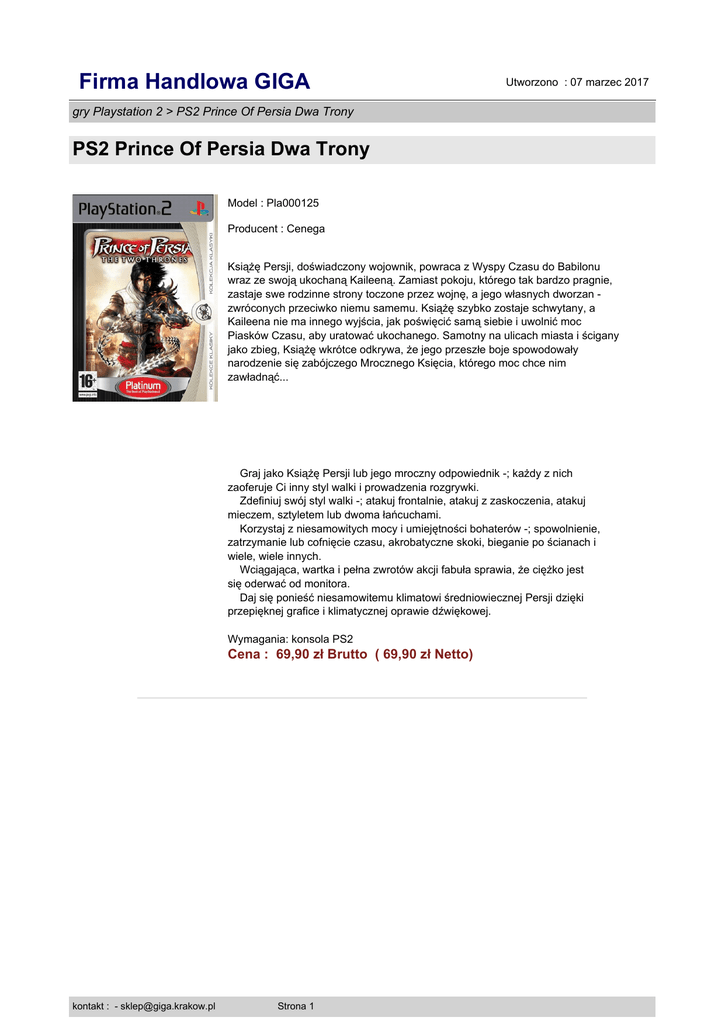 Firma Handlowa GIGA Utworzono : 07 marzec 2017 gry Playstation 2 > PS2 Prince Of Persia Dwa Trony PS2 Prince Of Persia Dwa Trony Model : Pla000125 Producent : Cenega Książę Persji, doświadczony wojownik, powraca z Wyspy Czasu do Babilonu wraz ze swoją ukochaną Kaileeną. Zamiast pokoju, którego tak bardzo pragnie, zastaje swe rodzinne strony toczone przez wojnę, a jego własnych dworzan zwróconych przeciwko niemu samemu. Książę szybko zostaje schwytany, a Kaileena nie ma innego wyjścia, jak poświęcić samą siebie i uwolnić moc Piasków Czasu, aby uratować ukochanego. Samotny na ulicach miasta i ścigany jako zbieg, Książę wkrótce odkrywa, że jego przeszłe boje spowodowały narodzenie się zabójczego Mrocznego Księcia, którego moc chce nim zawładnąć... Graj jako Książę Persji lub jego mroczny odpowiednik -; każdy z nich zaoferuje Ci inny styl walki i prowadzenia rozgrywki. Zdefiniuj swój styl walki -; atakuj frontalnie, atakuj z zaskoczenia, atakuj mieczem, sztyletem lub dwoma łańcuchami. Korzystaj z niesamowitych mocy i umiejętności bohaterów -; spowolnienie, zatrzymanie lub cofnięcie czasu, akrobatyczne skoki, bieganie po ścianach i wiele, wiele innych. Wciągająca, wartka i pełna zwrotów akcji fabuła sprawia, że ciężko jest się oderwać od monitora. Daj się ponieść niesamowitemu klimatowi średniowiecznej Persji dzięki przepięknej grafice i klimatycznej oprawie dźwiękowej. Wymagania: konsola PS2 Cena : 69,90 zł Brutto ( 69,90 zł Netto) kontakt : - [email protected] Strona 1