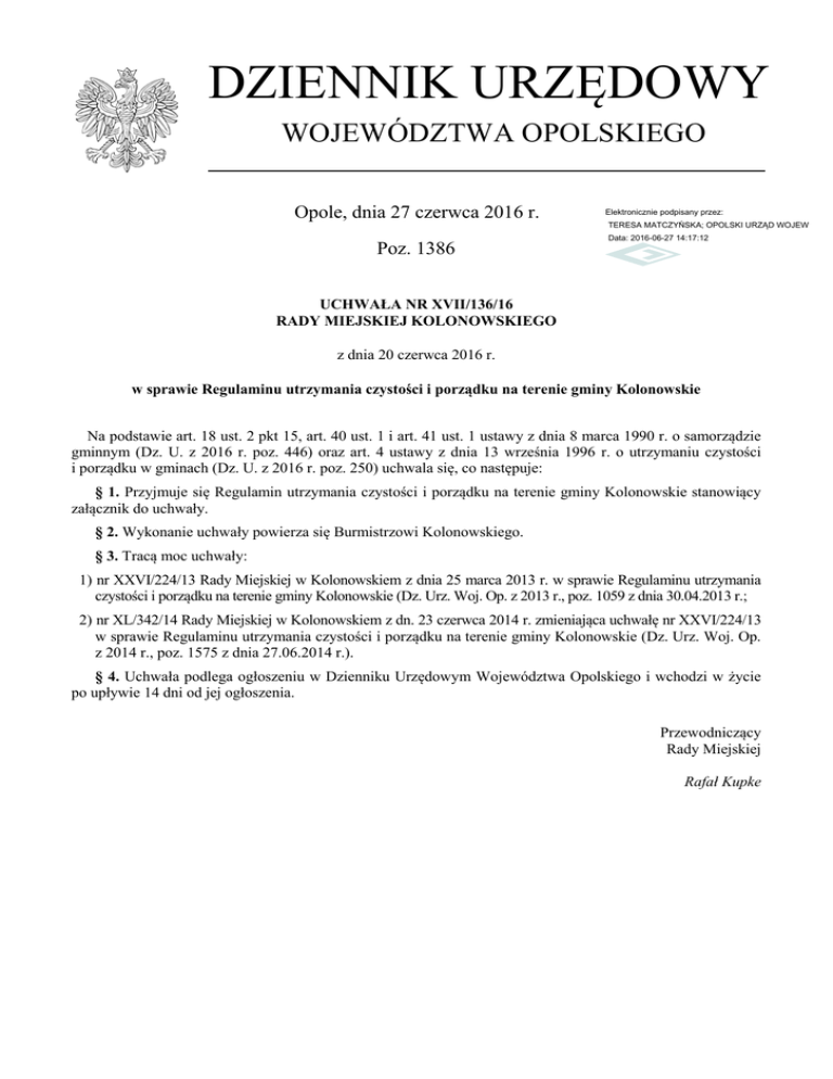 DZIENNIK URZĘDOWY WOJEWÓDZTWA OPOLSKIEGO Opole, dnia 27 czerwca 2016 r. Elektronicznie podpisany przez: TERESA MATCZYŃSKA; OPOLSKI URZĄD WOJEWÓDZKI Poz. 1386 Data: 2016-06-27 14:17:12 UCHWAŁA NR XVII/136/16 RADY MIEJSKIEJ KOLONOWSKIEGO z dnia 20 czerwca 2016 r. w sprawie Regulaminu utrzymania czystości i porządku na terenie gminy Kolonowskie Na podstawie art. 18 ust. 2 pkt 15, art. 40 ust. 1 i art. 41 ust. 1 ustawy z dnia 8 marca 1990 r. o samorządzie gminnym (Dz. U. z 2016 r. poz. 446) oraz art. 4 ustawy z dnia 13 września 1996 r. o utrzymaniu czystości i porządku w gminach (Dz. U. z 2016 r. poz. 250) uchwala się, co następuje: § 1. Przyjmuje się Regulamin utrzymania czystości i porządku na terenie gminy Kolonowskie stanowiący załącznik do uchwały. § 2. Wykonanie uchwały powierza się Burmistrzowi Kolonowskiego. § 3. Tracą moc uchwały: 1) nr XXVI/224/13 Rady Miejskiej w Kolonowskiem z dnia 25 marca 2013 r. w sprawie Regulaminu utrzymania czystości i porządku na terenie gminy Kolonowskie (Dz. Urz. Woj. Op. z 2013 r., poz. 1059 z dnia 30.04.2013 r.; 2) nr XL/342/14 Rady Miejskiej w Kolonowskiem z dn. 23 czerwca 2014 r. zmieniająca uchwałę nr XXVI/224/13 w sprawie Regulaminu utrzymania czystości i porządku na terenie gminy Kolonowskie (Dz. Urz. Woj. Op. z 2014 r., poz. 1575 z dnia 27.06.2014 r.). § 4. Uchwała podlega ogłoszeniu w Dzienniku Urzędowym Województwa Opolskiego i wchodzi w życie po upływie 14 dni od jej ogłoszenia. Przewodniczący Rady Miejskiej Rafał Kupke Dziennik Urzędowy Województwa Opolskiego –2– Poz. 1386 Załącznik do uchwały nr XVII/136/16 Rady Miejskiej Kolonowskiego z dnia 20 czerwca 2016 r. POSTANOWIENIE OGÓLNE § 1. Regulamin ustala szczegółowe zasady utrzymania czystości i porządku na terenie Gminy Kolonowskie z wyłączeniem zadań przekazanych do Związku Międzygminnego „Czysty Region” z siedzibą w KędzierzynieKoźlu. Rozdział 1 Wymagania w zakresie utrzymania czystości i porządku na terenie nieruchomości § 2.1. Właściciele nieruchomości położonych bezpośrednio wzdłuż chodników mają obowiązek uprzątnięcia błota, śniegu, lodu, opadłych liści i innych zanieczyszczeń z części nieruchomości służących do użytku publicznego (chodnik), poprzez gromadzenie ich na skraju chodnika od strony jezdni w taki sposób, aby nie utrudniało to ruchu i nie zagrażało przechodniom i pojazdom oraz istniejącej zieleni, z zachowaniem możliwości odpływu wody do kanalizacji. 2. Lód i śnieg niemożliwy do usunięcia i zalegający wzdłuż chodników położonych na nieruchomości służących do użytku publicznego właściciele nieruchomości mają obowiązek posypać piaskiem lub innym skutecznym środkiem w celu zlikwidowania jego śliskości. 3. Właściciele nieruchomości przeznaczonych do użytku publicznego zapewniają utrzymanie czystości i porządku na częściach tych nieruchomości poprzez wyposażenie miejsc publicznych w odpowiednią liczbę zamocowanych na stałe koszy ulicznych na drobne odpady komunalne, a tych miejsc publicznych, na których dopuszczone jest wyprowadzanie zwierząt domowych, w szczególności psów - w pojemniki do zbierania odchodów zwierząt. 4. Mycie pojazdów samochodowych poza myjniami może odbywać się po spełnieniu łącznie następujących warunków: 1) niezanieczyszczania środowiska i odprowadzania powstających ścieków do kanalizacji sanitarnej lub zbiornika bezodpływowego; 2) dokonywania tych czynności na wydzielonych, utwardzonych częściach nieruchomości oraz przy użyciu środków ulegających biodegradacji; 3) iż mycie dotyczy nadwozia samochodu. 5. Zakazuje się napraw pojazdów samochodowych poza warsztatami naprawczymi, jeżeli naprawy te mogą powodować zagrożenie dla środowiska; zakaz w szczególności dotyczy napraw związanych z wymianą oleju silnikowego, oleju skrzyni biegów, płynów chłodniczych i hamulcowych. 6. Właściciele nieruchomości zobowiązani są do wykaszania terenu nieruchomości, niestanowiących gruntów rolnych, minimum raz w roku, przed zakwitem lub wysiewem chwastów. Rozdział 2 Rodzaje i minimalne pojemności pojemników przeznaczonych do zbierania odpadów komunalnych na drogach publicznych, warunki rozmieszczenia tych pojemników i ich utrzymania w odpowiednim stanie sanitarnym, porządkowym i technicznym § 3.1. Do zbierania odpadów komunalnych zarządca drogi może wykorzystać pojemniki o pojemności 30 l, 35 l, 40 l, 45 l, 50 l, 55 l. 2. W obszarze wiejskim wyznacza się następujące lokalizacje koszy ulicznych oraz ich ilość: 1) Spórok: a) ul. Bolesława Chrobrego nr 26 ÷ 42 - 2 kosze w odległości nie większej niż 250 m, b) ul. Guznera 3 - 1 kosz uliczny (Centrum Odnowy Wsi); Dziennik Urzędowy Województwa Opolskiego –3– Poz. 1386 2) Staniszcze Małe: a) ul. Szkolna 1 - 1 kosz uliczny (przy PSP), b) ul. Myśliwca oznakowane przejście dla pieszych - 1 kosz uliczny (kościół), c) ul. Haupstocka 4 ÷ 14- 1 kosz uliczny; 3) Staniszcze Wielkie: a) ul. Kościelna- 1÷17 - 3 kosze w odległości nie większej niż 180 m. 3. W Kolonowskiem wyznacza się: 1) obszar centralny w obrębie: a) ul. Ks. Czerwionki 1 ÷ 39, b) ul. Leśnej 1 ÷ 10, c) ul. 1 Maja 1 ÷40, d) ul. Szkolnej 1 ÷15, e) ul. Dworcową 1 ÷ 57, w którym kosze uliczne należy ustawić w odległości nie większej niż 250 m od siebie; 2) obszar peryferyjny w obrebie: a) ul. Opolskiej (od skrzyżowania z ul. Arki Bożka do ul. Pluderskiej), b) ul. 1 Maja 40 ÷ 58, w którym kosze należy ustawić co 350 m od siebie. 4. Za stan techniczny, sanitarny i porządkowy koszy ulicznych odpowiadają podmioty zobowiązane do ich ustawienia. 5. Kosze uliczne należy opróżniać z częstotliwością zapewniającą niedopuszczenie do ich przepełnienia, nie rzadziej niż jeden raz na dwa tygodnie. § 4.1. Częstotliwość opróżniania zbiorników bezodpływowych na nieczystości ciekłe powinna uniemożliwiać przepełnien
