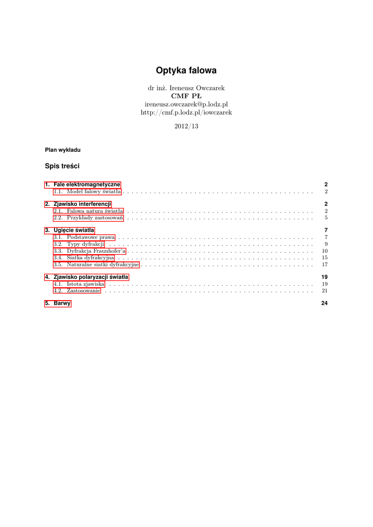 Optyka falowa dr inż. Ireneusz Owczarek CMF PŁ [email protected] http://cmf.p.lodz.pl/iowczarek 2012/13 Plan wykładu Spis treści 1. Fale elektromagnetyczne 1.1. Model falowy światła . . . . . . . . . . . . . . . . . . . . . . . . . . . . . . . . . . . . . . . . . . . 2 2 2. Zjawisko interferencji 2.1. Falowa natura światła . . . . . . . . . . . . . . . . . . . . . . . . . . . . . . . . . . . . . . . . . . 2.2. Przykłady zastosowań . . . . . . . . . . . . . . . . . . . . . . . . . . . . . . . . . . . . . . . . . . 2 2 5 3. Ugiecie ˛ światła 3.1. Podstawowe prawa . . . . . 3.2. Typy dyfrakcji . . . . . . . 3.3. Dyfrakcja Fraunhofer’a . . . 3.4. Siatka dyfrakcyjna . . . . . 3.5. Naturalne siatki dyfrakcyjne . . . . . 7 7 9 10 15 17 4. Zjawisko polaryzacji światła 4.1. Istota zjawiska . . . . . . . . . . . . . . . . . . . . . . . . . . . . . . . . . . . . . . . . . . . . . . 4.2. Zastosowanie . . . . . . . . . . . . . . . . . . . . . . . . . . . . . . . . . . . . . . . . . . . . . . . 19 19 21 5. Barwy 24 . . . . . . . . . . . . . . . . . . . . . . . . . . . . . . . . . . . . . . . . . . . . . . . . . . . . . . . . . . . . . . . . . . . . . . . . . . . . . . . . . . . . . . . . . . . . . . . . . . . . . . . . . . . . . . . . . . . . . . . . . . . . . . . . . . . . . . . . . . . . . . . . . . . . . . . . . . . . . . . . . . . . . . . . . . . . . . . . . . . . . . . . . . . . . . 1. Fale elektromagnetyczne 1.1. Model falowy światła Światło jako fala Optyka falowa to dział optyki, w którym uwzględniona jest falowa natura światła. W ramach optyki falowej badane są takie zjawiska jak: interferencja, dyfrakcja i polaryzacja. Zasada Huygensa Wszystkie punkty czoła fali zachowują się jak punktowe źródła elementarnych kulistych fal wtórnych. Po czasie t nowe położenie czoła fali jest wyznaczone przez powierzchnię styczną do powierzchni fal wtórnych. Fale wtórne wzajemnie ze sobą interferują. Przy przejściu z jednego ośrodka do drugiego częstotliwość fali nie ulega zmianie λ1 v1 = . λ2 v2 Korzystając z zasady Huygensa można wyprowadzić prawo załamania (prawo Snella) λ1 v1 sin Θ1 = = . sin Θ2 λ2 v2 Ponieważ n1 = to c v1 i n2 = c v2 sin Θ1 c n2 = = n21 . sin Θ2 n1 c 2. Zjawisko interferencji 2.1. Falowa natura światła Interferencja Warunkiem zaistnienia stałego w czasie rozkładu przestrzennego amplitudy interferujących fal jest ich spójność. Dwie fale są spójne jeżeli różnią się tylko przebytą drogą optyczną. Jak zbadać spójność światła? Dla dwu lub większej liczby fal należy zbadać ich zdolność do interferencji: • czasowej – zdolność do interferencji dwóch promieni światła wychodzących z tego samego punktu źródła światła w różnych momentach. Jest związana z monochromatycznością źródła światła (np. doświadczenie Younga). Czas spójności wynosi ok. 10−8 s, • przestrzennej – jest wielkością charakteryzującą zgodność między fazami fal emitowanych z różnych punktów rozciągłego źródła światła w danym momencie czasu (np. płytki dzielące światło – Interferometr Michelsona). W przypadku większości źródeł światła obszar spójności przestrzennej nie przekracza rozmiarów pojedynczego atomu. c Ireneusz Owczarek, 2013 2 Pierwszym eksperymentem wskazującym na falowy charakter światła było doświadczenie Thomasa Younga (w 1801 r.). Zakłada się, że światło padające jest monochromatyczne. Oba promienie wychodzące ze szczelin S1 i S2 są zgodne w fazie, gdyż pochodzą z tego samego czoła fali płaskiej. Doświadczenie Younga Oświetlenie w każdym punkcie ekranu jest określone przez różnicę dróg ∆L, jakie przebywają promienie świetlne docierające do tego punktu ∆L = d sin Θ. c Ireneusz Owczarek, 2013 3 Otrzymuje się maksima – jasne prążki d sin Θ = mλ, m = 0, 1, 2... i minima – ciemne prążki d sin Θ = (m + 1 )λ, 2 m = 0, 1, 2.. Jeżeli θ jest małe to odległość między prążkami na obrazie interferencyjnym nie zależy od m; prążki są rozmieszczone równomiernie. Dla każdej długości fali λ powstaną oddzielne układy prążków o różnym odstępie między nimi. Przykład: Obliczyć odległość między sąsiednimi prążkami interferencyjnymi obserwowanymi na ekranie umieszczonym w odległości 1m od dwu szczelin odległych od siebie o 1mm oświetlonych żółtym światłem sodowym o długości λ = 589nm. Dla m = 1 otrzymuje się sin θ = λ 589 · 10−9 m = = 589 · 10−6 , d 10−3 m co daje θ ≈ 0, 003 ◦ . Dla tak małych kątów dobrym przybliżeniem jest sin θ ∼ = tg θ ∼ =θ tg θ = y . D ym = m λD . d Dla m-tego prążka Dlatego odległość między kolejnymi prążkami ∆y = ym+1 − ym = λD 589 · 10−9 m · 1m = = 589 · 10−6 m. d 10−3 m Jeżeli θ jest małe to odległość między prążkami nie zależy od m, prążki są rozmieszczone na ekranie równomiernie. c Ireneusz Owczarek, 2013 4 Doświadczenie Younga – Nateżenie ˛ światła W punkcie P składowe pola zmieniają się w czasie E1 = E0 sinωt oraz E2 = E0 sin(ωt + φ). Pole wypadkowe E = E1 + E2 = 2E0 cos φ 2 · sin(ωt + φ φ ) = EΘ sin(ωt + ). 2 2 Natężenie fali wypadkowej 2 IΘ ∝ EΘ . Iloraz natężeń dwu fal: fali wypadkowej i fali padającej IΘ = I0 EΘ E0 !2 Jeżeli φ jest różnicą faz między falami IΘ = 4I0 · cos2 φ . 2 różnica faz różnica dróg = , 2π λ ϕ d sin θ = , 2π λ π ϕ=2 d sin θ . λ Niezależnie, czy do ekranu dociera światło ze źródeł spójnych, czy też nie, średnie natężenie musi być zawsze takie samo Isr = 2I0 . 2.2. Przykłady zastosowań Interferencja w cienkich warstwach Warunek na maksimum 2t · n2 = m + 1 λ 2 m = 0, 1, 2... Warunek na minimum 2t · n2 = mλ m = 0, 1, 2.... c Ireneusz Owczarek, 2013 5 Przykład: Bańka mydlana (n = 1, 33) znajdująca się w powietrzu ma grubość 320nm. Jaki kolor ma światło odbite, gdy błonka jest oświetlona światłem bia