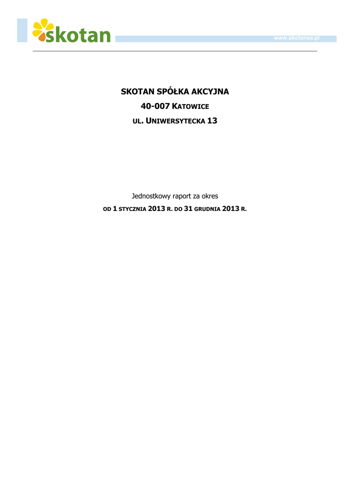 www.skotansa.pl SKOTAN SPÓŁKA AKCYJNA 40-007 KATOWICE UL. UNIWERSYTECKA 13 Jednostkowy raport za okres OD 1 STYCZNIA 2013 R. DO 31 GRUDNIA 2013 R. SPIS TREŚCI JEDNOSTKOWY RAPORT ZA ROK 2013 ZAWIERA: A. WSTĘP B. LIST DO AKCJONARIUSZY C. WYBRANE DANE FINANSOWE D. SPRAWOZDANIE ZARZĄDU Z DZIAŁALNOŚCI "SKOTAN" S.A. W ROKU 2013 E. OŚWIADCZENIE O STOSOWANIU ZASAD ŁADU KORPORACYJNEGO W 2013 ROKU JEDNOSTKOWE SPRAWOZDANIE FINANSOWE F. WPROWADZENIE DO SPRAWOZDANIA FINANSOWEGO G. DODATKOWE INFORMACJE I OBJAŚNIENIA DO SPRAWOZDANIA FINANSOWEGO H. JEDNOSTKOWY BILANS I. JEDNOSTKOWY RACHUNEK ZYSKÓW I STRAT J. JEDNOSTKOWE ZESTAWIENIE ZMIAN W KAPITALE WŁASNYM K. JEDNOSTKOWY RACHUNEK PRZEPŁYWÓW PIENIĘŻNYCH L. INFORMACJA DODATKOWA ORAZ DODATKOWE NOTY OBJAŚNIAJĄCE OŚWIADCZENIA ZARZĄDU M. OŚWIADCZENIE ZARZĄDU W SPRAWIE PODMIOTU UPRAWNIONEGO DO BADANIA SPRAWOZDANIA FINANSOWEGO N. OSWIADCZENIE ZARZĄDU W SPRAWIE RZETELNOŚCI SPORZĄDZANIA SPRAWOZDANIA FINANSOWEGO O. OŚWIADCZENIE ZARZĄDU DLA BIEGŁYCH REWIDENTÓW. 1 www.skotansa.pl A. WSTĘP. SKOTAN S.A. (zwany dalej Spółką, Emitentem lub SKOTAN) jest spółką giełdową z wieloletnią tradycją. Spółka powstała w wyniku przekształcenia przedsiębiorstwa państwowego Zakłady Garbarskie Skotan w Skoczowie, a jej założycielem był Skarb Państwa. W styczniu 2006 r. Spółka zmieniła profil działalności rozpoczynając handel i produkcję w sektorze paliwowym. Średnioterminowym celem strategicznym spółki było uzyskanie i utrzymanie pozycji lidera w produkcji i sprzedaży biopaliw w Polsce. Na przestrzeni 2006 i 2007 r. przedmiotem obrotu Spółki były również paliwa konwencjonalne, takie jak olej napędowy i benzyny silnikowe. W ramach realizacji powyższych celów SKOTAN rozpoczął przygotowanie inwestycji budowy instalacji do produkcji biokomponentów jakimi są estry metylowe kwasów tłuszczowych (FAME). Pomimo pełnego zaangażowania w realizację projektu i celów wyznaczonych w 2006 r. z uwagi na niekorzystne dla producentów biopaliw zmiany w przepisach akcyzowych w 2007 r. oraz przedłużający się okres braku środowiska prawnego dla rozwoju i prowadzenia rentownej działalności w zakresie produkcji i dystrybucji biopaliw, w lipcu 2009 r. Walne Zgromadzenie Spółki zadecydowało o zmianie strategii Spółki i odstąpieniu od realizacji celów Spółki w zakresie biopaliw I generacji. Obecnie SKOTAN prowadzi działalność badawczo – rozwojową w obszarze biotechnologii, dodatków żywieniowych, żywności funkcjonalnej i innowacyjnych procesów technologicznych. B. LIST DO AKCJONARIUSZY Szanowni Państwo, Zarząd SKOTAN S.A. przedstawia niniejszym jednostkowy raport roczny Spółki za rok obrotowy 2013. Rok 2013 był okresem kontynuowania realizacji strategii średniookresowej Skotan S.A., skoncentrowanej na rozwoju innowacyjnych projektów badawczo – rozwojowych, na które Spółka otrzymała dofinansowanie. Spółka kontynuowała także prace w zakresie dalszej restrukturyzacji aktywów niezwiązanych z działalnością naukowo-badawczą oraz poszukiwania nowych projektów z zakresu nowoczesnych technologii. Podsumowując kolejny rok działalności wskazać należy konsekwentną realizację strategii pozyskiwania środków pomocowych na nowe projekty badawczo – naukowe oraz dynamiczny rozwój projektu związanego z powstaniem kolejnej instalacji pilotażowej Spółki, tym razem związanej z wykorzystaniem energetycznych gazów odpadowych. Podobnie jak w latach poprzednich, wypracowany wynik działalności Spółki stanowi wypadkową znacznych nakładów na działalność badawczo – rozwojową, zmian wartości posiadanych aktywów finansowych i wyniku na rozpoczętej działalności operacyjnej i nie odzwierciedla potencjalnej skali działalności Spółki w długim okresie ani nie wyznacza długoterminowych trendów. Zaznaczyć należy jednak skalę planowanych na lata 2014 – 2015 nakładów inwestycyjnych związanych z realizowanymi projektami i uzależnienie kształtowania wyniku operacyjnego działalności od efektów podjętych działań w zakresie budowania rynku na nowe i innowacyjne produkty Spółki. Trwające budowanie tego rynku oraz długoterminowa kontraktacja pozwolić powinny na wdrożenia i zyskowną eksploatację wdrożeń produktowych lub technologicznych wypracowanych na poziomie poszczególnych projektów. Rok 2013 przyniósł kilka kluczowych decyzji Instytucji Finansujących w zakresie współfinansowania kolejnych dużych projektów badawczo – naukowych Spółki. Ich ostateczna skala oraz plany dotyczące nowych projektów pozwoliły Zarządowi na skierowanie w 2013 roku pod obrady Walnego Zgromadzenia wniosku o podwyższenie kapitału zakładowego Spółki. Niepowodzenie przedmiotowej emisji wywołało konieczność rewizji długoterminowych planów rozwoju Spółki oraz zmniejszenia akcji akwizycyjnej w obszarze pozyskiwania finansowania nowych projektów. Żywiąc nadzieję, iż prowadzone działania w zakresie rozwoju dalszych projektów innowacyjnych jak i inne prace związane z poszukiwaniem źródeł finansowania rozwoju nowych projektów inwestycyjnych z zakresu innowacyjnych technologii pozwolą na długotrwały, rentowny i wielokierunkowy rozwój Spółki i Grupy Kapitałowej SKOTAN, Pozostajemy z poważaniem, Wojciech Sobczak Wiceprezes Zarządu Marek Pawełczak Prezes Zarządu 3 C. WYBRANE DANE FINANSOWE WYBRANE DANE FINANSOWE [TYS.] PLN 2013 Przychody netto ze sprzedaży produktów, towarów i materiałów EUR 2012 2013 2012 1 728 0 410 0 Zysk (strata) z działalności operacyjnej -3 986 -10 928 -947 -2 618 Zysk (strata) brutto -3 766 -7 886 -894 -1 889 434 -7 832 103 -1 877 Zysk (strata) netto Przepływy pieniężne netto z działalności operacyjnej 14 238 -6 792 3 381 -1 627 -28 129 4 925 -6 680 1 180 16 703 6 766 3 967 1 621 2 812 4 898 668 1 174 Aktywa, razem 99 227 61 092 23 926 14 943 Zobowiązania i rezerwy na zobowiązania 3 588 Przepływy pieniężne n