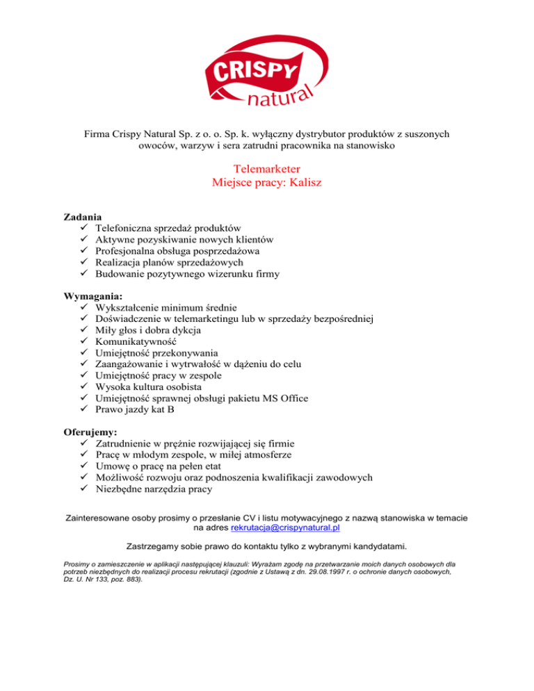 Firma Crispy Natural Sp. z o. o. Sp. k. wyłączny dystrybutor produktów z suszonych owoców, warzyw i sera zatrudni pracownika na stanowisko Telemarketer Miejsce pracy: Kalisz Zadania Telefoniczna sprzedaż produktów Aktywne pozyskiwanie nowych klientów Profesjonalna obsługa posprzedażowa Realizacja planów sprzedażowych Budowanie pozytywnego wizerunku firmy Wymagania: Wykształcenie minimum średnie Doświadczenie w telemarketingu lub w sprzedaży bezpośredniej Miły głos i dobra dykcja Komunikatywność Umiejętność przekonywania Zaangażowanie i wytrwałość w dążeniu do celu Umiejętność pracy w zespole Wysoka kultura osobista Umiejętność sprawnej obsługi pakietu MS Office Prawo jazdy kat B Oferujemy: Zatrudnienie w prężnie rozwijającej się firmie Pracę w młodym zespole, w miłej atmosferze Umowę o pracę na pełen etat Możliwość rozwoju oraz podnoszenia kwalifikacji zawodowych Niezbędne narzędzia pracy Zainteresowane osoby prosimy o przesłanie CV i listu motywacyjnego z nazwą stanowiska w temacie na adres [email protected] Zastrzegamy sobie prawo do kontaktu tylko z wybranymi kandydatami. Prosimy o zamieszczenie w aplikacji następującej klauzuli: Wyrażam zgodę na przetwarzanie moich danych osobowych dla potrzeb niezbędnych do realizacji procesu rekrutacji (zgodnie z Ustawą z dn. 29.08.1997 r. o ochronie danych osobowych, Dz. U. Nr 133, poz. 883).