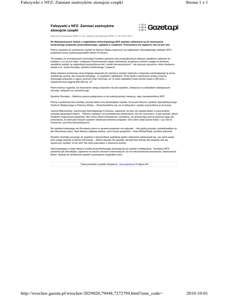 Fałszywki z NFZ: Zamiast zastrzyków stosujcie czopki Strona 1 z 1 Fałszywki z NFZ: Zamiast zastrzyków stosujcie czopki Marzena Kasperska 2009-11-20, ostatnia aktualizacja 2009-11-19 19:01:05.0 W sfabrykowanych listach z nagłówkiem dolnośląskiego NFZ szpitale nakłaniane są do stosowania konkretnego preparatu przeciwbólowego, najlepiej w czopkach. Prokuratura ma wyjaśnić, kto za tym stoi Pisma rozsyłane do dyrektorów szpitali na Dolnym Śląsku opatrzone są nagłówkiem dolnośląskiego oddziału NFZ i podpisane przez wydział gospodarki lekiem Funduszu. "W związku ze zmniejszonymi dochodami budŜetu państwa oraz przewidywanym dalszym spadkiem wpływów do budŜetu, a co za tym idzie, mniejszym finansowaniem opieki zdrowotnej, pragniemy zwrócić uwagę na strukturę wydatków szpitali na najbardziej kosztochłonne leki i środki farmaceutyczne" - tak zaczyna się pismo, które niedawno dostał m.in. Jacek Domejko, dyrektor świdnickiego "Latawca". Dalej nadawca porównuje cenę drogiego preparatu [tu nazwa] w postaci zastrzyku i preparatu zawierającego tę samą substancję czynną, ale znacznie tańszego - w czopkach i tabletkach. Prosi takŜe o wykonanie analizy zuŜycia droŜszego preparatu w ujęciu rocznym oraz informuje, Ŝe "w wielu szpitalach koszt wzrósł nawet o 300 proc. i niejednokrotnie sięgnął 200-300 tys. zł". Pismo kończy sugestia, Ŝe stosowanie owego preparatu nie jest zasadne, zwłaszcza na oddziałach zabiegowych: chirurgii, ortopedii czy neurochirurgii. Dyrektor Domejko: - Mieliśmy pewne podejrzenia co do autentyczności nadawcy, więc zawiadomiliśmy NFZ. Pisma o podobnej treści dostały równieŜ takŜe inne dolnośląskie szpitale. Krzysztof Wywrot, dyrektor Specjalistycznego Centrum Medycznego w Polanicy-Zdroju: - Zorientowaliśmy się, Ŝe to fałszywka i szybko wyrzuciliśmy je do kosza. Joanna Mierzwińska, rzeczniczka dolnośląskiego Funduszu, zapewnia, Ŝe listu nie napisał Ŝaden z pracowników wydziału gospodarki lekami. - Płacimy szpitalom za kompleksowe świadczenia, ale nie narzucamy, w jaki sposób i jakimi środkami mają leczyć pacjentów. Nie mamy takich kompetencji. Uznaliśmy, Ŝe sprawą tego pisma powinna zająć się prokuratura, bo ktoś pod naszym szyldem reklamuje konkretny preparat. Ona niech ustali autora listów - czy robi to hurtownia, czy firma farmaceutyczna. Do szpitala kolejowego we Wrocławiu pismo w sprawie preparatu nie wpłynęło. - Ale gdyby przyszło, potraktowałbym je jak internetowy spam. Nasi lekarze najlepiej wiedzą, czym leczyć pacjentów - mówi Michał Rataj, dyrektor placówki. Dyrektor Domejko przyznał, Ŝe wspólnie z kierownikiem szpitalnej apteki i lekarzami zastanawiał się, czy warto wziąć pod uwagę zawarte w piśmie informacje. - śadne decyzje nie zapadły, ale jeśli bez szkody dla pacjenta uda się ograniczyć wydatki, to kto wie? Na razie poprosiłem o stosowne analizy. Wprowadzające w błąd reklamy środka przeciwbólowego docierają teŜ do szpitali w Małopolsce. Tamtejszy NFZ, podobnie jak dolnośląski, zapewnia na swoich stronach internetowych, Ŝe nie rekomendował stosowania i dawkowania leków. Apeluje do dyrektorów szpitali o przesyłanie oryginałów pism. Tekst pochodzi z portalu Gazeta.pl - www.gazeta.pl © Agora SA http://wroclaw.gazeta.pl/wroclaw/2029020,79448,7272794.html?sms_code= 2010-10-01
