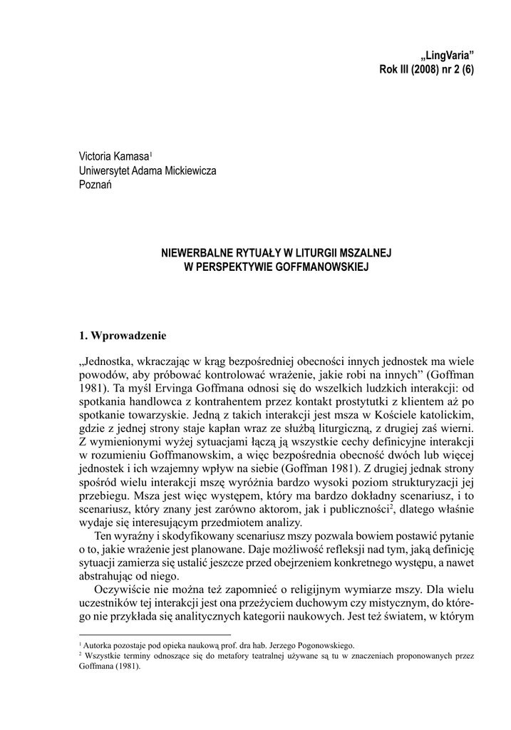 „LingVaria” Rok III (2008) nr 2 (6) Victoria Kamasa1 Uniwersytet Adama Mickiewicza Poznań NIEWERBALNE RYTUAŁY W LITURGII MSZALNEJ W PERSPEKTYWIE GOFFMANOWSKIEJ 1. Wprowadzenie „Jednostka, wkraczając w krąg bezpośredniej obecności innych jednostek ma wiele powodów, aby próbować kontrolować wrażenie, jakie robi na innych” (Goffman 1981). Ta myśl Ervinga Goffmana odnosi się do wszelkich ludzkich interakcji: od spotkania handlowca z kontrahentem przez kontakt prostytutki z klientem aż po spotkanie towarzyskie. Jedną z takich interakcji jest msza w Kościele katolickim, gdzie z jednej strony staje kapłan wraz ze służbą liturgiczną, z drugiej zaś wierni. Z wymienionymi wyżej sytuacjami łączą ją wszystkie cechy definicyjne interakcji w rozumieniu Goffmanowskim, a więc bezpośrednia obecność dwóch lub więcej jednostek i ich wzajemny wpływ na siebie (Goffman 1981). Z drugiej jednak strony spośród wielu interakcji mszę wyróżnia bardzo wysoki poziom strukturyzacji jej przebiegu. Msza jest więc występem, który ma bardzo dokładny scenariusz, i to scenariusz, który znany jest zarówno aktorom, jak i publiczności2, dlatego właśnie wydaje się interesującym przedmiotem analizy. Ten wyraźny i skodyfikowany scenariusz mszy pozwala bowiem postawić pytanie o to, jakie wrażenie jest planowane. Daje możliwość refleksji nad tym, jaką definicję sytuacji zamierza się ustalić jeszcze przed obejrzeniem konkretnego występu, a nawet abstrahując od niego. Oczywiście nie można też zapomnieć o religijnym wymiarze mszy. Dla wielu uczestników tej interakcji jest ona przeżyciem duchowym czy mistycznym, do którego nie przykłada się analitycznych kategorii naukowych. Jest też światem, w którym Autorka pozostaje pod opieka naukową prof. dra hab. Jerzego Pogonowskiego. Wszystkie terminy odnoszące się do metafory teatralnej używane są tu w znaczeniach proponowanych przez Goffmana (1981). 1 2 148 VICTORIA KAMASA obowiązują znaczenia charakterystyczne i zarezerwowane tylko dla niego. Jak zauważa Rafał Garpiel: Skoro kultywujący daną religię przypisują autorstwo przekazów religijnych bądź istocie nadprzyrodzonej, bądź osobie ludzkiej inspirowanej przez Absolut, nie sposób – uwzględniając owo założenie – doszukiwać się w owych przekazach czegoś tak przyziemnego i charakterystycznego dla zwykłych relacji międzyludzkich jak perswazja (Garpiel 2003) czy jak wysiłki nastawione na zachowanie ciągłości i spójności przedstawienia. Czy to jednak uniemożliwia analizę mszy za pomocą kategorii stosowanych do innych interakcji? Zasadne wydaje się uznać, że nie. Przede wszystkim dlatego, że związek z duchowością czy mistycyzmem nie może stanowić bariery dla badania danego zjawiska w innych kategoriach, ale również dlatego, że uczestnicy tej specyficznej interakcji są zakorzenieni w pewnym szerszym kontekście kulturowymi i interpretacyjnym, którego nie sposób wyłączyć po przekroczeniu progu kościoła. We wstępie do swojej książki Człowiek w teatrze życia codziennego Goffman pisze: „W tym studium będę się przede wszystkim zajmować […] komunikowaniem się bardziej teatralnym i kontekstowym, niewerbalnym” (Goffman 1981). Idąc za jego sugestią, również w tym artykule skupiono się na analizie niewerbalnych aspektów przedstawienia, za jakie uznana została msza. Analiza ta ma koncentrować się wokół pytania o to, jaka jest treść wrażenia, które zespół z kapłanem na czele stara się wywrzeć na publiczności (na wiernych); jakie wrażenie mają kreować opisane w mszale gesty i inne niewerbalne zachowania. Przy czym analiza ta nie ma dotyczyć konkretnego wykonania, jakieś jednej czy wielu zarejestrowanych mszy, ale tego, co narzucone jest przez samą strukturę mszy, której opis znajduje się w mszale rzymskim i innych dokumentach kościelnych. 2. Dwie perspektywy interpretacyjne Z horyzontu możliwych znaczeń, jakie przed interpretującym rozpościera tekst (gest), aktualizowane jest to, które jest sensowne w danym modelu kultury i da się powiązać z doświadczeniem (Brocki 2001). Wydaje się, że wobec gestów liturgicznych jest możliwe aktualizowanie dwóch rodzajów znaczeń. Po pierwsze tych związanych z bezpośrednim kontekstem ich występowania, a więc ze mszą. Tego rodzaju interpretacji w sposób systematyczny dostarcza teologia, a konkretnie liturgika. Drugi rodzaj znaczeń związany jest z szerszym kontekstem kulturowym, ze znaczeniem, jakie gestom wykonywanym przez kapłana i wiernych można przypisać poza kościołem. W ich interpretacji pomocne są analizy związane z mową ciała, czy szerzej – z komunikacją niewerbalną. Korzystając z tej podwójnej ramy interpretacyjnej, podjęto próbę odpowiedzi na pytanie, jakie wrażenie ma wywierać ten występ na publiczności zgromadzonej w kościele. NIEWERBALNE RYTUAŁY W LITURGII MSZALNEJ W PERSPEKTYWIE GOFFMANOWSKIEJ 149 2.1. Obrzędy wstępne Po przybyciu do ołtarza kapłan i usługujący oddają mu należną cześć przez głęboki pokłon (Mszał 1986). Pierwszy więc z gestów możliwych do zaobserwowania podczas liturgii i wykonywanych przez zespół aktorów to głęboki ukłon kierowany w stronę ołtarza. Symbolika liturgiczna przypisuje mu następujące znaczenie: Pokłon jest znakiem głębokiego szacunku i uwielbienia, choć wyraża również usposobienie pokutne, kiedy wiąże się z uświadomieniem sobie grzeszności (Malak 2006). Z kolei w tradycji antropologicznej gestom tego typu przypisuje się następującą funkcję: „Mają one na celu pomniejszenie swojej sylwetki poprzez pochylenie głowy, zgięcie karku, przygięcie całej postaci” (Brocki 2001), Desmond Morris (1994) zaś zauważa, że podstawowym znaczeniem tego gestu jest oddanie szacunku, które łączy się z jedną ze starożytnych form „obniżania ciała” związanego z podporządkowaniem (Morris 1994). W tym wypadku wida