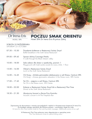 POCZUJ SMAK ORIENTU Hotel SPA Dr Irena Eris Krynica Zdrój SOBOTA 25 PAŹDZIERNIKA SATURDAY 25 OCTOBER 07.30 – 10.30 Śniadanie bufetowe w Restauracji Szósty Zmysł Buffet breakfast in the Sixth Sense Restaurant 09.00 – 09.45 Spacer doliną Czarnego Potoku A walk through the Black Stream valley 10.00 – 18.00 Sala zabaw dla dzieci z opiekunką, poziom -1 Playground with hotel auntie awaits for every child, -1 floor 13.00 – 16.00 Obiad w Restauracji Szósty Zmysł Lunch at the Sixth Sense Restaurant 16.00 – 16.45 Chi Kung – chińska gimnastyka relaksacyjna w sali fitness, Centrum SPA Chi Kung – chinese gymnastics relaxation in the fitness room, SPA Centre 17.00 – 17.45 Tai Chi – zajęcia w sali fitness, Centrum SPA Tai Chi in the fitness room, SPA Centre 18.00 – 22.00 Kolacja w Restauracji Szósty Zmysł lub w Restauracji Thai Time Dinner at the Sixth Sense Restaurant 18.30 – 21.30 Akustyczny koncert w Barze Przy Kominku Acoustic concert in At The Fireplace Bar Zapraszamy do skorzystania z masaży ajurwedyjskich i tajskich w Kosmetycznym Instytucie Dr Irena Eris. Do każdego zabiegu specjalnie dla Państwa prezent – nawilżający olejek do ciała. Dr Irena Eris Skin Care Institute invites for Thai and Ayurvedic massages. Additionally aroma oil as a gift. W Restauracji Thai Time polecamy menu degustacyjne w specjalnej cenie. Thai Time Restaurant invites for special tasting menu.