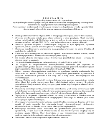 R E G U L A M I N Niniejszy Regulamin ma na celu zapewnienie spokoju i bezpieczeństwa pobytu naszych Klientów w związku z czym prosimy o szczegółowe zapoznanie się z jego postanowieniami i ich przestrzeganie. Przypominamy, że obowiązek przestrzegania postanowień Regulaminu wynika wprost z OWU stanowiących załącznik do umowy najmu zawieranej przez Klientów. • • • • • • • • • • • • • • • Doba apartamentowa trwa od godz.15.00 w dniu przyjazdu do godz.12.00 w dniu wyjazdu. Życzenie przedłużenia pobytu, poza okres wskazany w dniu przybycia, Klient powinien zgłosić najpóźniej do godz.10.00 dnia, w którym upływa termin najmu apartamentu pod numerem telefonu: +48 600 25 88 25. Życzenia będą realizowane w miarę możliwości. Wszelkie życzenia związane z dodatkowymi usługami, w tym: sprzątanie, wymiana ręczników, zmiana pościeli prosimy zgłaszać w dniu przyjazdu. Osoby nie zameldowane w apartamencie mogą przebywać w nim i na terenie Obiektu od godz.7.00 do godz.22.00. Klient nie może udostępniać w jakikolwiek sposób apartamentu osobom trzecim, nawet jeśli nie upłynął okres, za który uiścił należną za pobyt opłatę. Na terenie Obiektu obowiązuje zakaz dokonywania jakichkolwiek zmian – dotyczy to również zmian w aranżacji. Na terenie Obiektu obowiązuje zachowanie ciszy od godz.22.00 do godz.7.00. Ze względu na bezpieczeństwo przeciwpożarowe zabronione jest używanie w apartamentach grzałek, żelazek i wszelkiego rodzaju urządzeń gazowych nie stanowiących jego wyposażenia. Obowiązuje również całkowity ZAKAZ PALENIA. Klienci ponoszą odpowiedzialność materialną za wszelkiego rodzaju uszkodzenia lub zniszczenia na terenie Obiektu, w tym w szczególności przedmiotów wyposażenia i urządzeń technicznych powstałe z ich winy lub z winy osób towarzyszących lub odwiedzających. Obsługa Obiektu może odmówić przyjęcia Klienta, który podczas poprzedniego pobytu (jako Klient lub osoba towarzysząca bądź odwiedzająca) rażąco naruszył Regulamin wyrządzając szkody w mieniu lub wykazując agresję wobec innych użytkowników Obiektu, bądź personelu. Przedmioty osobistego użytku, pozostawione przez Klienta i/lub osoby towarzyszące bądź odwiedzające w apartamencie, będą odsyłane na adres przez niego wskazany. W przypadku braku takiej dyspozycji przechowywane będą do 3 miesięcy licząc od dnia wyjazdu. Wynajmujący nie ponosi odpowiedzialności za rzeczy pozostawione w Obiekcie oraz za uszkodzenie lub utratę samochodu lub innego pojazdu należącego do Klienta i/lub osoby towarzyszącej bądź odwiedzającej. Ze względów bezpieczeństwa nie wolno na terenie Obiektu pozostawiać dzieci do lat 13 bez opieki. W razie wypadku lub zaistnienia innych nieprzewidzianych okoliczności, odpowiedzialność za dziecko ponosi osoba, z którą dziecko przyjechało. Obowiązuje całkowity zakaz wnoszenia do apartamentów jakichkolwiek sprzętów sportowych, w tym także nart. Pomieszczenie do ich przechowywania znajduje się na poziomie garażu Obiektu. Chęć skorzystania z tego pomieszczenia prosimy zgłaszać podczas załatwiania formalności związanych z zakwaterowaniem. Na terenie Obiektu obowiązuje zakaz wprowadzania zwierząt. • • Ewentualne usterki prosimy niezwłocznie zgłaszać pod nr telefonu: pomoc techniczna +48 510 334 132 lub +48 600 25 88 25. W przypadku stwierdzenia, że dana usterka powstała z winy Klienta i/lub osoby towarzyszącej bądź odwiedzającej, Klient zostanie obciążony wszelkimi kosztami związanymi z jej usunięciem. Klient bezpośrednio po przyjeździe zobowiązany jest sprawdzić stan techniczny apartamentu i zgłosić Wynajmującemu wszelkie zastrzeżenia w tym zakresie pod rygorem uznania, że ewentualne usterki powstały w czasie pobytu Klienta. Skargi, reklamacje, uwagi oraz propozycje dotyczące poprawy warunków można zgłaszać do Dyrekcji JUST sp. z o.o. Apartamenty Convallis, pod numerem tel. +48 600 922 039.