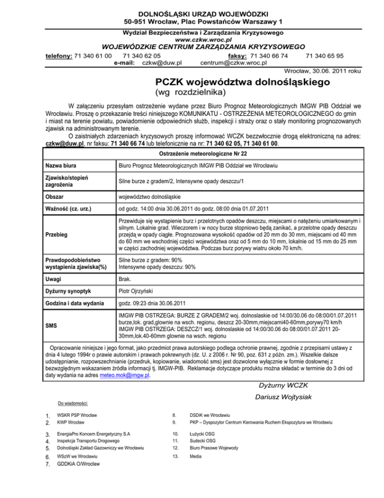 DOLNOŚLĄSKI URZĄD WOJEWÓDZKI 50-951 Wrocław, Plac Powstańców Warszawy 1 Wydział Bezpieczeństwa i Zarządzania Kryzysowego www.czkw.wroc.pl WOJEWÓDZKIE CENTRUM ZARZĄDZANIA KRYZYSOWEGO telefony: 71 340 61 00 71 340 62 05 e-mail: [email protected] faksy: 71 340 66 74 71 340 65 95 [email protected] Wrocław, 30.06. 2011 roku PCZK województwa dolnośląskiego (wg rozdzielnika) W załączeniu przesyłam ostrzeżenie wydane przez Biuro Prognoz Meteorologicznych IMGW PIB Oddział we Wrocławiu. Proszę o przekazanie treści niniejszego KOMUNIKATU - OSTRZEŻENIA METEOROLOGICZNEGO do gmin i miast na terenie powiatu, powiadomienie odpowiednich służb, inspekcji i straży oraz o stały monitoring prognozowanych zjawisk na administrowanym terenie. O zaistniałych zdarzeniach kryzysowych proszę informować WCZK bezzwłocznie drogą elektroniczną na adres: [email protected], nr faksu: 71 340 66 74 lub telefonicznie na nr: 71 340 62 05, 71 340 61 00. Ostrzeżenie meteorologiczne Nr 22 Nazwa biura Biuro Prognoz Meteorologicznych IMGW PIB Oddział we Wrocławiu Zjawisko/stopień zagrożenia Silne burze z gradem/2, Intensywne opady deszczu/1 Obszar województwo dolnośląskie Ważność (cz. urz.) od godz. 14:00 dnia 30.06.2011 do godz. 08:00 dnia 01.07.2011 Przebieg Przewiduje się wystąpienie burz i przelotnych opadów deszczu, miejscami o natężeniu umiarkowanym i silnym. Lokalnie grad. Wieczorem i w nocy burze stopniowo będą zanikać, a przelotne opady deszczu przejdą w opady ciągłe. Prognozowana wysokość opadów od 20 mm do 30 mm, miejscami od 40 mm do 60 mm we wschodniej części województwa oraz od 5 mm do 10 mm, lokalnie od 15 mm do 25 mm w części zachodniej województwa. Podczas burz porywy wiatru około 70 km/h. Prawdopodobieństwo wystąpienia zjawiska(%) Silne burze z gradem: 90% Intensywne opady deszczu: 90% Uwagi Brak. Dyżurny synoptyk Piotr Ojrzyński Godzina i data wydania godz. 09:23 dnia 30.06.2011 SMS IMGW PIB OSTRZEGA: BURZE Z GRADEM/2 woj. dolnoslaskie od 14:00/30.06 do 08:00/01.07.2011 burze,lok. grad,glownie na wsch. regionu, deszcz 20-30mm,miejscami40-60mm,porywy70 km/h IMGW PIB OSTRZEGA: DESZCZ/1 woj. dolnoslaskie od 14:00/30.06 do 08:00/01.07.2011 2030mm,lok.40-60mm glownie na wsch. regionu Opracowanie niniejsze i jego format, jako przedmiot prawa autorskiego podlega ochronie prawnej, zgodnie z przepisami ustawy z dnia 4 lutego 1994r o prawie autorskim i prawach pokrewnych (dz. U. z 2006 r. Nr 90, poz. 631 z późn. zm.). Wszelkie dalsze udostępnianie, rozpowszechnianie (przedruk, kopiowanie, wiadomość sms) jest dozwolone wyłącznie w formie dosłownej z bezwzględnym wskazaniem źródła informacji tj. IMGW-PIB. Reklamacje dotyczące produktu można składać w terminie do 3 dni od daty wydania na adres [email protected]. Dyżurny WCZK Dariusz Wojtysiak Do wiadomości: 1. 2. WSKR PSP Wrocław KWP Wrocław 8. 9. DSDiK we Wrocławiu PKP – Dyspozytor Centrum Kierowania Ruchem Ekspozytura we Wrocławiu 3. 4. 5. 6. 7. EnergiaPro Koncern Energetyczny S.A Inspekcja Transportu Drogowego Dolnośląski Zakład Gazowniczy we Wrocławiu 10. 11. 12. Łużycki OSG Sudecki OSG Biuro Prasowe Wojewody WSzW we Wrocławiu 13. Media GDDKiA O/Wrocław