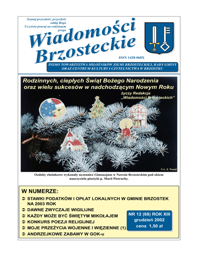 i c ś o m o d a Wi steckie o z r B Szanuj przeszłość, przyszłość oddaj Bogu Uczciwie pracuj na rodzinnym progu ISSN 1428-068X PISMO TOWARZYSTWA MIŁOŚNIKÓW ZIEMI BRZOSTECKIEJ, RADY GMINY ORAZ CENTRUM KULTURY I CZYTELNICTWA W BRZOSTKU Rodzinnych, ciepłych Świąt Bożego Narodzenia oraz wielu sukcesów w nadchodzącym Nowym Roku życzy Redakcja „Wiadomości Brzosteckich” Fot. J. Nosal Ozdoby choinkowe wykonały uczennice Gimnazjum w Nawsiu Brzosteckim pod okiem nauczyciela plastyki p. Marii Pietruchy. W NUMERZE: Stawki podatków i opłat lokalnych w Gminie Brzostek na 2003 rok DAWNE ZWYCZAJE WIGILIJNE NR 12 (68) ROK XIII KAŻDY MOŻE BYĆ ŚWIĘTYM MIKOŁAJEM grudzień 2002 KONKURS POEZJI RELIGIJNEJ cena 1,50 zł MOJE PRZEŻYCIA WOJENNE I WIĘZIENNE (1) ANDRZEJKOWE ZABAWY W GOK-u 2 WIADOMOŚCI BRZOSTECKIE Spokojnych i Radosnych Świąt Bożego Narodzenia oraz Pomyślności i Sukcesów w Nowym 2003 Roku życzy Gminy Wójt Nowa Przewodnicząca Rady Gminy Na I sesji Rady Gminy, która miała miejsce 14 listopada, w głosowaniu tajnym bezwzględną większością głosów wybrano Panią Zofię Skórską na Przewodniczącą Rady Gminy. Nowa przewodnicząca jest absolwentką Akademii Rolniczej w Krakowie. Pracowała jako nauczycielka w technikum rolniczym w Brzostku, później w Urzędzie Gminy, a obecnie w Wojewódzkim Ośrodku Doradztwa rolniczego w Boguchwale jako specjalista produkcji ogrodniczej na powiat dębicki i ropczycko-sędziszowski. Radna poprzedniej kadencji. Dzięki temu, że wyborcy ponownie obdarzyli mnie mandatem zaufania, będę mogła pracować dla dobra mieszkańców gminy - mówi Zofia Skórska. W Radzie Gminy chciałabym wykorzystywać każdą możliwość pomocy ludziom. Będę wspomagać wszelkie inicjatywy mieszkańców, instytucji i organizacji społecznych w zakresie: walki z bezrobociem, edukacji, ochrony zdrowia, ochrony środowiska, poprawy dochodowości gospodarstw oraz rozwoju społeczeństwa obywatelskiego. Bardzo ważne jest również: - inwestowanie w wiedzę i umiejętności młodzieży i osób dorosłych, rozwijanie ich zdolności, - pozyskiwanie środków finansowych w ramach programu Sapard oraz innych programów pomocowych na inwestycje, wdrażanie projektów w zakresie wielofunkcyjnego rozwoju wsi, głównie: przedsiębiorczości, edukacji, uzyskiwania alternatywnych źródeł dochodu i rozwoju małych rodzimych firm, - promowanie walorów krajobrazowo - turystycznych oraz lokalnego produktu pod kątem rozwoju agroturystyki oraz promocji inwestycyjnej gminy, - pomoc organizacjom pozarządowym i społecznym w opracowaniu projektów, pozyskiwaniu funduszy oraz realizacji zadań. W mojej pracy wykorzystam doświadczenie zdobyte w pracy zawodowej i samorządowej oraz Stowarzyszeniu Promocji i Rozwoju Gminy Brzostek. Będę wsłuchiwać się w głos wyborców, korzystać z pomocy i pomysłów mieszkańców oraz ich doświadczenia i mądrości życiowej. Wiele można osiągnąć dla dobra naszej Małej Ojczyzny dzięki harmonijnej współpracy Wójta, Rady Gminy, radnych powiatowych oraz mieszkańców. f. l. Fot. M. Król Jan Szczepanik Zastępcą Wójta N owy Zastępca Wójta Jan Szczepanik urodził się w Gorzejowej. Jest absolwentem technikum elektrycznego w Rzeszowie. Żona Lucyna pracuje jako lekarz w ośrodku zdrowia w Smarżowej, syn Wojciech jest oficerem straży pożarnej w Toruniu, Piotr studiuje na Akademii Ekonomicznej w Krakowie, a Karol jest uczniem pierwszej klasy gimnazjum w Brzostku. W latach 1983 - 2001 pracował w Zakładzie Przemysłu Cukierniczego „Liwocz” w Jaśle pełniąc przez wiele lat funkcję kierownika brzosteckiej filii tego zakładu. W tegorocznych wyborach samorządowych kandydował do Rady Powiatu z listy Wspólnoty Samorządowej. f. l. 3 WIADOMOŚCI BRZOSTECKIE Stawki podatków i opłat lokalnych w Gminie Brzostek na 2003 rok Rodzaj Podatku Stawki Stawki Ministra Stawki obowiązują% Finansów na 2003 ce w gminie wzrostu na 2003 rok rok w 2002 roku (górne) Podatek od nieruchomości 1. Od gruntów: a) związanych z prowadzeniem działalności gospodarczej, bez względu na sposób zakwalifikowania w ewidencji gruntów i budynków od 1 m2 powierzchni b) pod jeziorami, zajętych na zbiorniki wodne retencyjne lub elektrowni wodnych od 1 ha powierzchni c) pozostałych od 1 m2 powierzchni * 2. Od budynków lub ich części: a) mieszkalnych od 1 m2 powierzchni użytkowej b) związanych z prowadzeniem działalności gospodarczej oraz od budynków mieszkalnych lub ich części zajętych na prowadzenie działalności gospodarczej od 1 m2 powierzchni c) zajętych na prowadzenie działalności gospodarczej w zakresie obrotu kwalifikowanym materiałem siewnym od 1 m2 powierzchni użytkowej d) zajętych na prowadzenie działalności gospodarczej w zakresie udzielania świadczeń zdrowotnych od 1 m2 powierzchni użytkowej e) pozostałych od 1 m2 powierzchni użytkowej 3. Od budowli – 2% ich wartości 0,62 zł 0,40 zł 0,40 zł 0 3,38 zł 2,50 zł 2,50 zł 0 0,30 zł 0,03 zł 0,10 zł 333,0 0,51 zł 0,25 zł 0,25 zł 0 17,31 zł 12,00 zł 12,00 zł 0 8,06 zł 5,00 zł 5,00 zł 0 3,46 zł - 2,00 zł - 5,78 zł 2,81 zł 2,85 zł 1,42 Podatek rolny od 1 ha powierzchni 83,63 zł 67,50 zł 67,50 zł 0 Podatek od posiadania psów 50,00 zł 29,00 zł 29,00 zł 0 a) za jeden posiłek dziennie 16,00 zł 16,00 zł 0 a) za dwa lub więcej posiłków dziennie 27,00 zł 27,00 zł 0 20,00 zł 25,00 zł 25,0 20,00 zł 25,00 zł 25,0 20,00 zł 22,00 zł 10,0 14,00 zł 15,00 zł 7,14 7,00 zł 8,00 zł 14,3 Opłata stała w przedszkolach Opłata administracyjna a) za wydanie wypisy z planu zagospodarowania przestrzennego b) za wydanie wyrysu z planu zagospodarowania przestrzennego 192,15 zł Dzienne stawki opłaty targowej na targowiskach a) przy sprzedaży towarów z samochodów ciężarowych (platformy, ciągnika lub przyczepy) b) przy sprzedaży towarów z samochodów osobowych c) przy sprzedaży towarów z ręki, koszów, stoisk, wozó