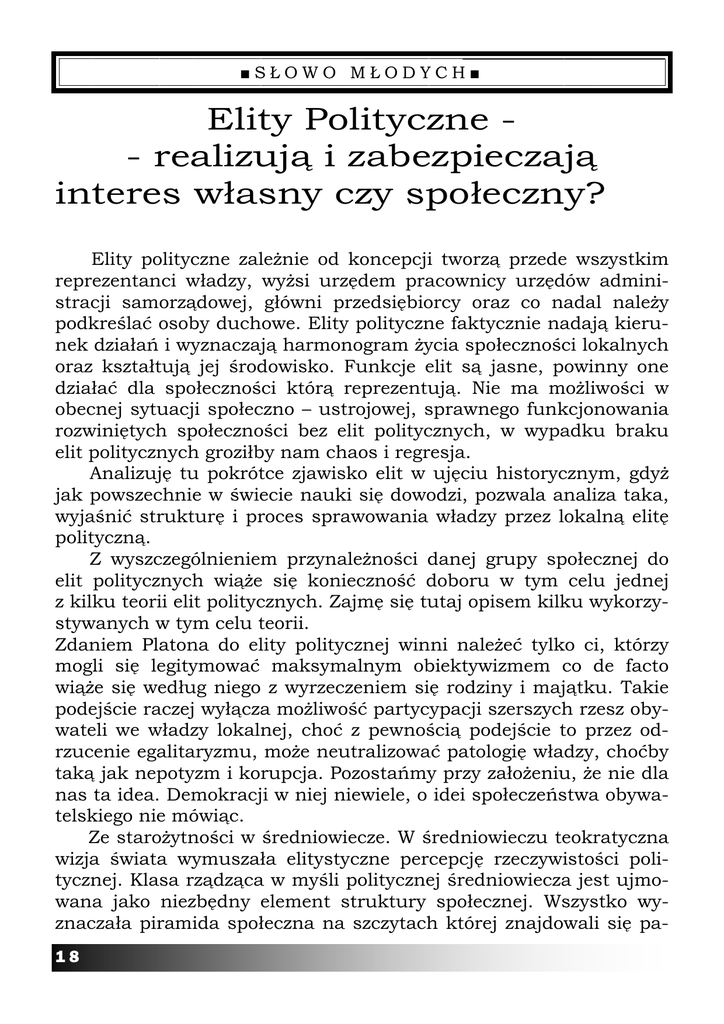 ■SŁOWO MŁODYCH■ Elity Polityczne - realizują i zabezpieczają interes własny czy społeczny? Elity polityczne zależnie od koncepcji tworzą przede wszystkim reprezentanci władzy, wyżsi urzędem pracownicy urzędów administracji samorządowej, główni przedsiębiorcy oraz co nadal należy podkreślać osoby duchowe. Elity polityczne faktycznie nadają kierunek działań i wyznaczają harmonogram życia społeczności lokalnych oraz kształtują jej środowisko. Funkcje elit są jasne, powinny one działać dla społeczności którą reprezentują. Nie ma możliwości w obecnej sytuacji społeczno – ustrojowej, sprawnego funkcjonowania rozwiniętych społeczności bez elit politycznych, w wypadku braku elit politycznych groziłby nam chaos i regresja. Analizuję tu pokrótce zjawisko elit w ujęciu historycznym, gdyż jak powszechnie w świecie nauki się dowodzi, pozwala analiza taka, wyjaśnić strukturę i proces sprawowania władzy przez lokalną elitę polityczną. Z wyszczególnieniem przynależności danej grupy społecznej do elit politycznych wiąże się konieczność doboru w tym celu jednej z kilku teorii elit politycznych. Zajmę się tutaj opisem kilku wykorzystywanych w tym celu teorii. Zdaniem Platona do elity politycznej winni należeć tylko ci, którzy mogli się legitymować maksymalnym obiektywizmem co de facto wiąże się według niego z wyrzeczeniem się rodziny i majątku. Takie podejście raczej wyłącza możliwość partycypacji szerszych rzesz obywateli we władzy lokalnej, choć z pewnością podejście to przez odrzucenie egalitaryzmu, może neutralizować patologię władzy, choćby taką jak nepotyzm i korupcja. Pozostańmy przy założeniu, że nie dla nas ta idea. Demokracji w niej niewiele, o idei społeczeństwa obywatelskiego nie mówiąc. Ze starożytności w średniowiecze. W średniowieczu teokratyczna wizja świata wymuszała elitystyczne percepcję rzeczywistości politycznej. Klasa rządząca w myśli politycznej średniowiecza jest ujmowana jako niezbędny element struktury społecznej. Wszystko wyznaczała piramida społeczna na szczytach której znajdowali się pa18 ■SŁOWO MŁODYCH■ nowie feudalni, zależało tu wiele od funkcji i roli. W społeczeństwie zdominowanym w swej strukturze przez drabinę feudalną, przynależność do elitarnej grupy władzy lokalnej była zdeterminowana przynależnością do uprzywilejowanych warstw, kanały rekrutacji do elity prowadziły poprzez dziedzictwo majątkowe, pozycje społeczne kandydatów w ten sposób tworzyły się elity lokalnej władzy o bardzo zamkniętym, hermetycznej organizacji. Tu pojawia się Niccolo Machiavelli. Jego koncepcje dotyczące elit również kłócą się z pojęciami partycypacji we władzy szerszych rzesz, a ponadto zamyka im kanały rekrutacji. Jego poglądy mówią o czynniku sprawczym i sile napędowej – tak nazywa elity i ich przywódców. Wiadomo nam czym jest machiawelizm, dodam tylko dla przypomnienia, że w realizacji tej koncepcji należy nam się wyzbyć wszelkich przesłanek etycznych i podporządkować się zasadom pragmatyki politycznej. Taki przepis na sprawowanie władzy i funkcjonowanie elit daje nam N. Machiavelli. Niestety bliskie wielu umysłom koncepcje liberalne elit politycznych są równie elitystyczne jak te średniowieczne. W ujęciu liberałów (jak John Stuart Mill), elita nadaje kierunek rozwoju państwa, zwierzchnia rola leżała w rękach elit o proweniencji finansowo – przemysłowej. Samą władzę koncepcja J. S. Mill powierza jednostkom przywódczym o wybitnych cechach intelektualnych i psychologicznych. Szczęśliwi ci, którzy idąc w sukurs myślowy powyższej koncepcji liberalnej nadal wierzą w swój liberalizm. W okresie rozwoju społeczeństwa burżuazyjnego, kanał rekrutacji w skład elit nieco się poszerzył, jednako istniał jeden zasadniczy cenzus w procesie rekrutacji, był nim posiadany majątek, a jego brak zamykał drogę do elit politycznych. Największe przeobrażenia przyniósł przełom wieków XIX i XX, kiedy rodzi się pojecie demokracji masowej, na fundamencie czego wyrasta pojęcie elit w dzisiejszym rozumieniu. Paradoksem jest właśnie to że w sytuacji, której istniała praktycznie masowa demokracja, powstały „antydemokratyczne” w swym wyrazie koncepcje elit. Głównymi myślicielami w tym zakresie byli V. Pareto i G. Moska oraz R. Michels. Tutaj warto nadmienić, że G. Moska prezentował pogląd w myśl, którego demokracja jako rządy większości jest systemem funkcjonalnie niemożliwym, rządy należą się mniejszości. Tylko niezliczona w tym ujęciu grupa kierownicza, składająca się z decydentów życia politycznego, może efektywnie 19 ■SŁOWO MŁODYCH■ i skuteczni sterować życiem politycznym. Nasuwa się nam tutaj pojęcie o rządzącej mniejszości i rządzonej większości co faktycznie odpowiada dzisiejszej praktyce politycznej i ustrojowej. W związku z tym można jasno stwierdzić, że istnienie elit jest koniecznością wszystkich społeczeństw bez względu na ich stopień rozwoju cywilizacyjnego, bo elity istniały w przeszłości i istnieją nadal. Co jednak najważniejsze z powyższej analizy to, że ta mniejszość która kieruje życiem politycznym większości i pośrednio kształtuje nawet osobiste wybory jednostki ( nawet te najbardziej intymne, poprzez ustawodawstwo ), nie może być efektywnie kontrolowana przez większość. Co więcej jak pokazuje historia w patologicznych systemach ustrojowych, których działanie jest objawem psychopatologii elity szczególnie objawiającej się poprzez syndrom „oblężonej twierdzy”, władza elit jest nieograniczona, a jej działanie nie skorelowane z wymogami społeczeństwa. Jak współcześnie interpretuje się istnienie elit politycznych ergo elit władzy. Koncepcji jest wiele. Dwa główne nurty to funkcjonalny i konfrontacyjny. Model funkcjonalny ukazuje wzajemną koherentność i komplementarność elit