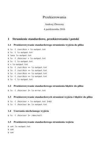 Przekierowania Andrzej Zbrzezny 4 października 2016 1 1.1 Strumienie standardowe, przekierowania i potoki Przekierowywanie standardowego strumienia wyjścia do pliku $ ls -l /usr/bin > ls-output.txt $ ls -l ls-output.txt $ less ls-output.txt $ ls -l /bin/usr > ls-output.txt $ ls -l ls-output.txt $ > ls-output.txt $ ls -l /usr/bin >> ls-output.txt $ ls -l /usr/bin >> ls-output.txt $ ls -l /usr/bin >> ls-output.txt $ ls -l /usr/bin >> ls-output.txt $ ls -l ls-output.txt 1.2 Przekierowywanie standardowego strumienia bł˛edów do pliku $ ls -l /bin/usr 2> ls-error.txt 1.3 Przekierowywanie standardowych strumieni wyjścia i bł˛edów do pliku $ ls -l /bin/usr > ls-output.txt 2>&1 $ ls -l /bin/usr &> ls-output.txt 1.4 Usuwania niechcianego wyjścia $ ls -l /bin/usr 2> /dev/null 1.5 Przekierowywanie standardowego strumienia wejścia $ cat ls-output.txt $ cat $ cat $ cat $ cat > lazy_dog.txt $ cat lazy_dog.txt $ cat < lazy_dog.txt 1.6 Potoki $ ls -l /usr/bin | less $ ls /bin /usr/bin | sort | less $ ls /bin /usr/bin | sort | uniq | less $ ls /bin /usr/bin | sort | uniq -d | less $ wc ls-output.txt $ ls /bin /usr/bin | sort | uniq | wc -l $ ls /bin /usr/bin | sort | uniq | grep zip $ head -n 5 ls-output.txt $ tail -n 5 ls-output.txt $ ls /usr/bin | tail -n 5 $ tail -f /var/log/messages $ ls /usr/bin | tee ls.txt | grep zip 2