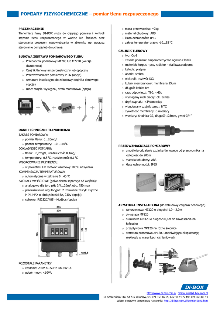 POMIARY FIZYKOCHEMICZNE – pomiar tlenu rozpuszczonego PRZEZNACZENIE o masa przetwornika: ~2kg Tlenomierz firmy DI-BOX służy do ciągłego pomiaru i kontroli o materiał obudowy: ABS stężenia tlenu rozpuszczonego w wodzie lub ściekach oraz o klasa ochronności: IP65 sterowania procesem napowietrzania w zbiorniku np. poprzez o zakres temperatur pracy: -10...55 oC sterowanie pompą lub dmuchawą. BUDOWA ZESTAWU POMIAROWEGO TLENU o Przetwornik pomiarowy M1200 lub M2220 (wersja dwutorowa) o Czujnik tlenowy amperometryczny lub optyczny CZUJNIK TLENOWY o typ: Os-8 o zasada pomiaru: amperometryczne ogniwo Clark’a o materiał: korpus - pcv, radiator - stal kwasoodporna o katoda: platyna o Przedwzmacniacz pomiarowy P-Ox (opcja) o anoda: srebro o Armatura instalacyjna do zabudowy czujnika tlenowego o elektrolit: roztwór KCL (opcja) o Inne: stojak, wysięgnik, szafa montażowa (opcja) o kubek membranowy: membrana 25um o długość kabla: 8m o czas odpowiedzi: T90: <40s o wymagany ruch cieczy: ok. 3cm/s o dryft sygnału: <3%/miesiąc o wbudowany czujnik temp.: NTC o żywotność membrany: 6 miesięcy o wymiary: średnica-32, długość-128mm, gwint-3/4” DANE TECHNICZNE TLENOMIERZA ZAKRES POMIAROWY: o pomiar tlenu: 0...20mg/l o pomiar temperatury: -10...110oC DOKŁADNOŚĆ POMIARU: o tlenu: 0,2mg/l , rozdzielczość 0,1mg/l o temperatury: 0,5 oC, rozdzielczość 0,1 oC WZORCOWANIE PRZYRZĄDU: o w powietrzu lub roztwór wzorcowy 100% nasycenia PRZEDWZMACNIACZ POMIAROWY o umożliwia oddalenie czujnika tlenowego od przetwornika na odległość do 200m o materiał obudowy: ABS o klasa ochronności: IP65 KOMPENSACJA TEMPERATUROWA: o automatyczna w zakresie 0...40 oC SYGNAŁY WYJŚCIOWE (galwaniczna separacja od wejścia): o analogowe dla toru pH: 0/4...20mA obc. 750 max o przekaźnikowe regulacyjne: 2 izolowane zestyki złączne MIN, MAX o obciążalności 5A, 230V (opcja) o cyfrowe: RS232C/485 - Modbus (opcja) ARMATURA INSTALACYJNA (do zabudowy czujnika tlenowego) o zanurzeniowa MZ120 o długości 1,0 - 2,0m o pływająca MF120 o nurnikowa MN120 o długości 0,6m do zawieszania na łańcuchu o przepływowa MP120 na różne średnice o armatura procesowa AP120, umożliwiająca eksploatację elektrody w warunkach ciśnieniowych POZOSTAŁE PARAMETRY o zasilanie: 230V AC 50Hz lub 24V DC o pobór mocy: <10VA DI-BOX http://www.di-box.com.pl mailto:[email protected] ul. Szczecińska 11a 54-517 Wrocław, tel. 071 353 86 55, 602 48 44 77 fax. 071 353 86 54 Więcej o naszym tlenomierzu na stronie: http://di-box.com.pl/pomiar-tlenu.htm