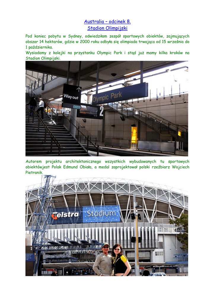 Australia – odcinek 8. Stadion Olimpijski Pod koniec pobytu w Sydney, odwiedziłam zespół sportowych obiektów, zajmujących obszar 14 hektarów, gdzie w 2000 roku odbyła się olimpiada trwająca od 15 września do 1 października. Wysiadamy z kolejki na przystanku Olympic Park i stąd już mamy kilka kroków na Stadion Olimpijski. Autorem projektu architektonicznego wszystkich wybudowanych tu sportowych obiektówjest Polak Edmund Obiała, a medal zaprojektował polski rzeźbiarz Wojciech Pietranik. Przygotowania trwały trzy lata. Stadion mógł pomieścić 110 tysięcy ludzi, a całe przedsięwzięcie kosztowało 690 mln dolarów. W dniu inaugurującym olimpiadę, kolumnę honorową otwierała reprezentacja Grecji, państwa, gdzie zrodziła się idea organizowania olimpijskich igrzysk. Pochód zamykali Australijczycy. W olimpiadzie wzięło udział ponad 10 tysięcy zawodników z 199 państw. Po raz pierwszy pojawiły się Erytrea, Mikronezja i Palau. Na start ze względu na dyskryminację kobiet nie zezwolono Afganistanowi. Publiczność owacjami na stojąco powitała maszerującą pod jedną flagą reprezentację Korei Południowej i Północnej. Oba te kraje formalnie znajdowały się w stanie wojny i podczas zawodów startowały oddzielnie. Znicz olimpijski zapalała lekkoatletka Cathy Freeman. Ten symboliczny akt sprinterka uwypukliła, zdobywając złoty medal w biegu na 400 m i tym samym stała się bohaterem narodowym Australii. Rozegrano 300 konkurencji w 28 dyscyplinach. Absolutną gwiazdą w lekkoatletyce została Miron Jones, która zdobyła 3 złote i 2 brązowe medale. Polskę reprezentowało 100 sportowców. Zdobyliśmy złote, srebrne i brązowe medale. Złoto przywieźli do kraju: - Robert Korzeniowski - chód na 20 km, - Robert Korzeniowski - chód na 50 km, - Renata Mauer-Różańska – strzelectwo, - Kamila Skolimowska - rzut młotem, - Szymon Ziółkowski - rzut młotem, - Tomasz Kucharski i Robert Sycz – wioślarstwo. Ostatnie w minionym stuleciu igrzyska charakteryzowały się doskonałą organizacją, bardzo wysokim poziomem przygotowania technicznego sportowców i wspaniałą atmosferą wśród zawodników. Dziś, kiedy to wielkie sportowe wydarzenie przeszło już do historii, organizowane są do olimpijskich obiektów wycieczki szkolnych dzieciaków. Hotel olimpijski. W sąsiedztwie olimpijskich obiektów zaprojektowano zielone ścieżki dla spacerowiczów i rekreacyjne miejsca do odpoczynku. W centrum Olimpic Station znajduje się grób 18-letniej Polki Basi, która zmarła tu podczas igrzysk. Znakomita organizacja i ogromne zainteresowanie całego świata sprawiły, że te igrzyska stały się bardzo ważnym wydarzeniem, integrującym narody i kontynenty. Dojazd do Parku Olimpijskiego był przygotowany perfekcyjnie. Kolejka metra dojeżdżała w samo serce Stadionu. Kończy się już moja opowieść, miejscu gdzie całkiem przypadkowo zaznaczyłam swoją obecność. Obecność, która tak bardzo zaważy na moich późniejszych życiowych planach. W drodze powrotnej włożyłam do podręcznego bagażu przeczytaną w Australii „Sztukę szczęścia” opisującą filozofię Dalajlamy. I, aby znieść jakoś dłużące się do Wiednia 22 godziny lotu, pisałam streszczenie tej ciekawej lektury. Pozdrawiam Cię serdecznie i dziękuję Ci za poświęcony mi czas. Zielona Gałązka