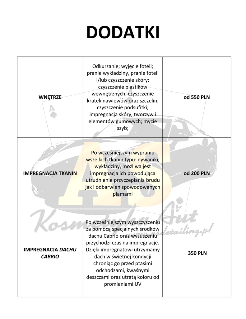 DODATKI WNĘTRZE Odkurzanie; wyjęcie foteli; pranie wykładziny, pranie foteli i/lub czyszczenie skóry; czyszczenie plastików wewnętrznych; czyszczenie kratek nawiewów oraz szczelin; czyszczenie podsufitki; impregnacja skóry, tworzyw i elementów gumowych; mycie szyb; od 550 PLN IMPREGNACJA TKANIN Po wcześniejszym wypraniu wszelkich tkanin typu: dywaniki, wykładziny, możliwa jest impregnacja ich powodująca utrudnienie przyczepiania brudu jak i odbarwień spowodowanych plamami od 200 PLN IMPREGNACJA DACHU CABRIO Po wcześniejszym wyszczyszeniu za pomocą specjalnych środków dachu Cabrio oraz wysuszeniu przychodzi czas na impregnacje. Dzięki impregnatowi utrzymamy dach w świetnej kondycji chroniąc go przed ptasimi odchodzami, kwaśnymi deszczami oraz utratą koloru od promieniami UV 350 PLN