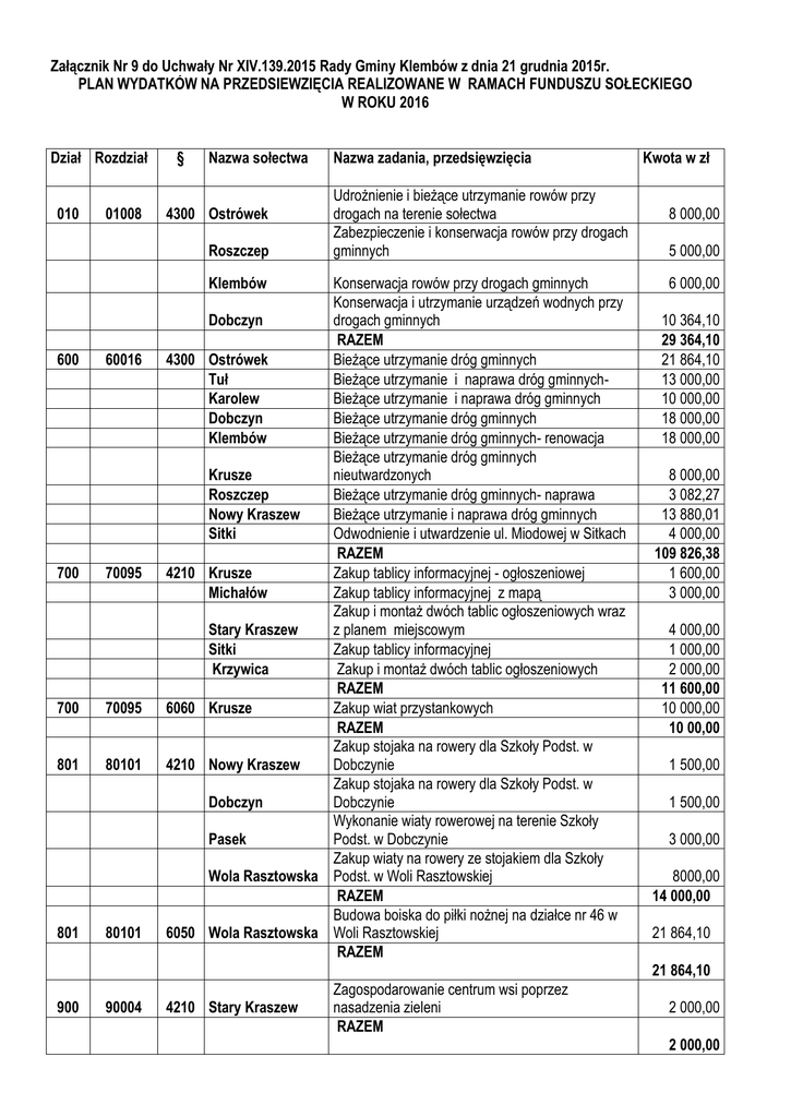 Załącznik Nr 9 do Uchwały Nr XIV.139.2015 Rady Gminy Klembów z dnia 21 grudnia 2015r. PLAN WYDATKÓW NA PRZEDSIEWZIĘCIA REALIZOWANE W RAMACH FUNDUSZU SOŁECKIEGO W ROKU 2016 Dział Rozdział 010 01008 § Nazwa sołectwa 4300 Ostrówek Roszczep Nazwa zadania, przedsięwzięcia Udrożnienie i bieżące utrzymanie rowów przy drogach na terenie sołectwa Zabezpieczenie i konserwacja rowów przy drogach gminnych Klembów 600 700 60016 70095 4300 4210 700 70095 6060 801 80101 4210 801 80101 6050 Konserwacja rowów przy drogach gminnych Konserwacja i utrzymanie urządzeń wodnych przy Dobczyn drogach gminnych RAZEM Ostrówek Bieżące utrzymanie dróg gminnych Tuł Bieżące utrzymanie i naprawa dróg gminnychKarolew Bieżące utrzymanie i naprawa dróg gminnych Dobczyn Bieżące utrzymanie dróg gminnych Klembów Bieżące utrzymanie dróg gminnych- renowacja Bieżące utrzymanie dróg gminnych Krusze nieutwardzonych Roszczep Bieżące utrzymanie dróg gminnych- naprawa Nowy Kraszew Bieżące utrzymanie i naprawa dróg gminnych Sitki Odwodnienie i utwardzenie ul. Miodowej w Sitkach RAZEM Krusze Zakup tablicy informacyjnej - ogłoszeniowej Michałów Zakup tablicy informacyjnej z mapą Zakup i montaż dwóch tablic ogłoszeniowych wraz Stary Kraszew z planem miejscowym Sitki Zakup tablicy informacyjnej Krzywica Zakup i montaż dwóch tablic ogłoszeniowych RAZEM Krusze Zakup wiat przystankowych RAZEM Zakup stojaka na rowery dla Szkoły Podst. w Nowy Kraszew Dobczynie Zakup stojaka na rowery dla Szkoły Podst. w Dobczyn Dobczynie Wykonanie wiaty rowerowej na terenie Szkoły Pasek Podst. w Dobczynie Zakup wiaty na rowery ze stojakiem dla Szkoły Wola Rasztowska Podst. w Woli Rasztowskiej RAZEM Budowa boiska do piłki nożnej na działce nr 46 w Wola Rasztowska Woli Rasztowskiej RAZEM Kwota w zł 8 000,00 5 000,00 6 000,00 10 364,10 29 364,10 21 864,10 13 000,00 10 000,00 18 000,00 18 000,00 8 000,00 3 082,27 13 880,01 4 000,00 109 826,38 1 600,00 3 000,00 4 000,00 1 000,00 2 000,00 11 600,00 10 000,00 10 00,00 1 500,00 1 500,00 3 000,00 8000,00 14 000,00 21 864,10 21 864,10 900 90004 4210 Stary Kraszew Zagospodarowanie centrum wsi poprzez nasadzenia zieleni RAZEM 2 000,00 2 000,00 900 90015 4300 Pieńki Krzywica Michałów 921 92195 4210 Krusze Krusze Rasztów Rasztów Stary Kraszew Stary Kraszew Pasek Sitki Klembów Roszczep Roszczep Roszczep Roszczep Michałów Lipka Tuł Karolew Zakup i montaż lamp oświetleniowych Zakup i montaż lamp oświetleniowych Oświetlenie placu zabaw RAZEM Zakup kosy spalinowej Organizacja dnia dziecka Doposażenie placu zabaw Organizacja imprezy z okazji dnia Dziecka Zakup flag i uchwytów Wykonanie ogólnodostępnej siłowni zewnętrznej Budowa placu zabaw z elementami siłowni Zakup sprzętu rehabilitacyjnego dla dorosłych Zakup ławek Remont i renowacja placu zabaw Organizacja zajęć kulturalnych i rekreacyjnych Wykonanie sceny i WC na placu zabaw Doposażenie placu zabaw Doposażenie placu zabaw dla dzieci do lat 3 Budowa placu zabaw wraz z ogrodzeniem Zakup urządzeń do organizacji imprez edukacyjnych -kulturowo-sportowych w sołectwie Tuł – nagłośnienie Zakup urządzeń do organizacji imprez edukacyjnych -kulturowo-sportowych w sołectwie Karolew – zakup stołów, krzeseł i projektora RAZEM OGÓŁEM 7 824,39 12 484,09 6 000,00 26 308,48 2 000,00 1 723,86 11 931,16 1 000,00 1 171,86 10 000,00 17 606,23 7 722 11 5 864,10 1 500,00 2 000,00 3 000,00 2 500,00 3 602,65 12 751,97 2 947,43 2 990,88 90 311,25 315 275,31