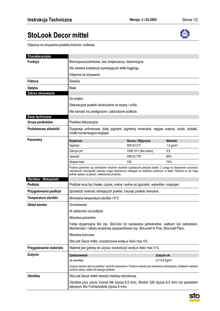 Instrukcja Techniczna Strona 1/2 Wersja: 2 / 02.2005 StoLook Decor mittel Odporna na zmywanie powłoka ścienna i sufitowa. Charakterystyka Funkcja Bezrozpuszczalnikowa, bez zmiękczaczy, bezemisyjna. Nie zawiera substancji wywołujących efekt foggingu. Odporna na zmywanie. Faktura Średnia Optyka Zakres stosowania Biała Do wnętrz. Dekoracyjne powłoki strukturalne na ściany i sufity. Nie nanosić na zawilgocone i zabrudzone podłoża. Dane techniczne Grupa produktów Powłoka dekoracyjna Podstawowe składniki Dyspersja polimerowa, biały pigment, pigmenty mineralne, węglan wapnia, woda, dodatki, środki konserwująco-wiążące Parametry Kryterium Gęstość Norma / Wytyczne DIN 53 217 Wartość 1,4 g/cm3 Odczyn pH VIQP 011 (Sto intern) 9,5 Jasność DIN 53 778 85% Stopień bieli CIE 75% Podane parametry są wartościami średnimi wyników uzyskanych podczas badań. Z uwagi na stosowanie surowców naturalnych rzeczywiste wartości mogą nieznacznie odbiegać od wielkości podanych w tabeli. Różnice te nie mają jednak wpływu na jakość i właściwości produktu. Obróbka - Wskazówki Podłoże Podłoże musi być trwałe, czyste, nośne i wolne od zgorzelin, wykwitów i odspojeń. Przygotowanie podłoża Sprawdzić nośność istniejących powłok. Usunąć powłoki nienośne. Temperatura obróbki Minimalna temperatura obróbki +5°C Układ warstw Gruntowanie: W zależności od podłoża Warstwa pośrednia: Farba dyspersyjna Sto (np. StoColor In) naniesiona jednokrotnie, wałkiem lub natryskiem. Nierówności i należy wcześniej zaszpachlować (np. StoLevell In Fine, StoLevell Plan). Warstwa końcowa: StoLook Decor mittel, rozcieńczona wodą w ilości max 5%. Przygotowanie materiału Materiał jest gotowy do użycia, rozcieńczyć wodą w ilości max 5 %. Zużycie Zastosowanie na warstwę Zużycie ok. 0,7-0,9 kg/m2 Zużycie zależne jest od podłoża i techniki nanoszenia. Podana wartość jest wielkością orientacyjną. Dokładne wartości zużycia należy ustalić dla danego podłoża. Obróbka StoLook Decor mittel nanosić metodą natryskową. Obróbka przy użyciu Inomat M8 (dysza 6,5 mm), Strobot 326 (dysza 6,5 mm) lub pistoletem lejkowym Sto-Trichterpistole (dysza 6 mm). Instrukcja Techniczna Wersja: 2 / 02.2005 Strona 2/2 StoLook Decor mittel Odporna na zmywanie powłoka ścienna i sufitowa. Po ok. 4-6 godzinach materiał jest związany, schniecie przez około 24 godziny (przy +20ºC i wilgotności względnej 65%). Czyszczenie narzędzi Formy dostawy Opakowanie Wodą natychmiast po użyciu Barwa Składowanie Warunki składowania Biała oraz kolory o końcowych numerach 6-8, 13 i 22-24 StoColor System Wiadro 21 kg Opakowania muszą być szczelnie zamknięte. Chronić przed mrozem. Czas składowania Informacje dodatkowe Najlepsza jakość w oryginalnym opakowaniu do ... (patrz opakowanie) Bezpieczeństwo Dodatkowe informacje dotyczące obchodzenia się z produktem, składowania i usuwania odpadów znajdują się w Karcie Charakterystyki Preparatu Niebezpiecznego Zastosowania nie wymienione w niniejszej Instrukcji Technicznej należy skonsultować z przedstawicielem Sto-ispo Sp. z o.o. Sto-ispo Sp. z o.o. ul. Zabraniecka 15 03-872 Warszawa tel. (0 22) 511 61 00 fax (0 22) 511 61 01 e-mail: [email protected] www.sto.pl