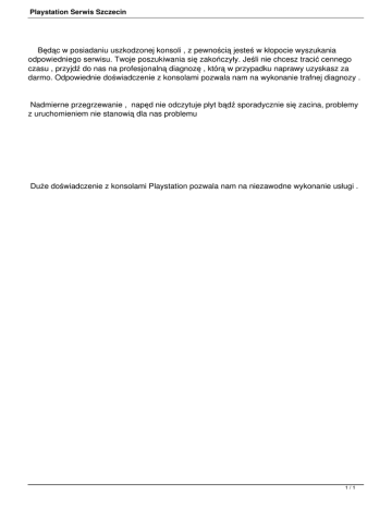 Playstation Serwis Szczecin Będąc w posiadaniu uszkodzonej konsoli , z pewnością jesteś w kłopocie wyszukania odpowiedniego serwisu. Twoje poszukiwania się zakończyły. Jeśli nie chcesz tracić cennego czasu , przyjdź do nas na profesjonalną diagnozę , którą w przypadku naprawy uzyskasz za darmo. Odpowiednie doświadczenie z konsolami pozwala nam na wykonanie trafnej diagnozy . Nadmierne przegrzewanie , napęd nie odczytuje płyt bądź sporadycznie się zacina, problemy z uruchomieniem nie stanowią dla nas problemu Duże doświadczenie z konsolami Playstation pozwala nam na niezawodne wykonanie usługi . 1/1