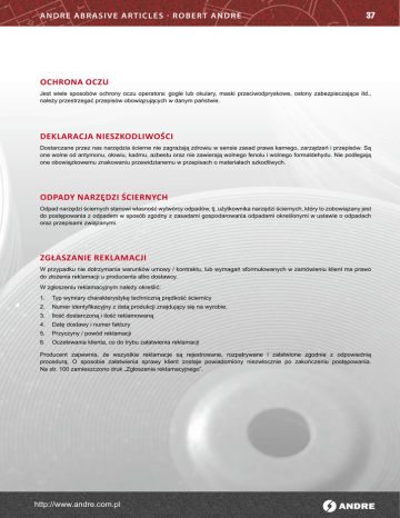 A N DRE AB R A SI V E A R T I CL E S · R O B E R T A N DR E 37 OCHRONA OCZU Jest wiele sposobów ochrony oczu operatora: gogle lub okulary, maski przeciwodpryskowe, osłony zabezpieczające itd., należy przestrzegać przepisów obowiązujących w danym państwie. DEKLARACJA NIESZKODLIWOŚCI Dostarczane przez nas narzędzia ścierne nie zagrażają zdrowiu w sensie zasad prawa karnego, zarządzeń i przepisów. Są one wolne od antymonu, ołowiu, kadmu, azbestu oraz nie zawierają wolnego fenolu i wolnego formaldehydu. Nie podlegają one obowiązkowemu znakowaniu przewidzianemu w przepisach o materiałach szkodliwych. Odpady narzędzi ściernych Odpad narzędzi ściernych stanowi własność wytwórcy odpadów, tj. użytkownika narzędzi ściernych, który to zobowiązany jest do postępowania z odpadem w sposób zgodny z zasadami gospodarowania odpadami określonymi w ustawie o odpadach oraz przepisami związanymi. ZGŁASZANIE REKLAMACJI W przypadku nie dotrzymania warunków umowy / kontraktu, lub wymagań sformułowanych w zamówieniu klient ma prawo do złożenia reklamacji u producenta albo dostawcy. W zgłoszeniu reklamacyjnym należy określić: 1. Typ wymiary charakterystykę techniczną prędkość ściernicy 2. Numer identyfikacyjny z datą produkcji znajdujący się na wyrobie. 3. Ilość dostarczoną i ilość reklamowaną 4. Datę dostawy i numer faktury 5. Przyczyny / powód reklamacji 6. Oczekiwania klienta, co do trybu załatwienia reklamacji Producent zapewnia, że wszystkie reklamacje są rejestrowane, rozpatrywane i załatwione zgodnie z odpowiednią procedurą. O sposobie załatwienia sprawy klient zostaje powiadomiony niezwłocznie po zakończeniu postępowania. Na str. 100 zamieszczono druk „Zgłoszenia reklamacyjnego”. http://www.andre.com.pl