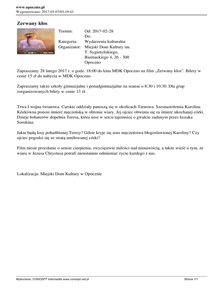 www.opoczno.pl Wygenerowano: 2017-03-07/03:19:43 Zerwany kłos Termin: Od: 2017-02-28 Do: Kategoria: Wydarzenia kulturalne Organizator: Miejski Dom Kultury im. T. Sygietyńskiego, Biernackiego 4, 26 - 300 Opoczno Zapraszamy 28 lutego 2017 r. o godz. 18:00 do kina MDK Opoczno na film „Zerwany kłos". Bilety w cenie 15 zł do nabycia w MDK Opoczno. Zapraszamy także szkoły gimnazjalne i ponadgimnazjalne na seanse o 8:30 i 10:30. Dla grup zorganizowanych bilety w cenie 13 zł. Trwa I wojna światowa. Carskie oddziały panoszą się w okolicach Tarnowa. Szesnastoletnia Karolina Kózkówna ponosi śmierć męczeńską w obronie wiary. Jej ojciec obwinia się za śmierć ukochanej córki. Dzieje bohaterów dopełnia Teresa, która nosi w sercu tajemnicę o gwałcie zadanym przez kozaka Sorokina. Jakie będą losy pohańbionej Teresy? Gdzie kryje się sens męczeństwa błogosławionej Karoliny? Czy ojciec pogodzi się ze stratą umiłowanej córki? Film niesie przesłanie o sensie cierpienia, zwycięstwie miłości nad nienawiścią, a także wieść o tym, że wiara w Jezusa Chrystusa potrafi nieustannie odmieniać życie każdego z nas. Lokalizacja: Miejski Dom Kultury w Opocznie Wykonanie: CONCEPT Intermedia www.concept.net.pl Strona 1/1