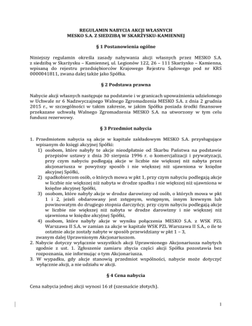 REGULAMIN NABYCIA AKCJI WŁASNYCH MESKO S.A. Z SIEDZIBĄ W SKARŻYSKU-KAMIENNEJ § 1 Postanowienia ogólne Niniejszy regulamin określa zasady nabywania akcji własnych przez MESKO S.A. z siedzibą w Skarżysku – Kamiennej, ul. Legionów 122, 26 – 111 Skarżysko – Kamienna, wpisaną do rejestru przedsiębiorców Krajowego Rejestru Sądowego pod nr KRS 0000041811, zwana dalej także jako Spółka. § 2 Podstawa prawna Nabycie akcji własnych następuje na podstawie i w granicach upoważnienia udzielonego w Uchwale nr 6 Nadzwyczajnego Walnego Zgromadzenia MESKO S.A. z dnia 2 grudnia 2015 r., w szczególności w takim zakresie, w jakim Spółka posiada środki finansowe przekazane uchwałą Walnego Zgromadzenia MESKO S.A. na utworzony w tym celu fundusz rezerwowy. § 3 Przedmiot nabycia 1. Przedmiotem nabycia są akcje w kapitale zakładowym MESKO S.A. przysługujące wpisanym do księgi akcyjnej Spółki: 1) osobom, które nabyły te akcje nieodpłatnie od Skarbu Państwa na podstawie przepisów ustawy z dnia 30 sierpnia 1996 r. o komercjalizacji i prywatyzacji, przy czym nabyciu podlegają akcje w liczbie nie większej niż nabyta przez akcjonariusza w powyższy sposób i nie większej niż ujawniona w księdze akcyjnej Spółki, 2) spadkobiercom osób, o których mowa w pkt 1, przy czym nabyciu podlegają akcje w liczbie nie większej niż nabyta w drodze spadku i nie większej niż ujawniona w księdze akcyjnej Spółki, 3) osobom, które nabyły akcje w drodze darowizny od osób, o których mowa w pkt 1 i 2, jeżeli obdarowany jest zstępnym, wstępnym, innym krewnym lub powinowatym do drugiego stopnia darczyńcy, przy czym nabyciu podlegają akcje w liczbie nie większej niż nabyta w drodze darowizny i nie większej niż ujawniona w księdze akcyjnej Spółki, 4) osobom, które nabyły akcje w wyniku połączenia MESKO S.A. z WSK PZL Warszawa II S.A. w zamian za akcje w kapitale WSK PZL Warszawa II S.A., o ile te ostatnie akcje zostały nabyte w sposób przewidziany w pkt 1 – 3, zwanym dalej Uprawnionym Akcjonariuszom. 2. Nabycie dotyczy wyłącznie wszystkich akcji Uprawnionego Akcjonariusza nabytych zgodnie z ust. 1. Zgłoszenie zamiaru zbycia części akcji Spółka pozostawia bez rozpoznania, nie informując o tym Akcjonariusza. 3. W wypadku, gdy akcje stanowią przedmiot wspólności, nabycie może dotyczyć wyłącznie akcji, a nie udziału w akcji. § 4 Cena nabycia Cena nabycia jednej akcji wynosi 16 zł (szesnaście złotych). 1 § 5 Tryb nabycia Nabycie akcji przez MESKO S.A. następuje w następujących trybach: 1) oświadczenia o zamiarze zbycia (§ 6), 2) pierwokupu (§ 7). § 6 Oświadczenie o zamiarze zbycia 1. Przedmiotem nabycia są akcje przysługujące tym Uprawnionym Akcjonariuszom, którzy w okresie od dnia 1 stycznia 2016 r. do dnia 30 czerwca 2016 r. złożą Spółce oświadczenie o zamiarze zbycia akcji na rzecz Spółki. 2. Oświadczenie, o którym mowa w ust. 1, składane jest na formularzu stanowiącym Załącznik Nr 1 do niniejszego Regulaminu. Oświadczenie może być złożone Spółce, wyłącznie za pomocą listu poleconego lub przesyłki nadanej pocztą kurierską lub osobiście w jednym z następujących lokali Spółki: a) ul. Legionów 122, 26 – 111 Skarżysko-Kamienna, ul. Legionów 122, b) Lubiczów, ul. Warszawska 51B. 3. O zachowaniu terminu, o którym mowa w ust. 1, decyduje data wpływu oświadczenia do Spółki. 4. Nieprawidłowo wypełnione oświadczenie, w szczególności wypełnione z pominięciem chociażby jednej rubryki podlegającej obowiązkowemu wypełnieniu, podlega pozostawieniu bez rozpatrzenia, o czym Spółka powiadomi Akcjonariusza, wedle jego wyboru, za pomocą listu poleconego lub poczty elektronicznej. W takim wypadku Akcjonariusz może złożyć ponownie oświadczenie, o którym mowa w ust. 1 i 2. § 7 Pierwokup Przedmiotem nabycia są także akcje przysługujące Uprawnionym Akcjonariuszom, co do których w okresie od dnia 1 stycznia 2016 r. do dnia 30 czerwca 2016 r. Spółka skorzysta z prawa pierwokupu na podstawie § 9 ust. 6-8 Statutu Spółki i w granicach określonych upoważnieniem Walnego Zgromadzenia. Spółka podejmuje decyzję o skorzystaniu z prawa pierwokupu na podstawie informacji zawartych w przedkładanym przez akcjonariusza zgłoszeniu zamiaru zbycia akcji (wraz z warunkową umową sprzedaży akcji), o którym mowa w § 9 ust. 7 Statutu Spółki. Wzór zgłoszenia stanowi Załącznik Nr 2 do niniejszego Regulaminu. Przykładowy wzór umowy warunkowej stanowi Załącznik Nr 3 do niniejszego Regulaminu. § 8 Ustalanie Zbywców Ustalenie, które akcje podlegają nabyciu przez Spółkę na podstawie niniejszego regulaminu dokonuje się według kolejności otrzymania przez Spółkę oświadczeń, o których mowa w § 6 ust. 1 i 2 bądź zgłoszenia przez Uprawnionego Akcjonariusza zamiaru zbycia akcji zgodnie z § 9 ust. 7 Statutu Spółki, poprzez sporządzenie listy Akcjonariuszy dokonujących zbycia („Zbywców”) określającej imię, nazwisko, nr PESEL bądź inny numer identyfikujący Akcjonariusza oraz jego adres, jak również liczby akcji. Ustalenia tego Spółka będzie dokonywać na koniec każdego miesiąca kalendarzowego, aż do momentu, gdy łączna cena za akcje nabyte i zakwalifikowane do nabycia (sprawy w toku) wyczerpie określone w § 2 środki finansowe na nabycie akcji. W wypadku, gdy 2 w wyniku niedojścia do skutku części umów sprzedaży Spółka będzie posiadać środki finansowe na nabycie akcji własnych, wznowi ona ustalanie akcji według stanu od dnia, na który zamknięto poprzednie ustalanie. § 9 Nabycie akcji zgodnie z § 6 1. W przypadku, o którym mowa w § 6, nabycie akcji przez Spółkę nastąpi w terminie 30 dni od dnia doręczenia zawiadomienia Zbywcy o gotowości Spółki do zawarcia umowy sprzedaży akcji. Zawiadomienie to określi cztery dni, w których, w godzinach pracy Spółki możliwe będzie zawarcie umowy sprzedaży. 2. Zawarcie umowy sprzedaż