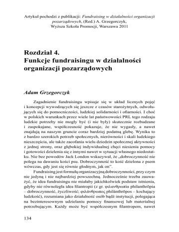 Artykuł pochodzi z publikacji: Fundraising w działalności organizacji pozarządowych, (Red.) A. Grzegorczyk, Wyższa Szkoła Promocji, Warszawa 2011 Rozdział 4. Funkcje fundraisingu w działalności organizacji pozarządowych Adam Grzegorczyk Zagadnienie fundraisingu wpisuje się w układ licznych pojęć i koncepcji wywodzących się jeszcze z czasów starożytnych, odwołujących się do pomocniczości, ludzkiej solidarności i ofiarności. I choć w polskich warunkach przez wiele lat państwowości PRL tego rodzaju ludzkie potrzeby nie mogły być (i nie były) skutecznie rozbudzane i zaspokajane, współczesność pokazuje, że nie wygasły, a nawet znajdują na naszym gruncie coraz bardziej podatną glebę. Wynika to z bardzo szerokich potrzeb społecznych, nierówności i skali ludzkiego nieszczęścia, ale także zacofania wielu dziedzin społecznej aktywności z jednej strony, oraz głębokiej indywidualnej chęci niesienia pomocy i gotowości dzielenia się z innymi nawet w sytuacji własnego niedostatku. Nie bez powodów Jack London wskazywał, że „dobroczynność nie polega na dawaniu kości psu. Dobroczynność to kość dzielona z psem wówczas, gdy jest się równie głodnym, jak on”. Fundraising jest formułą organizacyjną dobroczynności, przy czym nie jedyną i nie najbardziej powszechną. Jednocześnie trzeba zauważyć, że idea fundraisingu nie miałaby jakichkolwiek podstaw istnienia, gdyby nie równoległa idea filantropii (z gr. φιλανθρωπία philanthrōpia – dobroczynność, życzliwość; φιλάνθρωπος philánthrōpos – kochający ludzkość), rozumiana jako działalność osób bądź instytucji, polegająca na bezinteresownym udzielaniu pomocy finansowej lub materialnej potrzebującym. Każdy może być współczesnym filantropem, nawet 134 osoby niezamożne, jednak dzieje się tak dzięki koncepcji fundraisingu. Przekazywana przez darczyńcę pomoc utonęłaby w morzu potrzeb, zostałaby bezproduktywnie zmarnotrawiona, nie dotarłaby do rzeczywiście potrzebujących. Fundraising nadaje tej pomocy właściwy kierunek i zwrot. Odpowiedniego charakteru pomoc (bo nie musi ona przybierać wyłącznie formy wsparcia finansowego) poprzez organizację podejmującą czynności fundraisingowe trafia do właściwie dobranych potrzebujących. Nie bez znaczenia jest cel gromadzenia pomocy, ponieważ darczyńcy ten cel nie jest obojętny i tak, jak byłby on gotów wspierać określony cel, tak już inny cel nie przemawia do niego w stopniu uzasadniającym udzielenie takiego wsparcia. Specjalizacja organizacji fundraisingowych pozwala dotrzeć z prośbą o pomoc na określony cel do odpowiedniego darczyńcy.1 W układzie społecznym fundraising ma sens tylko wtedy, jeśli znajdzie się ktoś, kto zechce pomóc komuś innemu. Dobroczynność należy zatem rozumieć jako dawanie w celu pomagania, zaś fundraising jako zbieranie w celu pomagania. Na gruncie tradycyjnej filantropii we współczesnych relacjach kapitalizmu wyrosły odrębne idee pomocowe, jednak zakorzenione w działalności gospodarczej i przedsiębiorczości. Podstawowymi z nich są koncepcja społecznej gospodarki rynkowej (na poziomie makroekonomicznym) oraz społeczna odpowiedzialność biznesu i marketing społecznie zaangażowany (na poziomie mikroekonomii).2 Idea społecznej odpowiedzialności jest jedną z podstawowych zasad społecznej gospodarki rynkowej. Niezbyt często podnoszona jest okoliczność, iż Polska w swojej konstytucji przyjętej w 1997 roku zapisała, iż podstawę jej ustroju stanowi społeczna gospodarka rynkowa. Koncepcja społecznej odpowiedzialności biznesu, wyrosła na gruncie tożsamości organizacji, które działając w określonym środowisku, czuły się do tego środowiska przynależne i czerpiąc z niego zasoby (naturalne, ludzkie, intelektualne), odczuwały potrzebę działania wzajemnego. Koncepcja społecznej odpowiedzialności biznesu ewoluowała przy tym bardzo głęboko, osiągając (w niektórych opracowaniach) status strategii kreowania przewagi konkurencyjnej. Takie podejście, choć sprzeczne z pierwotnymi założeniami tej koncepcji, Rosso H.A. i in., Hank Rosso’s Achieving Excellence in Fund Raising, Jossey-Bass, San Francisco 2003, ss. 14-20 2 Ibidem, ss. 3-11 1 135 jest współcześnie bardzo popularne wśród przedsiębiorców, którzy mają wolę wykorzystywania własnej dobroczynności do budowania odpowiednich relacji z poszczególnymi grupami interesariuszy. Motywacje przedsiębiorców do odczuwania społecznej odpowiedzialności mogą być zatem bardzo różne: od porywu serca (działanie wynikające z wewnętrznej potrzeby napędzanej czynnikami emocjonalnymi lub uwarunkowaniami osobistymi), przez współodczuwanie (w wyniku ujawnienia problemu społecznego przedsiębiorca dostrzega sens zaangażowania się w jego rozwiązanie), tradycję pomagania wynikającą z przynależności klasowej lub rodzinnej, konformizm (zaangażowanie w rozwiązywanie problemów społecznych ze względu na zaangażowanie innych lub społeczne oczekiwania), aż po cel wykorzystania działalności prospołecznej jako elementu działań promocyjnych firmy i budowania jej wizerunku, a nawet chęci otrzymania dotacji albo skorzystania z ulg i zwolnień podatkowych. Podobna w sferze tych ostatnich intencji CSR jest koncepcja marketingu społecznie zaangażowanego, polegająca na kreowaniu działalności marketingowej kontekstowo opartej na wybranej idei społecznej. Tego rodzaju działania pozwalają przedsiębiorstwom wykorzystywać efekt transferu wizerunku, a często poprzez powiązanie wybranej społecznej idei z polem własnej działalności także uzyskiwać oszczędności (lub przyrost przychodów) w działalności operacyjnej. 4.1 Kanał pomocowy Fundraising sprawdza się w otwartych, dojrzałych społeczeństwach demokratycznych, w których działa wiele różnej wielkości organizacji społecznych. To właśnie ten kapitał społeczny,