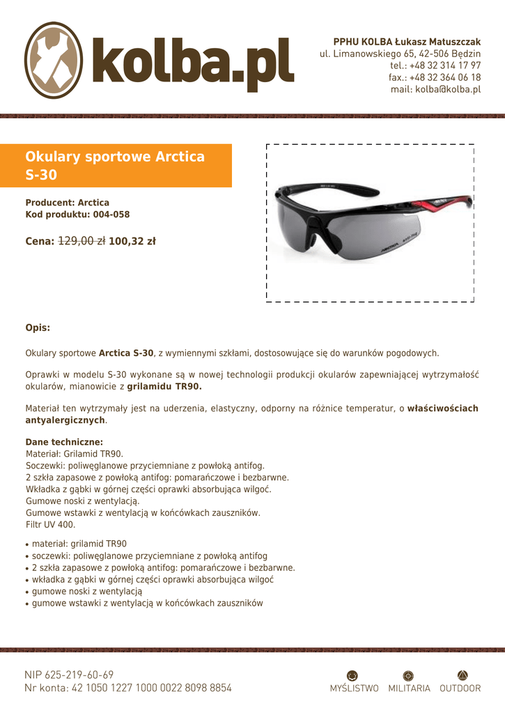 Okulary sportowe Arctica S-30 Producent: Arctica Kod produktu: 004-058 Cena: 129,00 zł 100,32 zł Opis: Okulary sportowe Arctica S-30, z wymiennymi szkłami, dostosowujące się do warunków pogodowych. Oprawki w modelu S-30 wykonane są w nowej technologii produkcji okularów zapewniającej wytrzymałość okularów, mianowicie z grilamidu TR90. Materiał ten wytrzymały jest na uderzenia, elastyczny, odporny na różnice temperatur, o właściwościach antyalergicznych. Dane techniczne: Materiał: Grilamid TR90. Soczewki: poliwęglanowe przyciemniane z powłoką antifog. 2 szkła zapasowe z powłoką antifog: pomarańczowe i bezbarwne. Wkładka z gąbki w górnej części oprawki absorbująca wilgoć. Gumowe noski z wentylacją. Gumowe wstawki z wentylacją w końcówkach zauszników. Filtr UV 400. ● ● ● ● ● ● materiał: grilamid TR90 soczewki: poliwęglanowe przyciemniane z powłoką antifog 2 szkła zapasowe z powłoką antifog: pomarańczowe i bezbarwne. wkładka z gąbki w górnej części oprawki absorbująca wilgoć gumowe noski z wentylacją gumowe wstawki z wentylacją w końcówkach zauszników ● ● filtr UV 400 oprawka: czarna z czerwonym dodatkiem; szkła: przyciemniane (kat.2), pomarańczowe (kat.1), bezbarwne (kat.0). W zestawie: ● ● 2 wymienne szkła pokrowiec Arctica na zamek Gwarancja 12 miesięcy.