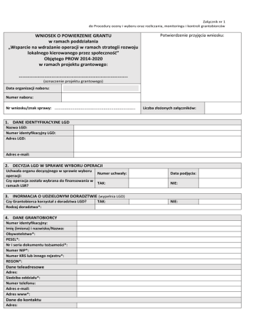 Załącznik nr 1 do Procedury oceny i wyboru oraz rozliczania, monitoringu i kontroli grantobiorców WNIOSEK O POWIERZENIE GRANTU w ramach poddziałania „Wsparcie na wdrażanie operacji w ramach strategii rozwoju lokalnego kierowanego przez społeczność” Objętego PROW 2014-2020 w ramach projektu grantowego: Potwierdzenie przyjęcia wniosku: …………………………………………………………………………….. (oznaczenie projektu grantowego) Data organizacji naboru: Numer naboru: Nr wniosku/znak sprawy: ……………………………………………………………….. Liczba złożonych załączników: 1. DANE IDENTYFIKACYJNE LGD Nazwa LGD: Numer identyfikacyjny LGD: Adres LGD: Adres e-mail: 2. DECYZJA LGD W SPRAWIE WYBORU OPERACJI Uchwała organu decyzyjnego w sprawie wyboru Numer uchwały: operacji: Czy operacja została wybrana do finansowania w TAK: ramach LSR? Data podjęcia: NIE: 3. INORMACJA O UDZIELONYM DORADZTWIE (wypełnia LGD) Czy Grantobiorca korzystał z doradztwa LGD? Rodzaj doradztwa*: 4. DANE GRANTOBIORCY Numer identyfikacyjny: Imię (imiona) i nazwisko/Nazwa: Obywatelstwo*: PESEL*: Nr i seria dokumentu tożsamości*: Numer NIP*: Numer KRS lub innego rejestru*: REGON*: Dane teleadresowe Adres: Siedziba oddziału*: Numer telefonu: Adres e-mail: Adres www*: Dane do kontaktu Adres: TAK: NIE: Numer telefonu: Adres e-mail: Imię i nazwisko osoby do kontaktu*: Numer telefonu osoby do kontaktu*: Adres e-mail osoby do kontaktu*: Dane osób upoważnionych do reprezentacji Grantobiorcy Imię i nazwisko Stanowisko/Funkcja Dane pełnomocnika Grantobiorcy* Imię i nazwisko: Stanowisko/funkcja: Adres: Numer telefonu: Adres e-mail: Dane jednostki organizacyjnej nieposiadającej osobowości prawnej, w imieniu której o powierzenie grantu ubiega się osoba prawna powiązana organizacyjnie z tą jednostką* Nazwa: Adres: Adres e-mail: 5. INFORMACJA O UDZIELONYM DORADZTWIE (wypełnia Grantobiorca) Czy Grantobiorca korzystał z doradztwa LGD? Rodzaj doradztwa*: TAK: 6. DANE DOTYCZĄCE OPERACJI Tytuł operacji: Lokalizacja operacji: Termin realizacji operacji: Etap pierwszy: Etap drugi*: Opis operacji: Uzasadnienie zgodności operacji z celem/celami projektu grantowego: Uzasadnienie zgodności operacji z zakresem projektu grantowego: Wskazanie wartości wskaźników projektu grantowego, których osiągnięcie jest zakładane w wyniku realizacji operacji: Uzasadnienie zgodności operacji z kryteriami wyboru obowiązującymi w LGD: Dotychczasowe doświadczenia w realizacji zadań podobnego rodzaju*: Posiadane zasoby odpowiednie do przedmiotu operacji*: Posiadane kwalifikacje odpowiednie do przedmiotu operacji*: Wykonywana działalność odpowiednia do przedmiotu operacji*: Inne informacje, które Grantobiorca uważa za istotne: NIE: 7. PLAN FINANSOWY OPERACJI Rodzaj kosztów Całkowity koszt operacji (w zł) Koszty kwalifikowalne operacji (w zł) Koszty operacji z wyłączeniem wartości wkładu własnego i kosztów ogólnych Wartość wkładu niepieniężnego: 1. Wartość nieodpłatnej pracy 2. Wartość pozostałego wkładu niepieniężnego Koszty ogólne Inne koszty (niekwalifikowalne) Koszty realizacji operacji ogółem 8. POMOC UZYSKANA LUB WNIOSKOWANA UPRZEDNIO W OKRESIE REALIZACJI PROW 2014-2020 Numer umowy lub wniosku o przyznanie pomocy 1. 2. 3. Suma kwot pomocy wypłaconej na zrealizowane operacje i kwot pomocy przyznanej na operacje w realizacji (w zł) kwota (w zł) 9. LIMIT ŚRODKÓW DOSTĘPYCH DLA GRANTOBIORCY Limit pomocy pozostały do wykorzystania w latach 2014-2020 (w zł) Limit pomocy pozostały do wykorzystania w ramach projektów grantowych w latach 20142020 (w zł) Limit środków dostępnych dla jednostki sektora finansów publicznych w ramach projektu grantowego Koszty kwalifikowalne operacji (w zł), w tym: Koszty kwalifikowalne etapu pierwszego operacji Koszty kwalifikowalne etapu drugiego operacji* Maksymalna intensywność pomocy Maksymalna wysokość grantu Wnioskowana kwota pomocy (w zł), w tym: Wnioskowana kwota pomocy etapu pierwszego operacji Wnioskowana kwota pomocy etapu drugiego operacji* 10. ZALICZKA Wnioskuję o wypłatę zaliczki na realizację operacji Wnioskowana kwota zaliczki* TAK: NIE: 11. OPIS ZADAŃ PLANOWANYCH W RAMACH OPERACCJI Lp. Oznaczenie zadania Jedn. miary Ilość Cena jednostkowa (w zł) Kwota ogółem (w zł) Kwota kosztów kwalifikowalnych (w zł) Uzasadnienie ze wskazaniem źródła przyjętej ceny 1. RAZEM 12. ZESTAWIENIE RZECZOWO-FINANSOWE OPERACJI Lp. I. 1. II. 1. Koszty kwalifikowalne operacji (w zł) Wyszczególnienie zakresu rzeczowego Ilość Koszty Etap Etap ogółem pierwszy drugi* Koszty kwalifikowalne operacji z wyłączeniem wartości wkładu własnego i kosztów ogólnych Jedn. miary Suma Wartość wkładu niepieniężnego w postaci nieodpłatnej pracy Cena jednostkowa (w zł) Suma Wartość pozostałego wkładu pieniężnego 1. III. 1. IV. Suma Koszty ogólne Suma Suma kosztów kwalifikowalnych operacji 13. INFORMACJA O ZAŁĄCZNIKACH Lp. 1. 2. 3. 4. 5. Nazwa załącznika Liczba RAZEM 14. OŚWIADCZENIA I ZOBOWIĄZANIA GRANTOBIORCY 1. Wnioskuję o przyznanie pomocy finansowej w wysokości: 2. Wnioskuję o wypłatę zaliczki w kwocie*: 3. Oświadczam, że: a) Znane mi są zasady przyznawania i wypłaty pomocy w ramach grantu oraz zasady udzielania zaliczki na realizację grantu określone w przepisach rozporządzenia Ministra Rolnictwa i Rozwoju Wsi z dnia 24 września 2015r. w sprawie szczegółowych warunków i trybu przyznawania pomocy finansowej w ramach poddziałania „Wsparcie na wdrażanie operacji w ramach strategii rozwoju lokalnego kierowanego przez społeczność” objętego Programem Rozwoju Obszarów Wiejskich na lata 2014-2020 (Dz.U.2015.1570 z późn. zm.), obowiązującej w LGD Strategii Rozwoju Lokalnego Kierowanego przez Społeczność oraz Procedurze oceny i wyboru oraz rozliczania, monitoringu i kontroli grantobiorców; b) wszystkie podane w niniejszym wniosku oraz w