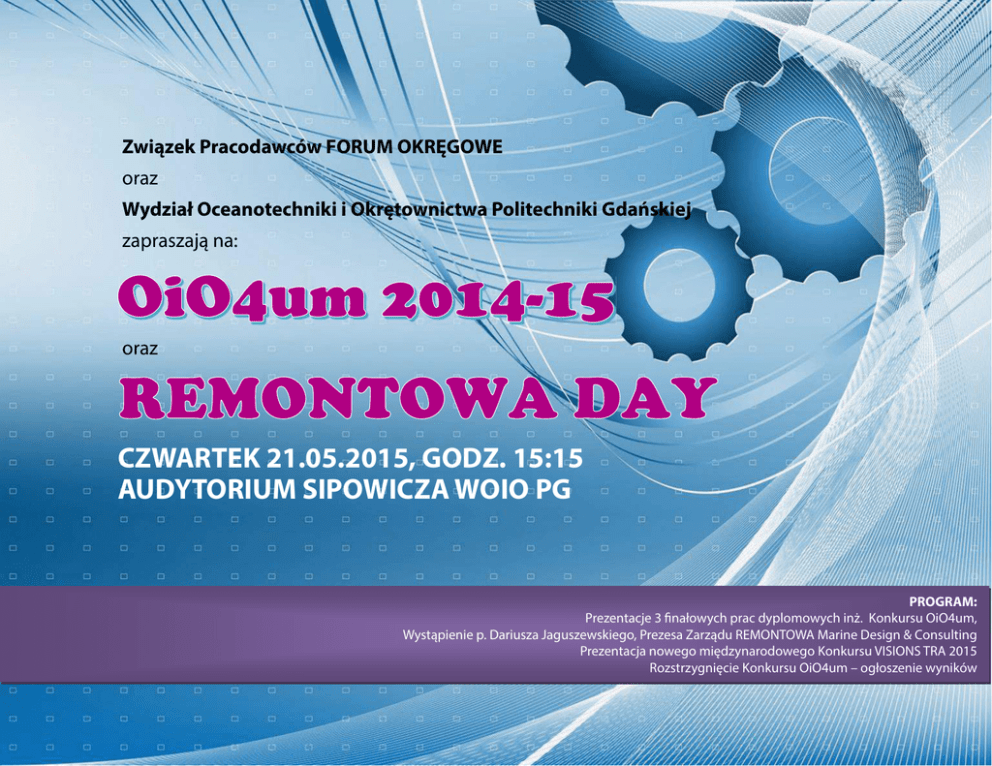 Związek Pracodawców FORUM OKRĘGOWE oraz Wydział Oceanotechniki i Okrętownictwa Politechniki Gdańskiej zapraszają na: oraz CZWARTEK 21.05.2015, GODZ. 15:15 AUDYTORIUM SIPOWICZA WOIO PG PROGRAM: Prezentacje 3 finałowych prac dyplomowych inż. Konkursu OiO4um, Wystąpienie p. Dariusza Jaguszewskiego, Prezesa Zarządu REMONTOWA Marine Design & Consulting Prezentacja nowego międzynarodowego Konkursu VISIONS TRA 2015 Rozstrzygnięcie Konkursu OiO4um – ogłoszenie wyników W dniu 21 maja br. odbył się Finał Konkursu "OiO4um" na najlepszą prace inżynierską obronioną na Wydziale Oceanotechniki i Okrętownictwa Politechniki Gdańskiej Zwycięzcą Konkursu został: inż. Tomasz Bielecki za pracę roweru wodnego”. „Projekt regatowego Finalistami Konkursu zostali: - inż. Dawid Stecki za pracę - „Projekt konstrukcji kadłuba śródlądowego katamaranu pasażerskiego” - inż. Dawid Zaniewski za pracę - „Projekt wstępny turbozespołu dużej mocy na pary czynnika niskowrzącego w oparciu o ciepło termiczne oceanów”. Nagrody dla Zwycięzcy i Finalistów, 3 miesięczne płatne staże, ufundowali następujący członkowie FORUM OKRĘTOWEGO: ALUSHIP TECHNOLOGY - stocznia produkcyjna DELTAMARIN - biuro projektowe POLSKI REJESTR STATKÓW - towarzystwo klasyfikacyjne Zwycięzcy i Finalistom Konkursu "OiO4um" życzymy dalszych sukcesów.