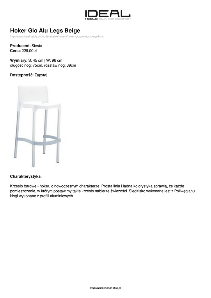 Hoker Gio Alu Legs Beige http://www.idealmeble.pl/pl/offer/meble/hokery/hoker-gio-alu-legs-beige.html/ Producent: Siesta Cena: 229.00 zł Wymiary: S: 45 cm | W: 96 cm długość nóg: 75cm, rozstaw nóg: 39cm Dostępność: Zapytaj Charakterystyka: Krzesło barowe - hoker, o nowoczesnym charakterze. Prosta linia i ładna kolorystyka sprawią, że każde pomieszczenie, w którym postawimy takie krzesło nabierze świeżości. Siedzisko wykonane jest z Poliwęglanu. Nogi wykonane z profili aluminiowych http://www.idealmeble.pl Dostępne wersje produktu: nazwa produktu HOKER GIO warianty kolor beż cena 229.00zł dostępne Zapytaj HOKER GIO kolor czarny 229.00zł Zapytaj HOKER GIO kolor biały 229.00zł Zapytaj HOKER GIO kolor zielony 229.00zł Zapytaj HOKER GIO kolor pomarańczowy 229.00zł Zapytaj HOKER GIO kolor czerwony Zapytaj 229.00zł http://www.idealmeble.pl Zdjęcia produktu: http://www.idealmeble.pl Powered by TCPDF (www.tcpdf.org)