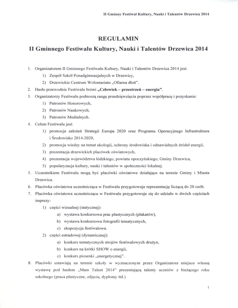 II Gminny Festiwal Kultury, Nauki i Talentów Drzewka 2014 REGULAMIN II Gminnego Festiwalu Kultury, Nauki i Talentów Drzewica 2014 1. Organizatorem II Gminnego Festiwalu Kultury, Nauki i Talentów Drzewica 2014 jest: 1) Zespół Szkół Ponadgimnazjalnych w Drzewicy, 2) Drzewickie Centrum Wolontariatu „Ofiarna dłoń". 2. Hasło przewodnie Festiwalu brzmi „Człowiek - przestrzeń - energia". 3. Organizatorzy Festiwalu podnoszą rangę przedsięwzięcia poprzez współpracę i pozyskanie: 1) Patronów Honorowych, 2) Patronów Naukowych, 3) Patronów Medialnych. 4. Celem Festiwalu jest: 1) promocja założeń Strategii Europa 2020 oraz Programu Operacyjnego Infrastruktura i Środowisko 2014-2020, 2) promocja wiedzy na temat ekologii, ochrony środowiska i odnawialnych źródeł energii, 3) prezentacja drzewickich placówek oświatowych, 4) prezentacja województwa łódzkiego, powiatu opoczyńskiego, Gminy Drzewica, 5) popularyzacja kultury, nauki i talentów w społeczności lokalnej. 5. Uczestnikiem Festiwalu mogą być placówki oświatowe działające na terenie Gminy i Miasta Drzewica. 6. Placówka oświatowa uczestnicząca w Festiwalu przygotowuje reprezentację liczącą do 20 osób. 7. Placówka oświatowa uczestnicząca w Festiwalu przygotowuje się do udziału w dwóch częściach imprezy: 1) części wizualnej (statycznej): a) wystawa konkursowa prac plastycznych (plakatów), b) wystawa konkursowa fotografii tematycznych, c) ekspozycja festiwalowa. 2) części estradowej (dynamicznej): a) konkurs tematycznych strojów festiwalowych drużyn, b) konkurs na krótki SHOW o energii, c) konkurs piosenki „energetycznej". 8. Placówki ustawiają na terenie szkoły w wyznaczonym przez Organizatora miejscu własną wystawę pod hasłem „Mam Talent 2014" prezentującą talenty uczniów z bieżącego roku szkolnego (praca plastyczne, zdjęcia, dyplomy itd.) l II Gminny Festiwal Kultury, Nauki i Talentów Drzewica 2014 9. Placówki uczestniczące w Festiwalu rywalizują ze sobą (bez podziału na kategorię wiekową) o zdobycie dwóch nagród: 1) Grand Prix Festiwalu, 2) Nagrody Publiczności. 10. W ramach Festiwalu zostaną zorganizowane i przeprowadzone konkursy: 1) konkurs plastyczny „Człowiek - przestrzeń - energia" (konkurs indywidualny), 2) konkurs fotograficzny „Człowiek - przestrzeń - energia" (konkurs indywidualny), 3) konkurs ekspozycji festiwalowych, 4) konkurs strojów drużyn, 5) konkurs na krótką lekcję o energii, 6) konkurs piosenki „energetycznej". 11. Konkursy, o których mowa w pkt. 8 zostaną zorganizowane i przeprowadzone zgodnie z wytycznymi, które stanowią załącznik do Regulaminu. 12. Termin dostarczenia prac konkursowych (zdjęć i plakatów) - do dnia 21.03.2014 13. Rozstrzygnięcia konkursu dokona jury składające się, z co najmniej 5 osób powołane przez Organizatora. 14. W skład jury mogą być powołani Goście Honorowi z wyłączeniem: 1) przedstawicieli szkół biorących udział w Festiwalu, 2) organów prowadzących (Starostwo Powiatowe w Opocznie, Gmina i Miasto Drzewica). 15. Jury rozstrzygając konkurs jest zobowiązane stosować się do przygotowanych przez Organizatora kryteriów oceny, które stanowią załącznik do Regulaminu. 16. Nagrody przewidziane są dla najaktywniejszych placówek oświatowych, które w rankingu uzyskaj ą największą liczbę punktów, jednak nie mniej niż 6 punktów. 17. Biorąc udział w Festiwalu uczestnicy wyrażają zgodę na zastosowanie się do niniejszego Regulaminu. ^°, D Y R E K T O R ZESPÓŁ SZKÓŁ PONADGIMNAZJALNYCH ^^-<w Drzewicy CENT ICKIE TARIATU ^f^^^..3tr~^J ragr KRÓL AJNTDRZEj' Zespół Szkół Ponadgimnazjalnych w Drzewicy ZESPÓŁ SZKÓŁ PONADGIMNAZJALNYCH w Drzewicy ul. Staszica 5, 26-340 Drzewica te). (048) 3756089, tel./fax (0-X8) 3758488 NIP: 799-14-68-586; REG. 000028501 Drzewickie Centrum Wolontariatu „Ofiarna dłoń" DRZEWICKIE CENTRUM WOLONTARIATU "Ofiarna dloń" 26-340 Drzewica, ul. Stanisława Staszica 5 KRS: 0000377275, [email protected] NIP: 7^81825342, REGON: 101032737 II Gminny Festiwal Kultury, Nauki i Talentów Drzewica 2014 Załącznik do Regulaminu II Gminnego Festiwalu Kultury, Nauki i Talentów Drzewica 2014 WYTYCZNE DO KONKURSÓW w ramach II Gminnego Festiwalu Kultury, Nauki i Talentów Drzewica 2014 Konkurencje 1. 2. 3. konkurs plastyczny „ Człowiek przestrzeń — energia " konkurs fotograficzny „ Człowiek — przestrzeń energia " konkurs ekspozycji festiwalowych Zasady Poszczególne placówki eksponują po 4 najlepsze prace ze wskazaniem szkolnego zwycięzcy. Jury porównuje tylko prace „wskazane", wybiera jednego zwycięzcę. „Praca konkursowa" składa się z dwóch elementów: 1. plakat 2. „przesłanie" (autor załącza pisemne, kilkuzdaniowe omówienie idei / przesłania / koncepcji swojej pracy w formie motta / cytatu / refleksji, itp.) Poszczególne placówki eksponuj ą po 4 najlepsze prace ze wskazaniem szkolnego zwycięzcy. Jury porównuje tylko prace „wskazane", wybiera jednego zwycięzcę. „Praca konkursowa" składa się z dwóch elementów: 1. plakat 2. „przesłanie" (autor załącza pisemne, kilkuzdaniowe omówienie idei / przesłania / koncepcji swojej pracy w formie motta / cytatu / refleksji, itp.) konkurs strojów drużyn konkurs na krótki SHOW o energii konkurs piosenki „energetycznej" RAZEM: (max. 4 p.) 3-2-1 za m-ce +1 za udział (max. 4 p.) (max. 12 p.) (max. 9 p.) Każda placówka demonstruje pomysł na przeprowadzenie „pokazu"/ "warsztatów"/ "konkursu"/ "showu" - dla zgromadzonej publiczności (dotyczącego oczywiście tematyki związanej z energią, energetyką, ekologią). Czas do dyspozycji - 5 minut. Zalecana możliwość zastosowania dodatkowo prezentacji multimedialnej (w trakcie występu). 6. +1 za udział Każda placówka demonstruje „strój drużynowy" nawiązujący do idei imprezy (skojarzenia np. z: mocą, energią, siłą, zdrowiem, ekologią, żywotnością, temperamentem...). Czas preze