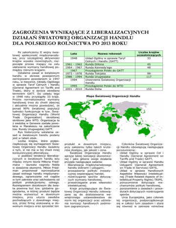 ZAGROśENIA WYNIKAJĄCE Z LIBERALIZACYJNYCH DZIAŁAŃ ŚWIATOWEJ ORGANIZACJI HANDLU DLA POLSKIEGO ROLNICTWA PO 2013 ROKU Po zakończeniu II wojny światowej społeczność międzynarodowa, przy szczególnej aktywności krajów wysoko rozwiniętych, rozpoczęła proces mający na celu ułatwianie wymiany handlowej pomiędzy róŜnymi krajami. Ustalanie zasad w światowym handlu w okresie powojennym zainicjowano powołaniem w 1947 roku, w Hawanie, Układu Ogólnego w sprawie Taryf Celnych i Handlu (General Agreement on Tariffs and Trade), który w skrócie określano terminem GATT. Do układu tego w 1948 roku przystąpiły 33 kraje. Proces normalizowania wymiany handlowej trwa do chwili obecnej i aktualnie moŜna powiedzieć, Ŝe ponad 90% światowej populacji ludności funkcjonuje w tzw. Światowej Organizacji Handlu (World Trade Organization) określanej skrótowo jako WTO. Organizacja ta z siedzibą w Genewie została powołana w Marakeszu na zakończenie tzw. Rundy Urugwajskiej GATT. Rys historyczny ustalania zasad w światowym handlu podany jest w tabeli obok. Liczba krajów, które podporządkowują się wymaganiom Światowej Organizacji Handlu świadczy o tym, iŜ nie ma w tej chwili innej konkurencyjnej alternatywy. U podstaw tendencji liberalizacyjnych w światowym handlu leŜy między innymi teoria Miltona Friedmana - laureata nagrody Nobla w dziedzinie ekonomii. Milton Friedman proponował wprowadzanie zasad wolnego handlu międzynarodowego, ograniczanie roli rządów w tym zakresie oraz odchodzenie od polityki protekcjonizmu celnego. Rozwiązaniem docelowym dla świata powinna być tzw. globalna gospodarka, w której produkt będzie moŜna wytworzyć w dowolnym miejscu, przy uŜyciu zasobów pochodzących z dowolnego miejsca, przez firmę ulokowaną w dowolnym miejscu oraz sprzedać ten Lata 1948 1961 - 1962 1964 - 1967 1967 1973 - 1976 1986 - 1994 1994 1995 2001 - 2010 Nazwa rokowań Układ Ogólny w sprawie Taryf Celnych i Handlu (GATT) Runda Dillona Runda Kennedy'ego Przystąpienie Polski do GATT Runda Tokijska Runda Urugwajska Utworzenie Światowej Organizacji Handlu Przystąpienie Polski do WTO Runda Doha Liczba krajów uczestniczących 33 45 48 99 117 153 Mapa Światowej Organizacji Handlu produkt w dowolnym miejscu, przy załoŜeniu tylko takich kryteriów dostępu, jak jakość i cena. Światowa Organizacja Handlu sprzyja takiej koncepcji ekonomicznej i jako główne swoje działania przyjęła następujące zadania: - liberalizacja międzynarodowego handlu dobrami i usługami, - prowadzenie polityki inwestycyjnej wspierającej handel, - rozstrzyganie sporów dotyczących wymiany handlowej, - przestrzeganie praw własności intelektualnej. Kraje przystępujące do Światowej Organizacji Handlu zobowiązane są do dostosowania wewnętrznego ustawodawstwa do norm tej organizacji oraz udzielania koncesji handlowych podmiotom zagranicznym. Członków Światowej Organizacji Handlu obowiązują następujące porozumienia: - Układ Ogólny w sprawie Ceł i Handlu (General Agreement on Tariffs and Trade) GATT, - Układ Ogólny w sprawie Handlu Usługami (General Agreement on Trade in Services) GATS, - Układ w sprawie Handlowych Aspektów Własności Intelektualnej (Trade Related Aspects of Intellektual Property Rights) TRIPS, - porozumienie dotyczące mechanizmów polityki handlowej, - porozumienie o zasadach i procedurach dotyczących rozstrzygania sporów. Unia Europejska, jako członek tej organizacji, podporządkowuje się w całości tym zasadom i stara się równieŜ w zakresie rolnictwa dostosowywać do oczekiwań WTO. Liberalizacja w handlu artykułami rolnymi jest bardzo trudnym procesem, jednakŜe odpowiedzią Unii Europejskiej na wypracowane w czasie trwania Rundy Urugwajskiej GATT Porozumienie dotyczące Rolnictwa (The Agreement on Agriculture) AoA było wprowadzenie tzw. reformy Mc Sharry'ego 1993 1999. Ta reforma stanowi odejście od wspierania rolnictwa poprzez dopłaty do cen produktów na rzecz wprowadzenia systemu dopłat bezpośrednich jako czynnika mającego na celu obniŜanie kosztów produkcji. Agenda 2000 obowiązująca w okresie 2000 – 2006 oraz PROW i WTO w okresie 2007 – 2013 stanowią w zasadzie kontynuację w dąŜeniu do obniŜania cen na produkty rolne, w celu zmniejszania ich róŜnic w porównaniu do cen światowych. Konieczność dostosowywania Wspólnotowej Polityki Rolnej do liberalizacji międzynarodowego handlu dobrami i usługami oraz ograniczania subwencjonowania sektora rolnego wymaga podejmowania niezbędnych reform w tej polityce. Praktycznie od 2007 roku zainicjowano tzw. health check, który oznacza Przegląd Zdrowotny Wspólnej Polityki Rolnej. WyŜej wymieniony przegląd zdrowotny wyznacza podjęcie następujących działań: - dostosowywanie Wspólnej Polityki Rolnej do wymagań Światowej Organizacji Handlu, - stopniowe wprowadzanie zasady decouplingu, czyli oddzielania płatności od produkcji, - sukcesywne wprowadzanie mechanizmu modulacji polegającego na ograniczaniu przyznawanych płatności bezpośrednich duŜym podmiotom gospodarczym i przesuwanie ich do drugiego filaru Wspólnej Polityki Rolnej, tj. PROW, - dąŜenie do wyrównywania poziomu wsparcia bezpośredniego we wszystkich krajach Unii Europejskiej, - stopniowe wdraŜanie Zasad Wzajemnej Zgodności, tj. cross compliance, które mają na celu poprawienie jakości wytwarzanej Ŝywności i ochronę środowiska naturalnego rozumianego jako dobro globalne, - wprowadzanie systemu doradztwa dla rolników korzystających z róŜnych form wsparcia unijnego. Ograniczanie subwencjonowania sektora rolnego oznaczać będzie zmniejszenie budŜetu Unii z około 40% - w 2009 roku, do niewiele ponad 30% - po roku 2013. Szacuje się, Ŝe system dopłat obecnie jest tak ustawiony, iŜ pozwala 20% gospodarstw na przechwytywanie blisko 80% subwencji. Wielkoobszarowe gospodarstwa w Francji, Niemczech i Wielkiej Brytanii uzyskują rocznie płatności po kilkadziesiąt milionów euro.