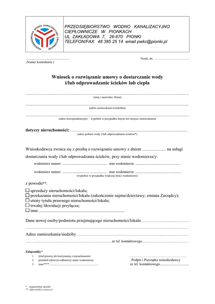 PRZEDSIĘBIORSTWO WODNO KANALIZACYJNO CIEPŁOWNICZE W PIONKACH UL. ZAKŁADOWA 7, 26-670 PIONKI TELEFON/FAX 48 385 25 14 email [email protected] ..........................................................… (Numer Pionki, dn. ………………………………. kontrahenta ) Wniosek o rozwiązanie umowy o dostarczanie wody i/lub odprowadzanie ścieków lub ciepła ................................................................................................................................................................................. .... (imię i nazwisko /firma) ..................................................................................................................................................................................... (adres zamieszkania (siedziba)) ..................................................................................................................................................................................... (adres korespondencyjny – wypełnić w przypadku innym niż miejsce zamieszkania) dotyczy nieruchomości:…...………………………........................................................................................ (adres poboru wody i/lub odprowadzania ścieków*) Wnioskodawca zwraca się z prośbą o rozwiązanie umowy z dniem .......................... na usługi dostarczania wody i/lub odprowadzania ścieków, przy stanie wodomierza/y: wodomierz numer: .................................................. stan wodomierza: .................................................. wodomierz numer: .................................................. stan wodomierza: ....................................... ........... (wypełnić w przypadku większej ilości wodomierzy) z powodu**: sprzedaży nieruchomości/lokalu; przekazania nieruchomości/lokalu (zakończenie najmu/dzierżawy; zmiana Zarządcy); utraty tytułu prawnego nieruchomości/lokalu; trwałej likwidacji przyłącza; inne ............................................................................... Dane nowej osoby/podmiotu przejmującego nieruchomości/lokalu ………………..….……………. …………………………………………………………………………………………………………….………… Adres zamieszkania/siedziby ……………………………………………………………...………………… ………...…………………………………………………….nr tel. kontaktowego………………………………… Załączniki:* 1. 2. 3. tytuł prawny do korzystania z nieruchomości protokół zdawczo-odbiorczy stanu wodomierza inne**** ...............................................................… * niepotrzebne skreślić ** odpowiednie zaznaczyć …………………………………………………... \Podpis i Pieczątka wnioskodawcy nr tel. kontaktowego................................