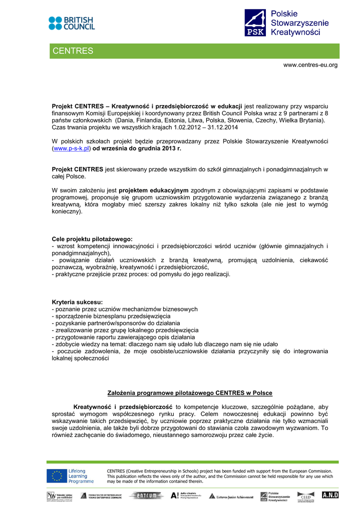 CENTRES www.centres-eu.org Projekt CENTRES – Kreatywność i przedsiębiorczość w edukacji jest realizowany przy wsparciu finansowym Komisji Europejskiej i koordynowany przez British Council Polska wraz z 9 partnerami z 8 państw członkowskich (Dania, Finlandia, Estonia, Litwa, Polska, Słowenia, Czechy, Wielka Brytania). Czas trwania projektu we wszystkich krajach 1.02.2012 – 31.12.2014 W polskich szkołach projekt będzie przeprowadzany przez Polskie Stowarzyszenie Kreatywności (www.p-s-k.pl) od września do grudnia 2013 r. Projekt CENTRES jest skierowany przede wszystkim do szkół gimnazjalnych i ponadgimnazjalnych w całej Polsce. W swoim założeniu jest projektem edukacyjnym zgodnym z obowiązującymi zapisami w podstawie programowej, proponuje się grupom uczniowskim przygotowanie wydarzenia związanego z branżą kreatywną, która mogłaby mieć szerszy zakres lokalny niż tylko szkoła (ale nie jest to wymóg konieczny). Cele projektu pilotażowego: - wzrost kompetencji innowacyjności i przedsiębiorczości wśród uczniów (głównie gimnazjalnych i ponadgimnazjalnych), - powiązanie działań uczniowskich z branżą kreatywną, promującą uzdolnienia, ciekawość poznawczą, wyobraźnię, kreatywność i przedsiębiorczość, - praktyczne przejście przez proces: od pomysłu do jego realizacji. Kryteria sukcesu: - poznanie przez uczniów mechanizmów biznesowych - sporządzenie biznesplanu przedsięwzięcia - pozyskanie partnerów/sponsorów do działania - zrealizowanie przez grupę lokalnego przedsięwzięcia - przygotowanie raportu zawierającego opis działania - zdobycie wiedzy na temat: dlaczego nam się udało lub dlaczego nam się nie udało - poczucie zadowolenia, że moje osobiste/uczniowskie działania przyczyniły się do integrowania lokalnej społeczności Założenia programowe pilotażowego CENTRES w Polsce Kreatywność i przedsiębiorczość to kompetencje kluczowe, szczególnie pożądane, aby sprostać wymogom współczesnego rynku pracy. Celem nowoczesnej edukacji powinno być wskazywanie takich przedsięwzięć, by uczniowie poprzez praktyczne działania nie tylko wzmacniali swoje uzdolnienia, ale także byli dobrze przygotowani do stawiania czoła zawodowym wyzwaniom. To również zachęcanie do świadomego, nieustannego samorozwoju przez całe życie. CENTRES (Creative Entrepreneurship in Schools) project has been funded with support from the European Commission. This publication reflects the views only of the author, and the Commission cannot be held responsible for any use which may be made of the information contained therein. CENTRES www.centres-eu.org Według klasycznej definicji, opracowanej przez brytyjskie Ministerstwo Kultury, Mediów i Sportu, do sektorów kreatywnych zalicza się przedsiębiorstwa, które opierają swoją działalność na eksploatacji własności intelektualnej wytworzonej dzięki wykorzystaniu kreatywności, umiejętności i talentów swoich pracowników. Wymienia się w tej grupie łącznie trzynaście sektorów gospodarki, wśród nich: reklamę, architekturę, sztukę i antyki, gry komputerowe, rękodzieło, wzornictwo (design), projektowanie mody, film i wideo, muzykę, sztukę teatralną, poligrafię, oprogramowanie, telewizję i radio. W tych obszarach powinny być realizowane projekty uczniowskie. Projekt CENTRES chce promować taki rodzaj aktywności edukacyjnej, która wychodzi poza mury szkoły, jest z jednej strony przygodą, z drugiej ma swój wymiar użyteczności publicznej. Organizacja lokalnego działania takiego jak np. pokaz mody, festiwal teatralny czy filmowy, benefis lokalnego artysty, koncert muzyczny pozwoli młodym ludziom inaczej spojrzeć na mechanizmy biznesowe, będzie kształcić sprawności i umiejętności typowe dla postaw przedsiębiorczych. Poznają motywy aktywności gospodarczej, sporządzą biznes plan przedsięwzięcia, będą pozyskiwać partnerów dla swoich działań. Nowatorski wymiar projektu to jego dostosowanie do wyzwań współczesnego świata, promowanie strategii edukacyjnej, czyli metody projektu i jej zastosowania w lokalnym działaniu, i tym samym uatrakcyjnienie procesu edukacyjnego. Projekt CENTRES chciałby wzmocnić kompetencje potrzebne młodym ludziom na rynku pracy. Młodzi ludzie rozwijając swoje kompetencje przedsiębiorcze, powinni łatwiej dokonywać wyboru drogi życiowej. Uczniowie poznają mechanizmy pracy zespołowej, będą potrafili przydzielać role w zespole, nauczą się rozwiązywania problemów, budowania strategii biznesowej, reklamy i promocji. Spróbują połączyć swoje osobiste pasje z użytecznym działaniem. Strategia edukacyjna jaką jest metoda projektu lokalnego działania jest jedną z najbardziej pożądanych obecnie w systemie edukacyjnym. Podnosi jakość i efektywność nauczania. Jest metodą pracy zapisaną w podstawie programowej tak gimnazjum, jak i szkoły ponadgimnazjalnej. Założenia badawcze: Projekt CENTRES ma ambicje mieć również swój wymiar badawczy i chciałby odnieść się do dwóch głównych problemów: Jakie czynniki wspierają podejmowanie przez uczniów przedsięwzięć społecznych /przedsiębiorczych? W jaki sposób polski system kształcenia rozwija takie kompetencje i umiejętności jak: kreatywność, umiejętność generowania i analizy problemów, praca metodą projektu, praca zespołowa, które pomagają w procesie tworzenia innowacji? Cel badań: porównanie kompetencji innowacyjności i przedsiębiorczości wśród uczniów w skali kraju i we wszystkich krajach partnerskich biorących udział w projekcie CENTRES. Wydaje się, że szkoła powinna być miejscem, gdzie uczniowie mogą podejmować różne akcje na podstawie ujawnionych przez siebie możliwości i dobrych pomysłów, zwłaszcza, gdy są one wartościowe dla innych. W taki sposób kształtują się bowiem dwie ważne kompetencje kluczowe: innowacyjność i przedsiębiorczość. By mogły być one wzmacniane, uczniowie powinni by