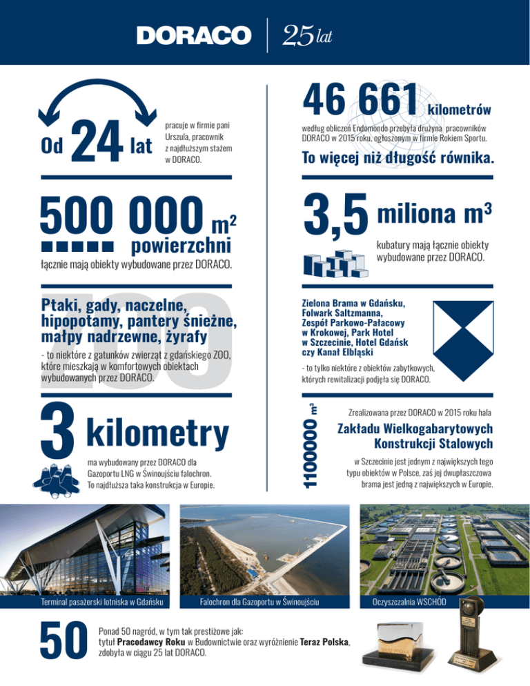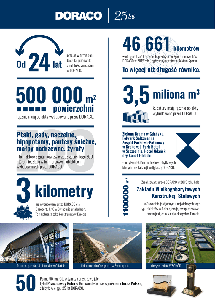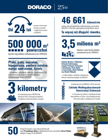Od 24 lat pracuje w firmie pani Urszula, pracownik z najdłuższym stażem w DORACO. 500 000 m powierzchni 2 46 661 według obliczeń Endomondo przebyła drużyna pracowników DORACO w 2015 roku, ogłoszonym w firmie Rokiem Sportu. To więcej niż długość równika. 3,5 łącznie mają obiekty wybudowane przez DORACO. Ptaki, gady, naczelne, hipopotamy, pantery śnieżne, małpy nadrzewne, żyrafy kubatury mają łącznie obiekty wybudowane przez DORACO. Zielona Brama w Gdańsku, Folwark Saltzmanna, Zespół Parkowo-Pałacowy w Krokowej, Park Hotel w Szczecinie, Hotel Gdańsk czy Kanał Elbląski - to tylko niektóre z obiektów zabytkowych, których rewitalizacji podjęła się DORACO. kilometry ma wybudowany przez DORACO dla Gazoportu LNG w Świnoujściu falochron. To najdłuższa taka konstrukcja w Europie. Terminal pasażerski lotniska w Gdańsku 50 1100000 m 3 miliona m3 3 - to niektóre z gatunków zwierząt z gdańskiego ZOO, które mieszkają w komfortowych obiektach wybudowanych przez DORACO. kilometrów Zrealizowana przez DORACO w 2015 roku hala Zakładu Wielkogabarytowych Konstrukcji Stalowych w Szczecinie jest jednym z największych tego typu obiektów w Polsce, zaś jej dwupłaszczowa brama jest jedną z największych w Europie. Falochron dla Gazoportu w Świnoujściu Ponad 50 nagród, w tym tak prestiżowe jak: tytuł Pracodawcy Roku w Budownictwie oraz wyróżnienie Teraz Polska, zdobyła w ciągu 25 lat DORACO. Oczyszczalnia WSCHÓD