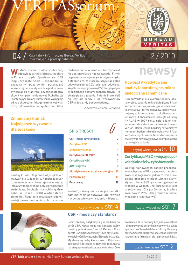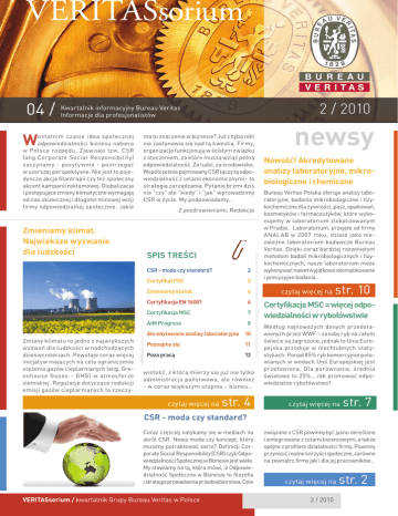 VERITASsorium 04 / 2 / 2010 Kwartalnik informacyjny Bureau Veritas Informacje dla profesjonalistów W ostatnim czasie idea społecznej odpowiedzialności biznesu nabiera w Polsce rozpędu. Zjawisko tzw. CSR (ang.Corporate Social Responsibility) zaczynamy - pozyty wnie - postrzegać w szerszej perspektywie. Nie jest to pojedyncza akcja filantropii czy też społeczny akcent kampanii reklamowej. Globalizacja i postępujące zmiany klimatyczne wymagają od nas skutecznej i długoterminowej wizji firmy odpowiedzialnej społecznie. Jakie Zmieniamy klimat. Największe wyzwanie dla ludzkości ma to znaczenie w biznesie? Już chyba nikt nie zastanawia się nad tą kwestią. Firmy, organizacje funkcjonują w ścisłym związku z otoczeniem, za które muszą wziąć pełną odpowiedzialność. Za ludzi, za środowisko. Współcześnie pojmowany CSR łączy tą odpowiedzialność z celami ekonomicznymi - to strategia zarządzania. Pytanie brzmi dziś nie “czy” ale “kiedy” i “jak” wprowadzimy CSR w życie. My podpowiadamy… Z pozdrowieniami, Redakcja SPIS TREŚCI CSR - moda czy standard? 2 Certyfikat FSC 3 Zmieniamy klimat 4 Certyfikacja EN 16001 6 Certyfikacja MSC 7 AIM Progress 8 Akredytowane analizy laboratoryjne 10 Zmiany klimatu to jedno z największych wyzwań dla ludzkości w nadchodzących dziesięcioleciach. Powstaje coraz więcej inicjatyw mających na celu ograniczenie stężenia gazów cieplarnianych (ang. Greenhouse Gases - GHG) w atmosferze ziemskiej. Regulacje dotyczące redukcji emisji gazów cieplarnianych to rzeczy- Poznajmy się 11 Poza pracą 12 wistość, z którą mierzy się już nie tylko administracja państwowa, ale również - w coraz większym stopniu - biznes… czytaj więcej na str. 4 newsy Nowość! Akredytowane analizy laboratoryjne, mikrobiologiczne i chemiczne Bureau Veritas Polska oferuje analizy laboratoryjne, badania mikrobiologiczne i fizykochemiczne dla żywności, pasz, opakowań, kosmetyków i farmaceutyków, które wykonujemy w laboratorium zlokalizowanym w Pradze. Laboratorium, przejęte od firmy ANALAB w 2007 roku, działa jako niezależne laboratorium badawcze Bureau Veritas. Dzięki coraz bardziej rozwiniętym metodom badań mikrobiologicznych i fizykochemicznych, nasze laboratorium może wykonywać nawet wyjątkowo skomplikowane i precyzyjne badania… czytaj więcej na str. 10 Certyfikacja MSC = więcej odpowiedzialności w rybołówstwie Według najnowszych danych przedstawionych przez WWF – zasoby ryb na całym świecie są zagrożone, jednak to Unia Europejska przoduje w niechlubnych statystykach. Ponad 85% ryb komercyjnie poławianych w wodach Unii Europejskiej jest przełowiona. Dla porównania, średnia światowa to 25%...Jak promować odpowiedzialne rybołówstwo? czytaj więcej na str. 7 CSR - moda czy standard? Coraz częściej natykamy się w mediach na skrót CSR. Nowa moda czy koncept, który musimy potraktować serio? Definicji Corporate Social Responsibility (CSR) czyli Odpowiedzialności Społecznej w Biznesie jest wiele. My stawiamy na tą, która mówi, iż Odpowiedzialność Społeczna w Biznesie to filozofia i strategia prowadzenia przedsiębiorstwa. Cele VERITASsorium / kwartalnik Grupy Bureau Veritas w Polsce związane z CSR powinny być jasno określone i zintegrowane z celami biznesowymi, a także spójne z profilem działalności firmy. Powinny przynosić realne korzyści społeczne, zarówno na zewnątrz firmy jak i dla jej pracowników… czytaj więcej na 2 / 2010 str. 2 Wieści ze świata CSR - moda czy standard? Systemowe podejście do realizacji polityki CSR Coraz częściej natykamy się w mediach na skrót CSR. Nowa moda czy koncept, który musimy potraktować serio? Definicji Corporate Social Responsibility (CSR), czyli Odpowiedzialności Społecznej w Biznesie, jest wiele. My stawiamy na tą, która mówi, iż Odpowiedzialność Społeczna w Biznesie to filozofia i strategia prowadzenia przedsiębiorstwa. Cele związane z CSR powinny być jasno określone i zintegrowane z celami biznesowymi, a także spójne z profilem działalności firmy. Powinny przynosić realne korzyści społeczne, zarówno na zewnątrz firmy jak i dla jej pracowników. Priorytetowym zaś celem jest minimalizacja negatywnych skutków prowadzonej działalności. Systemowe podejście do CSR Dużym błędem jest traktowanie CSR jako kwestii, która obciąża firmę finansowo lub jako narzędzia polityki marketingowej i PR-owej. Istnieją oczywiście marketingowe narzędzia CSR np. cause-related marketing czyli marketing zaangażowany społecznie, który, pomimo swojej długoterminowości jest w dalszym ciągu narzędziem wynikającym ze strategii CSR. Należy zatem wyraźnie podkreślić, że CSR nie jest jednorazową inicjatywą, kosztem finansowym czy też marketingową metodą. To długofalowa inwestycja. Społeczną odpowiedzialność w biznesie należy ująć w planowaniu strategii, wizji i misji firmy, podejść do tematu w sposób systemowy. Jak to zrobić? My proponujemy wykorzystanie narzędzi naszej jednostki certyfikującej. Odpowiedzialność społeczna Działania etyczne mogą dotyczyć pracowników i ich rodzin (np. przestrzeganie czasu pracy, określanie jasnej ścieżki rozwoju, a także programy wsparcia dla pracowników 50+). Działania odpowiedzialne społecznie mogą być też ukierunkowane na klientów (np. szybkie reagowanie na niezgodności towaru, sprawne rozwiązywanie zgłoszeń reklamacyjnych) lub przejawiać się w programach edukacyjnych (np. finansowanie stypendiów, studiów czy nagród za osiągnięcia naukowe). Aby wspomóc Państwa strategię w tym obszarze, proponujemy wykorzystanie m.in.: • SA 8000 (ang. Social Accountability – Odpowiedzialność Społeczna). To pierwsza norma umożliwiająca auditowanie zakresu działalności społecznej. 2 2 / 2010 Uznana na całym świecie certyfikacja SA8000 wiąże się z opracowaniem i auditowaniem systemów zarządzania promujących praktyki pracy możli