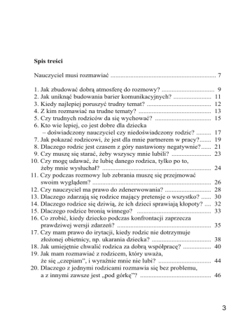 Spis treści Nauczyciel musi rozmawiać ................................................................ 7 1. Jak zbudować dobrą atmosferę do rozmowy? ................................ 9 2. Jak uniknąć budowania barier komunikacyjnych? ....................... 11 3. Kiedy najlepiej poruszyć trudny temat? ....................................... 12 4. Z kim rozmawiać na trudne tematy? ............................................ 13 5. Czy trudnych rodziców da się wychować? .................................. 15 6. Kto wie lepiej, co jest dobre dla dziecka – doświadczony nauczyciel czy niedoświadczony rodzic? ......... 17 7. Jak pokazać rodzicowi, że jest dla mnie partnerem w pracy?....... 19 8. Dlaczego rodzic jest czasem z góry nastawiony negatywnie? ...... 21 9. Czy muszę się starać, żeby wszyscy mnie lubili? ........................ 23 10. Czy mogę udawać, że lubię danego rodzica, tylko po to, żeby mnie wysłuchał? .................................................................. 24 11. Czy podczas rozmowy lub zebrania muszę się przejmować swoim wyglądem? ........................................................................ 26 12. Czy nauczyciel ma prawo do zdenerwowania? ............................ 28 13. Dlaczego zdarzają się rodzice mający pretensje o wszystko? ...... 30 14. Dlaczego rodzice się dziwią, że ich dzieci sprawiają kłopoty? .... 32 15. Dlaczego rodzice bronią winnego? ............................................. 33 16. Co zrobić, kiedy dziecko podczas konfrontacji zaprzecza prawdziwej wersji zdarzeń? ......................................................... 35 17. Czy mam prawo do irytacji, kiedy rodzic nie dotrzymuje złożonej obietnicy, np. ukarania dziecka? .................................... 38 18. Jak umiejętnie chwalić rodzica za dobrą współpracę? ................. 40 19. Jak mam rozmawiać z rodzicem, który uważa, że się „czepiam”, i wyraźnie mnie nie lubi? ................................ 44 20. Dlaczego z jednymi rodzicami rozmawia się bez problemu, a z innymi zawsze jest „pod górkę”? ........................................... 46 3 21. Dlaczego rodzice nie chcą przyjąć do wiadomości, że mają niegrzeczne dziecko? ................................................................... 22. Jak reagować, kiedy rodzic ma pretensje do nauczyciela, że dziecko sprawia problemy? ..................................................... 23. Jak reagować, kiedy rodzice ukrywają zdiagnozowane problemy dziecka? ....................................................................... 24. Czy mogę ukryć przed rodzicami problem z dzieckiem? ............ 25. Jak tłumaczyć rodzicom, że drobne wypadki zdarzają się i nie ma powodów do panikowania? ............................................ 26. Jak reagować, kiedy rodzice nie wspierają dzieci w walce z problemami? .............................................................................. 27. Kto ma znaleźć rozwiązanie problemu? ....................................... 28. Czy mogę wyolbrzymić lub ubarwić problem, żeby lepiej i szybciej dotrzeć do rodzica? ...................................................... 29. Co zrobić, kiedy mówię, a rodzic uparcie milczy? ...................... 30. Czy mam prawo pytać o osobiste sprawy rodzinne? ................... 31. Co zrobić, kiedy rodzice mają odmienne zdania na temat wychowania własnego dziecka i próbują nauczyciela przeciągnąć na swoją stronę? ....................................................... 32. Co zrobić, kiedy ja mówię jedno, a rodzic słyszy drugie? ........... 33. Co zrobić, kiedy rodzic za dużo lub za mało wymaga od dziecka? ................................................................................... 34. Jak wyleczyć rodzica z nadopiekuńczości? .................................. 35. Co robić, kiedy rodzic udaje, że nie ma problemu, i ciągle zmienia temat? ............................................................................. 36. Jak wytłumaczyć rodzicowi, że nauczyciel się nie „wtrąca”, tylko pomaga w wychowaniu? ..................................................... 37. Co mam zrobić, kiedy rodzic twierdzi, że nie pamięta wniosków z naszej rozmowy? ...................................................... 38. Jak rozmawiać, kiedy kompletnie nie zgadzam się ze światopoglądem rodzica? ........................................................ 39. Co mam zrobić, kiedy rodzic co chwilę domaga się rozmowy z dyrekcją? ................................................................................... 40. Czy mogę ignorować natrętnego rodzica? ................................... 41. Dlaczego rodzice ziewają podczas zebrań? .................................. 42. Co zrobić, kiedy podczas zebrania większość atakuje jednego z rodziców? .................................................................................. 4 49 51 53 55 58 61 64 66 68 70 72 74 75 77 79 80 82 84 85 87 89 91 43. Czy można zakazać rodzicom przyprowadzać chore dzieci do placówki? ................................................................................ 93 44. Jak odpowiadać na zarzut, że zbyt wiele dzieci przypada na jedną nauczycielkę w grupie/klasie? ....................................... 95 45. Jak reagować, kiedy mama się rozpłacze podczas rozmowy? ..... 97 46. Jak mam rozmawiać z rodzicem, który uważa, że wie więcej, bo jest starszy ode mnie? .............................................................. 98 47. Jak reagować, kiedy rodzic wciąż krytykuje moją zmienniczkę w grupie? .................................................................................... 100 48. Czy powinnam być cały czas uśmiechnięta, nawet jeśli sama mam mnóstwo problemów? ....................................................... 103 49. Czy muszą mnie obchodzić rodzinne problemy rodziców? ....... 104 50. Dlaczego rodzice boją się, że