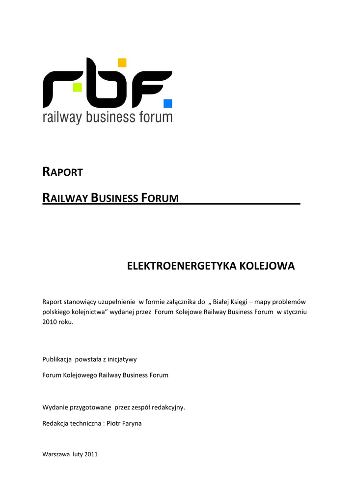 RAPORT RAILWAY BUSINESS FORUM_________________ ELEKTROENERGETYKA KOLEJOWA Raport stanowiący uzupełnienie w formie załącznika do „ Białej Księgi – mapy problemów polskiego kolejnictwa” wydanej przez Forum Kolejowe Railway Business Forum w styczniu 2010 roku. Publikacja powstała z inicjatywy Forum Kolejowego Railway Business Forum Wydanie przygotowane przez zespół redakcyjny. Redakcja techniczna : Piotr Faryna Warszawa luty 2011 2 Elektroenergetyka kolejowa SPIS TREŚCI 1. WSTĘP ....................................................................................................................................................... 4 1.1 CEL OPRACOWANIA .................................................................................................................................... 4 1.2 W IODĄCE PODMIOTY GOSPODARCZE ......................................................................................................... 5 1.2.1 PKP Energetyka................................................................................................................................ 5 1.2.2 PKP Polskie Linie Kolejowe S.A. ................................................................................................. 9 1.2.3 Inne podmioty gospodarcze ........................................................................................................ 10 2. OPIS TECHNICZNY BRANŻY ............................................................................................................... 11 2.1 ELEKTROENERGETYKA TRAKCYJNA ........................................................................................................... 12 2.2 ELEKTROENERGETYKA NIETRAKCYJNA...................................................................................................... 16 2.3 ELEKTROENERGETYKA NISKIEGO NAPIĘCIA .............................................................................................. 16 3.SYSTEMY ELEKTRONICZNO - INFORMATYCZNE W INFRASTRUKTURZE ELEKTROENERGETYKI KOLEJOWEJ ................................................................................................... 17 4. URZĄDZENIA I SYSTEMY ELEKTROENERGETYKI W INFRASTRUKTURZE KOLEJOWEJ ..... 18 5.STAN TECHNICZNY URZĄDZEŃ ......................................................................................................... 19 5.1 W IEK I PARAMETRY TECHNICZNE ............................................................................................................... 19 5.2 NOWE WYMAGANIA..................................................................................................................................... 20 6. ROZWÓJ INFRASTRUKTURY ENERGETYCZNEJ........................................................................... 21 6.1 ZAKOŃCZENIE PROCESU ELEKTRYFIKACJI ................................................................................................. 21 6.2 FINANSOWANIE MODERNIZACJI INFRASTRUKTURY ELEKTROENERGETYKI KOLEJOWEJ ............................ 22 6.3. MODERNIZACJA LINII MAGISTRALNYCH ..................................................................................................... 23 6.3.1. Sieć trakcyjna. ..................................................................................................................................... 24 6.3.2. Urządzenia zasilania sieci trakcyjnej 3kV DC. ..................................................................................... 25 6.3.3 Elektroenergetyka nietrakcyjna. .......................................................................................................... 26 6.3.4. Elektroenergetyka niskiego napięcia. ................................................................................................. 27 6.4. REALIZACJA INWESTYCJI........................................................................................................................... 27 6.5. DYLEMATY MODERNIZACJI ....................................................................................................................... 29 6.6.ELEKTROENERGETYKA KOLEJOWA NA NIEZMODERNIZOWANYCH LINIACH................................................ 30 6.7. ZASILANIE NA LINIACH MAŁOOBCIĄŻONYCH .............................................................................................. 34 7. ELEKTROENERGETYKA KOLEJOWA A KOLEJE DUŻYCH PRĘDKOŚCI ................................... 35 7.1 ANALIZA TECHNICZNA................................................................................................................................ 35 7.2 MOŻLIWOŚCI I SZANSE POLSKICH PRODUCENTÓW I USŁUGODAWCÓW . ................................................... 36 7.3 KONIECZNOŚĆ WYZNACZENIA EKSPERYMENTALNEGO ODCINKA. ............................................................. 36 7.4 ZAGROŻENIA ZWIĄZANE Z MONOPOLEM ZACHODNICH PRODUCENTÓW . ................................................... 37 7.5 KOLEJE DUŻYCH PRĘDKOŚCI A KRAJOWY SYSTEM ENERGETYCZNY......................................................... 38 8. WSPÓŁPRACA PKP PLK I PKP ENERGETYKA W ZAKRESIE ROZBUDOWY INFRASTRUKTURY ELEKTROENERGETYKI KOLEJOWEJ NA MODERNIZOWANYCH LINIACH. ....................................................................................................................................................................... 39 3 Elektroenergetyka kolejowa 9. ELEKTROENERGETYKA KOLEJOWA A ZMIANY ZWIĄZANE Z USTAWĄ O KOMERCJALIZACJI, RESTRUKTURYZACJI I PRYWATYZACJI PRZEDSIĘBIORSTWA PAŃSTWOWEGO "POLSKIE KOLEJE PAŃSTWOWE" Z DNIA 8 WRZEŚNIA 2000R. .................... 41 10.PKP ENERGETYKA A RYNEK ENERGII ELEKTRYCZNEJ ............................................................ 44 10.1 W STĘP I PODSTAWY PRAWNE DZIAŁALNOŚCI .......................................................................................... 44 10.2 POZYCJA NA RYNKU .........................................................................................................................