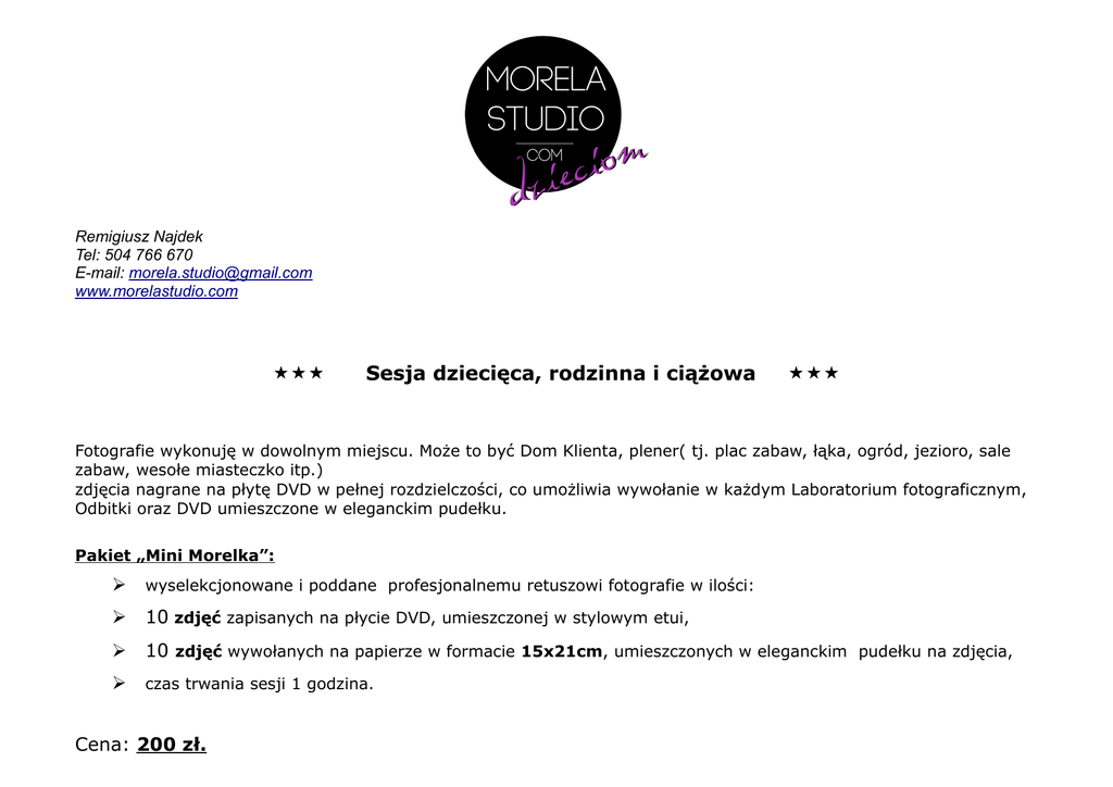 Remigiusz Najdek Tel: 504 766 670 E-mail: [email protected] www.morelastudio.com Sesja dziecięca, rodzinna i ciążowa Fotografie wykonuję w dowolnym miejscu. Może to być Dom Klienta, plener( tj. plac zabaw, łąka, ogród, jezioro, sale zabaw, wesołe miasteczko itp.) zdjęcia nagrane na płytę DVD w pełnej rozdzielczości, co umożliwia wywołanie w każdym Laboratorium fotograficznym, Odbitki oraz DVD umieszczone w eleganckim pudełku. Pakiet „Mini Morelka”: wyselekcjonowane i poddane profesjonalnemu retuszowi fotografie w ilości: 10 zdjęć zapisanych na płycie DVD, umieszczonej w stylowym etui, 10 zdjęć wywołanych na papierze w formacie 15x21cm, umieszczonych w eleganckim pudełku na zdjęcia, czas trwania sesji 1 godzina. Cena: 200 zł. Pakiet „Kwitnąca Morelka”: wyselekcjonowane i poddane profesjonalnemu retuszowi fotografie w ilości: 25 zdjęć zapisanych na płycie DVD, umieszczonej w stylowym etui, 25 zdjęć wywołanych na papierze w formacie 15x21cm, umieszczonych w eleganckim pudełku na zdjęcia, czas trwania sesji 2 godziny. Cena: 400 zł. Pakiet „Dojrzewająca Morelka”: wyselekcjonowane i poddane profesjonalnemu retuszowi fotografie w ilości: 40 zdjęć zapisanych na płycie DVD, umieszczonej w stylowym etui, 40 zdjęć wywołanych na papierze w formacie 15x21cm, umieszczonych w eleganckim pudełku na zdjęcia, czas trwania sesji 3 godziny. Cena: 600 zł. przygotowania, reportaż z mszy świętej, uroczysty obiad, zdjęcia plenerowe. Chrzest, Komunia Pakiet „Msza święta”: wyselekcjonowane i poddane profesjonalnemu retuszowi fotografie w ilości: 30 zdjęć zapisanych na płycie DVD, umieszczonej w stylowym etui, 30 zdjęć wywołanych na papierze w formacie 15x21cm, umieszczonych w eleganckim pudełku na zdjęcia. Cena: 300 zł. Pakiet „Msza święta + Uroczysty obiad”: wyselekcjonowane i poddane profesjonalnemu retuszowi fotografie w ilości: 60 zdjęć zapisanych na płycie DVD, umieszczonej w stylowym etui, 60 zdjęć wywołanych na papierze w formacie 15x21cm, umieszczonych w eleganckim pudełku na zdjęcia. Cena: 500 zł. Pakiet „Msza święta + Uroczysty obiad + Plener”: wyselekcjonowane i poddane profesjonalnemu retuszowi fotografie w ilości: 80 zdjęć zapisanych na płycie DVD, umieszczonej w stylowym etui, 80 zdjęć wywołanych na papierze w formacie 15x21cm, umieszczonych w eleganckim pudełku na zdjęcia. Cena: 600 zł. Pakiet „Przygotowania + Msza święta + Uroczysty obiad + Plener”: wyselekcjonowane i poddane profesjonalnemu retuszowi fotografie w ilości: 100 zdjęć zapisanych na płycie DVD, umieszczonej w stylowym etui, 100 zdjęć wywołanych na papierze w formacie 15x21cm, umieszczonych w eleganckim pudełku na zdjęcia. Cena: 700 zł. Istnieje możliwość zamiany poszczególnych elementów pakietów Urodziny (przyjęcia dla dzieci, 18- tki) reportaż z uroczystości urodzinowej, sesja plenerowa. Pakiet „Urodziny” (przyjęcie urodzinowe): wyselekcjonowane i poddane profesjonalnemu retuszowi fotografie w ilości: 30 zdjęć zapisanych na płycie DVD, umieszczonej w stylowym etui, 30 zdjęć wywołanych na papierze w formacie 15x21cm, umieszczonych w eleganckim pudełku na zdjęcia, czas trwania sesji 1-2 godziny. Cena: 300 zł. Pakiet „Urodziny + Plener”: wyselekcjonowane i poddane profesjonalnemu retuszowi fotografie w ilości: 60 zdjęć zapisanych na płycie DVD, umieszczonej w stylowym etui, 60 zdjęć wywołanych na papierze w formacie 15x21cm, umieszczonych w eleganckim pudełku na zdjęcia. Cena: 500 zł.