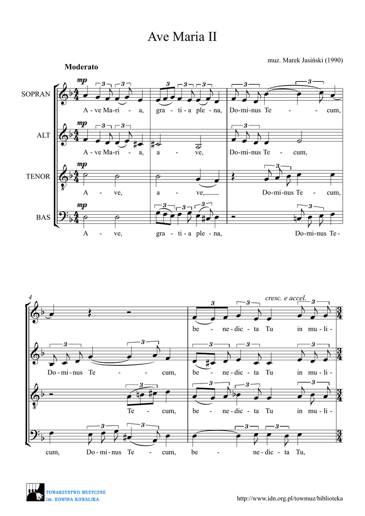 Ave Maria II muz. Marek Jasiński (1990) Moderato 3 3 ° 4 j j b SOPRAN & 4 œ œ œ œ œ œ mp A - ve Ma - ri - 3 3 j j j j jœ œœœœ œ œ œ œ œ œ œ 3 a, gra - ti - a ple - na, 3 3 4 b j & 4 œ œ œ œ œj #œ #˙ A - ve Ma - ri 4 & b4 ˙ ‹ A mp TENOR ? 4˙ BAS ¢ b4 - mp A ° &b œ 4 - - ve, ve, a ˙ 3 œ 3œ œ œ3 œ œ j œ Ó J #œ ve, - ve, - œ œ J cum, ˙ cum, Do - mi -nus Te œ - cum, j3 œ œ nœ œ J J gra - ti - a ple - na, Ó - j 3j œ œ œ œ J œ Œ 3 - Do - mi - nus Te œ Do - mi - nus Te - j j j 3 œ œ œ 4 cresc. e accel. 3 j œ œ 3 œ œ œ 3 - ne - dic - ta Tu 3 j œ #œ œ œ 3 be - ne - dic - ta Tu in mu - li - œ nœ #œ œ œ 3 Te be - ne - dic - ta Tu in mu - li - œ be Do - mi - nus Te cum, a ˙ Œ & b j j œj œ œ œ ? œ ¢ b a, ˙ ˙ 3 &b Ó ‹ - Do - mi - nus Te j 3j j œ œ œ œ mp ALT œ 3 œ j œ œ 3 - - cum, 3 3 œ œ œJ #œ J J Do - mi - nus Te 3 - cum, j œ œ cum, 3 j j j 43 œ œ œ j œ œ j 3 j œ œ bœ œ œ œ be in mu - li - œ - 3 œ œ J j 3 j 3 œ œ œ 4 J 3 œ œ J ne - dic - ta Tu, 43 http://www.idn.org.pl/towmuz/biblioteka ° 3 3 j & b4 œ œ œ 2 e - ri - bus 3 3 & b 4 œ œj œ e - ri - bus 9 - mp A - 4 & b4 ˙ mp A 4˙ & b4 ‹ A Tu 3 j 3j j j œ œ œ œ œ ˙ œ 3 3 œ œ œ œ œ ˙ J J J J et be - ne - dic - tus fruc œ œ œ J 3 be ° 4 & b4 ˙ et be - ne - dic - tus fruc - tus ven - tris et be - ne - dic - tus fruc 3 j 3 œ b œ œ & 4 ‹ e - ri - bus ? 3œ ¢ b4 - mp - U œ 3 3 j 3 j 3j j 3 j œ œ œ œ œ œ œ œ œ œ œ œ œ œ J 6 œ ne - dic ˙ ˙ ve, a ˙ ˙ ve, a ˙ ˙ ve, a - ta ˙ - ve, #œ œ Œ - - - - tus œ U œ Je - sus. 44 œ œ U œ tus Je - sus. 44 3 œ 3œ œ œ 3 œ œ œ œ œ J J J fruc - tus ven - tris Tu - U œ i, Je - sus. ∑ 44 ∑ ve, Œ 3 œ œœ˙ a œ a 3 mp 3 3 ? 4 œ œ3 œ œ œ œ œ œ œ œ3 œ œ œ œ œ 3œ œ œ J J ¢ b4 J J J J J A - ve Ma - ri - a, i, Je - sus. ve, Œ œ œ - - - 44 gra - ti - a ple - na, Do - mi - nus Te - ve, œ œ œ#œ a 3 œ nœ œ œ J - 3 ve, œ a 3j j œ œ œ œ œœ J - cum, Do - mi - nus Te - œ ve, j œ œ œ 3 - ve, œ œ - cum, http://www.idn.org.pl/towmuz/biblioteka 3 ° j b & œ œ œ œ 13 be &b - j œ #œ œ œ - j b œ œ œ & œ ‹ be - ne - dic ? ¢ bœ œ be ° &b œ 15 - 3 dic - &b œ 3 dic œ &b ‹ dic ? œ ¢ b ta j œ œ tus in Tu in - ta Tu, œ œ J 3 3 œ fruc tus fruc 3 œ J ˙ - fruc tus - fruc œ œ J œ 3 - tus e mu - li - œ Tu, 3 j œ ven - tris - œ 3 e 3 3 3 - 43 œ œ œ J 3 - œ J mu - li - in - - e j 3 j 3œ œ œ œ 4 J j œ œ 3 mu - li - 3 j j j 43 œ œ œ œ j œ œ j œ ˙ tus Tu ne - dic - ta - - 3 ne - dic - ta 3 j 3j j 3 œ œ œ œ 4 j œ œ 3 ne - dic - ta 3 be cresc. e accel. œ œ 3 Tu - ri - bus et j œ œ j 3j j œ œ œ et ri - bus œ œ œ J J J j œ œ i, œ œ tus, Je œ œ - tus, Je œ J œ ven - tris Tu œ œ J œ - i, Je 3 et 3 œ œ J ne - dic U œ œ Je be - ne 3 - œ J be - ne - ri - bus œ be j 3j j œ œ œ j œ œ 3 - - - sus. - ## 3 4 U œ ## 3 4 U œ ## 3 4 sus. sus. U œ - be - ne - sus. ## 3 4 http://www.idn.org.pl/towmuz/biblioteka Tempo I ° ## 3 p j & 4 œ œ™ œ 4 17 Sanc - ta ## 3 & 4 p Ma j œ™ œ œ Sanc - ta Ma ## 3 p nœ ™ bœ & 4 œ J ‹ Sanc - ta Ma - - - ?# 3 ¢ #4 œ ˙ p Sanc- ta, ° ##<n>˙ ™ & 23 U œ ˙ U j œ œ™ œ œ ˙ œ ˙ U j œ œ™ œ œ ˙ ri - a, Ma ri - a, Ma U œ ˙ Ma U œ œœ œœ œ ˙ sanc - ta, ∑ et ## & <n>˙ ™ ## 3 & œ œJ ˙ ‹ to - ri - bus ¢ ? ## ˙ ™ ∑ et ™ œ œ 42 œ œJ in in ho - ra f De - i, pro no - bis j œ œ ™ œ nœ ˙ o - ra pro no - bis o - ra pro no - bis pec - ca - o - ra pro no - bis 3 j j ™ b œ n œ œ œ œ # œ #œ œ œ œ™ œ œ ˙ J œ nœ #œ œ ∑ nos- trae, nœ œ ˙ ho - ra ˙ f U œ œœ œœ œ nœ ˙ #œ œ ˙ ho - ra 24 nœ ™ œJ œ œ nunc f - ter De - i, Ma - ter œ œ™ œ nœ ˙ J o - ra - ter De - i, ho - ra 42 Œ nœ nunc - ter De - i, U œ nœ ™ bœ œ ˙ J ri - a, 42 Œ #œœ f œ œ a nœ œ ∑ ˙ ∑ nos- trae, ˙ œ œ mor - tis, ˙ a mor - tis, ∑ - - - U ˙ men. men. U ˙ ˙ a men. U ˙ ˙ a ˙ U ˙ ˙ ˙ ˙ - men. http://www.idn.org.pl/towmuz/biblioteka