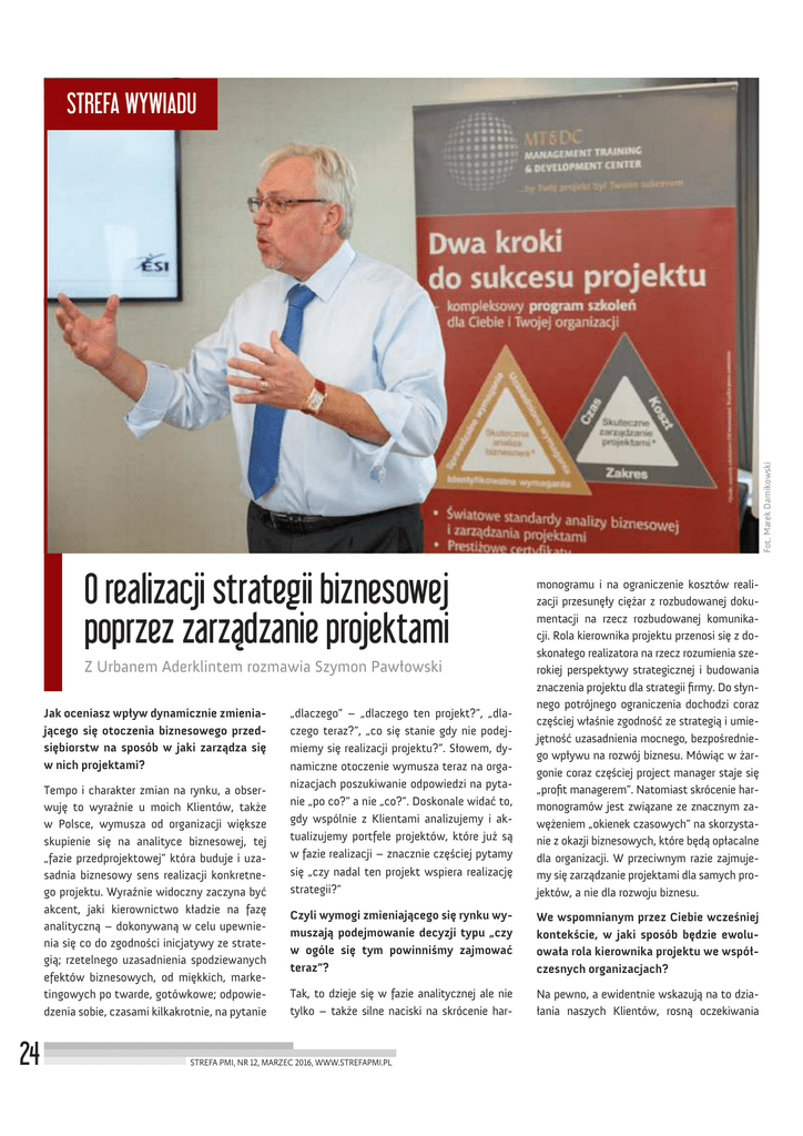 Fot. Marek Darnikowski STREFA WYWIADU O realizacji strategii biznesowej poprzez zarządzanie projektami „dlaczego” – „dlaczego ten projekt?”, „dlaczego teraz?”, „co się stanie gdy nie podejmiemy się realizacji projektu?”. Słowem, dynamiczne otoczenie wymusza teraz na organizacjach poszukiwanie odpowiedzi na pytanie „po co?” a nie „co?”. Doskonale widać to, gdy wspólnie z Klientami analizujemy i aktualizujemy portfele projektów, które już są w fazie realizacji – znacznie częściej pytamy się „czy nadal ten projekt wspiera realizację strategii?” monogramu i na ograniczenie kosztów realizacji przesunęły ciężar z rozbudowanej dokumentacji na rzecz rozbudowanej komunikacji. Rola kierownika projektu przenosi się z doskonałego realizatora na rzecz rozumienia szerokiej perspektywy strategicznej i budowania znaczenia projektu dla strategii firmy. Do słynnego potrójnego ograniczenia dochodzi coraz częściej właśnie zgodność ze strategią i umiejętność uzasadnienia mocnego, bezpośredniego wpływu na rozwój biznesu. Mówiąc w żargonie coraz częściej project manager staje się „profit managerem”. Natomiast skrócenie harmonogramów jest związane ze znacznym zawężeniem „okienek czasowych” na skorzystanie z okazji biznesowych, które będą opłacalne dla organizacji. W przeciwnym razie zajmujemy się zarządzanie projektami dla samych projektów, a nie dla rozwoju biznesu. Czyli wymogi zmieniającego się rynku wymuszają podejmowanie decyzji typu „czy w ogóle się tym powinniśmy zajmować teraz”? We wspomnianym przez Ciebie wcześniej kontekście, w jaki sposób będzie ewoluowała rola kierownika projektu we współczesnych organizacjach? Tak, to dzieje się w fazie analitycznej ale nie tylko – także silne naciski na skrócenie har- Na pewno, a ewidentnie wskazują na to działania naszych Klientów, rosną oczekiwania Z Urbanem Aderklintem rozmawia Szymon Pawłowski Jak oceniasz wpływ dynamicznie zmieniającego się otoczenia biznesowego przedsiębiorstw na sposób w jaki zarządza się w nich projektami? Tempo i charakter zmian na rynku, a obserwuję to wyraźnie u moich Klientów, także w Polsce, wymusza od organizacji większe skupienie się na analityce biznesowej, tej „fazie przedprojektowej” która buduje i uzasadnia biznesowy sens realizacji konkretnego projektu. Wyraźnie widoczny zaczyna być akcent, jaki kierownictwo kładzie na fazę analityczną – dokonywaną w celu upewnienia się co do zgodności inicjatywy ze strategią; rzetelnego uzasadnienia spodziewanych efektów biznesowych, od miękkich, marketingowych po twarde, gotówkowe; odpowiedzenia sobie, czasami kilkakrotnie, na pytanie 24 STREFA PMI, NR 12, MARZEC 2016, WWW.STREFAPMI.PL związane z rozumieniem kontekstu biznesowego przez kierowników projektów oraz umiejętności zarządzania portfelowego w całej organizacji. Oznacza to, że tradycyjna, mocno nacechowana technicznie i narzędziowo rola realizacyjna musi zostać uzupełniona o elementy strategii biznesowej – tak aby o sobie mówić, że jest się kompetentnym kierownikiem projektu powinieneś stać się bardziej przedsiębiorcą, biznesmenem. Słowem, rozwój w raczej w kierunku horyzontalnym niż wertykalnym. A jakie są Twoje sugestie dotyczące zwinnego zarządzania projektami, jak stać się bardziej zwinnym prowadząc duże projekty inwestycyjne w dużych organizacjach? Zwinność w każdej organizacji, szczególnie dużej i na dużych projektach, to intensywna komunikacja, organizowanie krótkich, częstych i dobrze przygotowanych tematycznych spotkań zamiast długich, chaotycznych narad na każdy temat. Zaangażowanie interesariuszy i dbałość o ich wymagania, częste komunikowanie i wspólne walidowanie aktualności wymagań w celu szybszej reakcji na zmianę – bez czekania na prezentację „produktu prac”, na który jedyną reakcją interesariuszy jest „…ale nie o to nam cho- dziło…”. Kierownik projektu powinien umożliwić proces „rodzenia się” wymagań w trakcie projektu, ale poprzez sprawną komunikację moderować i walidować te wymagania, aby nie doprowadzić do rozrostu zakresu – bo rozrost zakresu jest zabójczy dla sukcesu każdego projektu. To jest także pułapka zwinności, w którą wpadamy jako kierownicy projektów, chcąc zaspokoić wszystkie wymagania wszystkich interesariuszy. Raz jeszcze przypominam, że zwinne zarządzanie projektami to wciąż jest zarządzanie projektami. Reguły pozostają bez zmian. Zatem na co powinni być gotowi kierownicy projektu – w najbliższej przyszłości? Nakreśliłem to w czasie jednego z seminariów organizowanych przez PMI Warsaw Branch – na szczycie umiejętności „kierownika projektu nowej generacji” będą, a właściwie już są, wszystkie kompetencje związane z przywództwem, szczególnie w aspekcie komunikacji, wrażliwości interpersonalnej, budowania zdrowych relacji i zaufania w zespole oraz „elastyczności międzyludzkiej”, czyli zdolności adaptacji do zmiennych oczekiwań i wymagań – szczególnie we współpracy z kluczowymi interesariuszami. Wymagania najbliższej przyszłości są zgodne z ostatnio ogło- szonym przez PMI Talent Triangle™, gdzie obok kompetencji technicznych, narzędziowych, równoważną rolę grają skuteczne przywództwo i rozumienie strategii. Nie unikniemy także zwiększonych oczekiwań kierownictwa co do efektów biznesowych z realizowanych projektów, gotowości radzenia sobie ze zmianami oczekiwań i wymagań, także w zaawanasowanych fazach projektu, nacisku na jeszcze intensywniejszą komunikację z większą liczbą interesariuszy. Powinniśmy także nastawić się na pracę z jeszcze krótszymi harmonogramami i mocno ograniczonymi zasobami – stąd wymagana będzie od nas, kierowników projektów, zdolność do odpowiedzi na pytanie „czy nadal nasza firma potrzebuje efektów tego projektu dostarczanych w taki sposób?” T