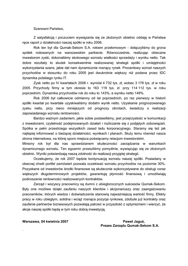 Szanowni Państwo, Z satysfakcją i poczuciem wywiązania się ze złożonych obietnic oddaję w Państwa ręce raport z działalności naszej spółki w roku 2006. Rok ten był dla Qumak-Sekom S.A. rokiem przełomowym - dołączyliśmy do grona spółek notowanych na warszawskim parkiecie. Równocześnie, realizując obiecane inwestorom zyski, dokonaliśmy skokowego wzrostu wielkości sprzedaży i wyniku netto. Tak dobre rezultaty to skutek konsekwentnie realizowanej strategii spółki i umiejętności wykorzystania szans, jakie dał nam dynamicznie rosnący rynek. Procentowy wzrost naszych przychodów w stosunku do roku 2005 jest dwukrotnie większy niż podana przez IDC dynamika polskiego rynku IT. Zysk netto po IV kwartałach 2006 r. wyniósł 4 732 tys. zł, wobec 3 176 tys. zł w roku 2005. Przychody firmy w tym okresie to 163 119 tys. zł. przy 114 112 tys. w roku poprzednim. Dynamika przychodów rok do roku to 143%, a wyniku netto 149%. Rok 2006 był całkowicie odmienny od lat poprzednich, po raz pierwszy w historii spółki kwartał po kwartale uzyskiwaliśmy dodatni wynik netto. Uzyskanie prognozowanego zysku netto, przy nieco mniejszych od prognozy obrotach, świadczy o realizacji zapowiadanego wzrostu rentowności. Bardzo ważnym zadaniem, jakie sobie postawiliśmy, jest przejrzystość w komunikacji z inwestorami, czytelność podejmowanych działań i rozliczanie się z podjętych zobowiązań. Spółka w pełni przestrzega wszystkich zasad ładu korporacyjnego. Staramy się też jak najlepiej informować o bieżącej działalności, wynikach i planach. Służy temu również nasza strona internetowa, na której sporo miejsca poświęcamy relacjom inwestorskim. Miniony rok był dla nas sprawdzianem skuteczności zarządzania w warunkach dynamicznego wzrostu. Ten egzamin przeszliśmy pomyślnie, wywiązując się ze złożonych obietnic. Wyniki potwierdzają naszą zdolność do realizacji przyjętej strategii. Oczekujemy, że rok 2007 będzie kontynuacją wzrostu naszej spółki. Posiadany w obecnej chwili portfel zamówień pozwala oczekiwać wzrostu przychodów na poziomie 30%. Pozyskane od inwestorów środki finansowe są skutecznie wykorzystywane do obsługi coraz większych długoterminowych projektów, gwarantują płynność finansową i umożliwiają podnoszenie rentowności realizowanych kontraktów. Zarząd i wszyscy pracownicy są dumni z ubiegłorocznych sukcesów Qumak-Sekom. Były one możliwe dzięki zaufaniu naszych klientów i akcjonariuszy oraz zaangażowaniu pracowników, których wiedza i doświadczenie stanowią najważniejszą wartość firmy. Efekty pracy w roku ubiegłym, solidna i wciąż rosnąca pozycja rynkowa, zdobyte już kontrakty oraz zaufanie partnerów biznesowych pozwalają patrzeć w przyszłość z optymizmem i wierzyć, że akcje naszej spółki będą w tym roku dobrą inwestycją. Warszawa, 04 kwietnia 2007 . Paweł Jaguś, Prezes Zarządu Qumak-Sekom S.A.