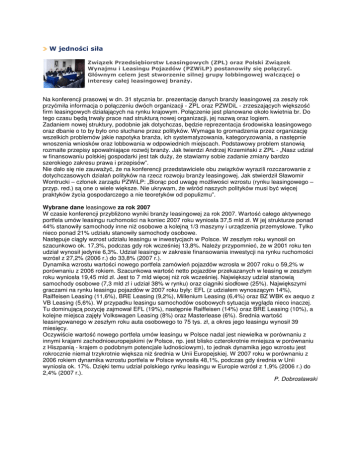 W jedności siła Związek Przedsiębiorstw Leasingowych (ZPL) oraz Polski Związek Wynajmu i Leasingu Pojazdów (PZWiLP) postanowiły się połączyć. Głównym celem jest stworzenie silnej grupy lobbingowej walczącej o interesy całej leasingowej branży. Na konferencji prasowej w dn. 31 stycznia br. prezentację danych branży leasingowej za zeszły rok przyćmiła informacja o połączeniu dwóch organizacji - ZPL oraz PZWDiL - zrzeszających większość firm leasingowych działających na rynku krajowym. Połączenie jest planowane około kwietnia br. Do tego czasu będą trwały prace nad strukturą nowej organizacji, jej nazwą oraz logiem. Zadaniem nowej struktury, podobnie jak dotychczas, będzie reprezentacja środowiska leasingowego oraz dbanie o to by było ono słuchane przez polityków. Wymaga to gromadzenia przez organizację wszelkich problemów jakie napotyka branża, ich systematyzowania, kategoryzowania, a następnie wnoszenia wniosków oraz lobbowania w odpowiednich miejscach. Podstawowy problem stanowią rozmaite przepisy spowalniające rozwój branży. Jak twierdzi Andrzej Krzemiński z ZPL - „Nasz udział w finansowaniu polskiej gospodarki jest tak duży, że stawiamy sobie zadanie zmiany bardzo szerokiego zakresu prawa i przepisów”. Nie dało się nie zauważyć, że na konferencji przedstawiciele obu związków wyrazili rozczarowanie z dotychczasowych działań polityków na rzecz rozwoju branży leasingowej. Jak stwierdził Sławomir Wontrucki – członek zarządu PZWiLP: „Biorąc pod uwagę możliwości wzrostu (rynku leasingowego – przyp. red.) są one o wiele większe. Nie ukrywam, że wśród naszych polityków musi być więcej praktyków życia gospodarczego a nie teoretyków od populizmu”. Wybrane dane leasingowe za rok 2007 W czasie konferencji przybliżono wyniki branży leasingowej za rok 2007. Wartość całego aktywnego portfela umów leasingu ruchomości na koniec 2007 roku wyniosła 37,5 mld zł. W jej strukturze ponad 44% stanowiły samochody inne niż osobowe a kolejną 1/3 maszyny i urządzenia przemysłowe. Tylko nieco ponad 21% udziału stanowiły samochody osobowe. Następuje ciągły wzrost udziału leasingu w inwestycjach w Polsce. W zeszłym roku wynosił on szacunkowo ok. 17,3%, podczas gdy rok wcześniej 13,8%. Należy przypomnieć, że w 2001 roku ten udział wynosił jedynie 6,3%. Udział leasingu w zakresie finansowania inwestycji na rynku ruchomości wzrósł z 27,2% (2006 r.) do 33,8% (2007 r.). Dynamika wzrostu wartości nowego portfela zamówień pojazdów wzrosła w 2007 roku o 59,2% w porównaniu z 2006 rokiem. Szacunkowa wartość netto pojazdów przekazanych w leasing w zeszłym roku wyniosła 19,45 mld zł. Jest to 7 mld więcej niż rok wcześniej. Największy udział stanowią samochody osobowe (7,3 mld zl i udział 38% w rynku) oraz ciągniki siodłowe (25%). Największymi graczami na rynku leasingu pojazdów w 2007 roku były: EFL (z udziałem wynoszącym 14%), Raiffeisen Leasing (11,6%), BRE Leasing (9,2%), Millenium Leasing (6,4%) oraz BZ WBK ex aequo z VB Leasing (5,6%). W przypadku leasingu samochodów osobowych sytuacja wygląda nieco inaczej. Tu dominującą pozycję zajmował EFL (19%), następnie Raiffeisen (14%) oraz BRE Leasing (10%), a kolejne miejsca zajęły Volkswagen Leasing (8%) oraz Masterlease (6%). Średnia wartość leasingowanego w zeszłym roku auta osobowego to 75 tys. zł, a okres jego leasingu wynosił 39 miesięcy. Oczywiście wartość nowego portfela umów leasingu w Polsce nadal jest niewielka w porównaniu z innymi krajami zachodnioeuropejskimi (w Polsce, np. jest blisko czterokrotnie mniejsza w porównaniu z Hiszpanią - krajem o podobnym potencjale ludnościowym), to jednak dynamika jego wzrostu jest rokrocznie niemal trzykrotnie większa niż średnia w Unii Europejskiej. W 2007 roku w porównaniu z 2006 rokiem dynamika wzrostu portfela w Polsce wynosiła 48,1%, podczas gdy średnia w Unii wyniosła ok. 17%. Dzięki temu udział polskiego rynku leasingu w Europie wzrósł z 1,9% (2006 r.) do 2,4% (2007 r.). P. Dobrosławski