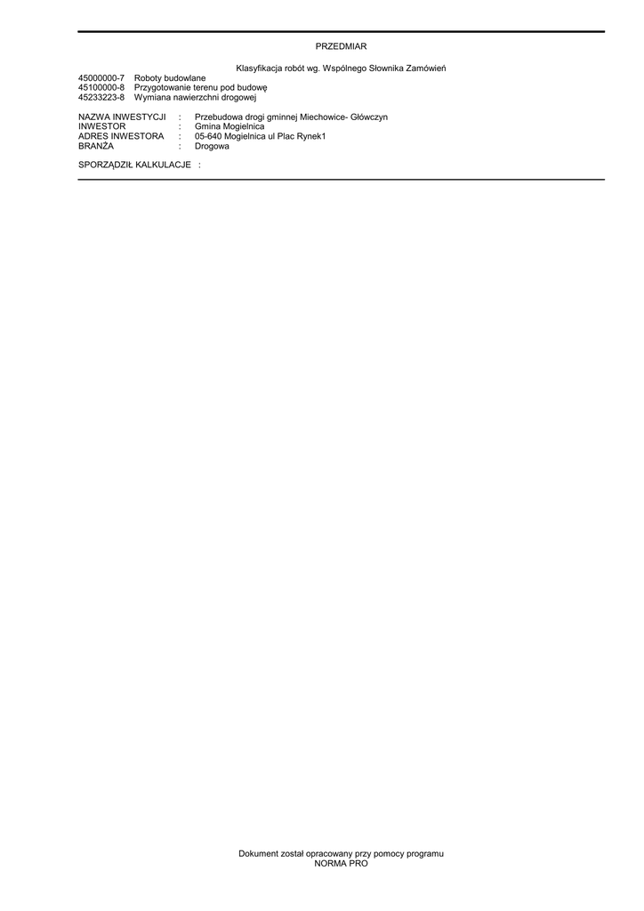 PRZEDMIAR 45000000-7 45100000-8 45233223-8 Klasyfikacja robót wg. Wspólnego Słownika Zamówień Roboty budowlane Przygotowanie terenu pod budowę Wymiana nawierzchni drogowej NAZWA INWESTYCJI INWESTOR ADRES INWESTORA BRANŻA : : : : Przebudowa drogi gminnej Miechowice- Główczyn Gmina Mogielnica 05-640 Mogielnica ul Plac Rynek1 Drogowa SPORZĄDZIŁ KALKULACJE : Dokument został opracowany przy pomocy programu NORMA PRO Mogielnica droga Miechowice Główczyn PRZEDMIAR Lp. Podstawa Opis i wyliczenia Przebudowa drogi Miechowice-Głowczyn 1 45100000-8 Roboty przygotowawcze 1.1 KNR 2-01 Roboty pomiarowe przy liniowych robotach ziemnych - trasa drogi w terenie 0119-03 równinnym- odtworzenie punktów wysokościowych STWIOR K. 1.1 1,035 2 45233223-8 2.1 KNR 2-31 0102-01 STWIOR K. 2.1 2.2 KNR 2-31 0102-02 STWIOR K. 2.1 2.3 KNR 2-31 0103-04 STWIOR K. 5.0 2.4 KNR 2-31 1004-06 STWIOR K. 5.0 analogia 2.5 KNR 2-31 0204-01 STWIOR K. 1.4 2.6 KNR 2-31 1004-07 STWIOR K. 5.0 km m2 1035*0,30*2 m2 Razem 1,035 RAZEM 1,035 621,000 RAZEM 621,000 621,000 RAZEM 621,000 4 140,000 RAZEM 4 140,000 4 140,000 RAZEM 4 140,000 4 140,000 RAZEM 4 140,000 4 140,000 RAZEM 4 140,000 4 140,000 RAZEM 4 140,000 4 140,000 RAZEM 4 140,000 62,100 RAZEM 62,100 82,800 RAZEM 82,800 Wykonanie koryta na poszerzeniach jezdni w gruncie kat. II-IV - za każde dal- m2 sze 5 cm głębokości koryta Krotność = 2 1035*0,30*2 m2 Mechaniczne profilowanie i zagęszczenie podłoża pod warstwy konstrukcyjne nawierzchni w gruncie kat. I-IV m2 1035*4,0 m2 Mechaniczne czyszczenie nawierzchni drogowej m2 1035*4,0 m2 Nawierzchnia z tłucznia kamiennego - warstwa dolna i górna z kamienia podkładowego - grubość po zagęszczeniu 20 cm m2 1035*4,0 m2 Skropienie nawierzchni drogowej asfaltem m2 1035*4,0 m2 m2 m2 Nawierzchnia z mieszanek mineralno-bitumicznych grysowych - warstwa ście- m2 ralna asfaltowa - grubość po zagęszcz. 4 cm KR-1 m2 1035*4,0 3 45233250-6 3.1 KNR 2-21 0218-01 STWIOR K. 6.1 Poszcz. km Nawierzchnia jezdni Wykonanie koryta na poszerzeniach jezdni w gruncie kat. II-IV - 10 cm głębokości koryta 2.7 KNR 2-31 Nawierzchnia z mieszanek mineralno-bitumicznych grysowych - warstwa wią0310-01 z.o. żąca asfaltowa - grubość po zagęszcz. 4 cm - KR-1 2.12. 990104 STWIOR K.5.1 1035*4,0 2.8 KNR 2-31 0310-05 STWIOR K. 5.2 j.m. Roboty wykończeniowe Rozścielenie ziemi urodzajnej ręczne z przerzutem na terenie płaskim m3 1035*0,30*0,10*2 m3 3.2 KNR 2-31 Wyrownanie istniejącej podbudowy tłuczniem kamiennym sortowanym z za0107-01 z.o. gęszczeniem mechanicznym - średnia grubość warstwy po zagęszczeniu do 2.12. 9901- 10 cm - roboty na poszerzeniach, przekopach lub pasach węższych niż 2.5 m 02 STWIOR K.1.4 1035*0,40*0,10*2 -2- Norma PRO Wersja 4.48 Nr seryjny: 28368 m3 m3 Mogielnica droga Miechowice Główczyn Lp. Podstawa 3.3 KNR 2-31 0702-02 STWIOR K. 7.0 3.4 KNR 2-31 0703-01 STWIOR K. 7.0 PRZEDMIAR Opis i wyliczenia Słupki do znaków drogowych z rur stalowych o śr. 70 mm - wymiana istniejacego oznakowania - wymiana istniejacego oznakowania j.m. szt. 2 szt. Poszcz. Razem 2,000 RAZEM 2,000 2,000 RAZEM 2,000 Przymocowanie tablic znaków drogowych zakazu, nakazu, ostrzegawczych, in- szt. formacyjnych o powierzchni do 0.3 m2- wymiana istniejacego oznakowania wymiana istniejącego oznakowania 2 szt. -3- Norma PRO Wersja 4.48 Nr seryjny: 28368