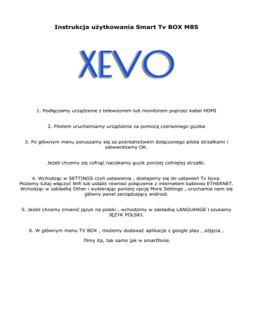 Instrukcja użytkowania Smart Tv BOX M8S 1. Podłączamy urządzenie z telewizorem lub monitorem poprzez kabel HDMI 2. Pilotem uruchamiamy urządzenie za pomocą czerwonego guzika 3. Po głównym menu poruszamy się za pośrednictwem dołączonego pilota strzałkami i zatwierdzamy OK. Jeżeli chcemy się cofnąć naciskamy guzik poniżej cofniętej strzałki. 4. Wchodząc w SETTINGS czyli ustawienia , dostajemy się do ustawień Tv boxa. Możemy tutaj włączyć Wifi lub ustalić również połączenie z internetem kablowo ETHERNET. Wchodząc w zakładkę Other i wybierając poniżej opcję More Settings , uruchamia nam się główny panel zarządzający android. 5. Jeżeli chcemy zmienić język na polski , wchodzimy w zakładkę LANGUANGE i szukamy JĘZYK POLSKI. 6. W głównym menu TV BOX , możemy dodawać aplikacje z google play , zdjęcia , filmy itp, tak samo jak w smartfonie.