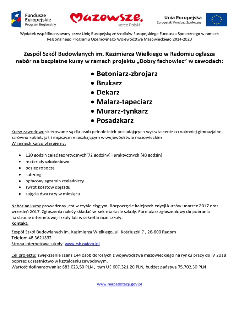 Wydatek współfinansowany przez Unię Europejską ze środków Europejskiego Funduszu Społecznego w ramach Regionalnego Programu Operacyjnego Województwa Mazowieckiego 2014‐2020 Zespół Szkół Budowlanych im. Kazimierza Wielkiego w Radomiu ogłasza nabór na bezpłatne kursy w ramach projektu „Dobry fachowiec” w zawodach: Betoniarz‐zbrojarz Brukarz Dekarz Malarz‐tapeciarz Murarz‐tynkarz Posadzkarz Kursy zawodowe skierowane są dla osób pełnoletnich posiadających wykształcenie co najmniej gimnazjalne, zarówno kobiet, jak i mężczyzn mieszkającym w województwie mazowieckim W ramach kursu oferujemy: 120 godzin zajęć teoretycznych(72 godziny) i praktycznych (48 godzin) materiały szkoleniowe odzież roboczą catering opłacony egzamin czeladniczy zwrot kosztów dojazdu zajęcia dwa razy w miesiącu Nabór na kursy prowadzony jest w trybie ciągłym. Rozpoczęcie kolejnych edycji kursów: marzec 2017 oraz wrzesień 2017. Zgłoszenia należy składać w sekretariacie szkoły. Formularz zgłoszeniowy do pobrania na stronie internetowej szkoły lub w sekretariacie szkoły. Kontakt: Zespół Szkół Budowlanych im. Kazimierza Wielkiego, ul. Kościuszki 7 , 26‐600 Radom Telefon: 48 3621832 Strona internetowa szkoły: www.zsb.radom.ipl Cel projektu: zwiększenie szans 144 osób dorosłych z województwa mazowieckiego na rynku pracy do IV 2018 poprzez uczestnictwo w kształceniu zawodowym. Wartość dofinansowania: 683.023,50 PLN , tym UE 607.321,20 PLN, budżet państwa 75.702,30 PLN www.mapadotacji.gov.pl