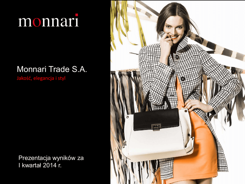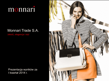 Jakość, elegancja i styl Monnari Trade S.A. Jakość, elegancja i styl Prezentacja wyników za I kwartał 2014 r. Jakość, elegancja i styl ZASTRZEŻENIE Niniejsza prezentacja (dalej Prezentacja) została przygotowana przez MONNARI TRADE S.A. (dalej Spółka) w celu prezentacji wyników za IV kwartał 2013 r. z przeznaczeniem dla akcjonariuszy Spółki, klientów oraz analityków finansowych. Prezentacja nie stanowi oferty sprzedaży, zaproszenia do złożenia oferty nabycia lub objęcia papierów wartościowych lub instrumentów finansowych, jak również Prezentacja ta nie jest jakąkolwiek poradą lub rekomendacją w odniesieniu do tychże papierów wartościowych lub innych instrumentów finansowych. Niniejsze Prezentacja może obejmować stwierdzenia dotyczące przyszłości Spółki, przyszłych planów oraz strategii lub planowanych zdarzeń. Mając na uwadze, że stwierdzenia zostały przyjęte na podstawie oczekiwań i projekcji dotyczących przyszłych wydarzeń, są one obarczone ryzykiem oraz niepewnością. Spółka nie jest zobowiązana do uaktualniania lub publicznego ogłaszania jakichkolwiek zmian, aktualizacji i modyfikacji w odniesieniu do treści zawartych w Prezentacji. Spółka ani jakikolwiek z jej przedstawicieli nie będzie ponosił odpowiedzialności za jakąkolwiek szkodę wynikającą z użycia Prezentacji lub jakichkolwiek informacji w niej zawartych lub na innej podstawie pozostającej w związku z Prezentacją. Jakość, elegancja i styl Spis treści Opis Grupy Kapitałowej Podsumowanie skonsolidowanych wyników za I kwartał 2014 Przychody Marża brutto na sprzedaży Zysk operacyjny Wynik netto Podatek dochodowy Przepływy pieniężne Plany na 2014 r. Załączniki: Nowy koncept salonu (nowy design, większa powierzchnia), Akcje marketingowe, Akcje charytatywne. Jakość, elegancja i styl Opis Grupy Kapitałowej MONNARI TRADE S.A. Grupa Kapitałowa - budowa od 2011 r. Spółka Dominująca MONNARI TRADE S.A. oraz 63 spółki zależne (100%) Pierwsza prezentacja skonsolidowanych wyników I kwartał 2014 r. Jakość, elegancja i styl Opis Grupy Kapitałowej – działalność spółek zależnych na rzecz MONNARI TRADE S.A. oraz wzajemnych usług w Grupie w zakresie: obsługi sprzedaży i dystrybucji odzieży, projektowania, nadzoru nad zakupami i produkcją, usług magazynowych i logistycznych, zarządzania zasobami ludzkimi, kompleksowej obsługi kadrowopłacowej, usług administracyjnych i informatycznych, obsługi finansowo-księgowej, wynajmu powierzchni handlowych na terenie Polski, w których zlokalizowane są salony z marką MONNARI, zarządzania nieruchomościami. Jakość, elegancja i styl Opis Grupy Kapitałowej działalność MONNARI TRADE S.A. Sprzedaż towarów sygnowanych marką MONNARI, Działania zarządcze w Grupie Kapitałowej, Działania marketingowe. Jakość, elegancja i styl Wybrane dane ze skonsolidowanego sprawozdania finansowego I kwartał 2014 I kwartał 2013 Przychody ze sprzedaży 35 055 30 560 Marża 56,5% 48,1% Zysk netto 6 091 1 113 18 482 30 026 0,73 0,35 0 0 Środki pieniężne na koniec okresu Zysk zannualizowany na jedną akcję (w zł) Zadeklarowana dywidenda Jakość, elegancja i styl Przychody i koszt własny Wzrost przychodów o 14,7% przy spadku kosztów o 3,7% Jakość, elegancja i styl Przychody – kanały dystrybucji Salony firmowe w liczbie 117 (31.03.2014) w centrach handlowych i galeriach, 1 przy handlowej ulicy w centrum Warszawy sprzedaż przez sklep internetowy i inne platformy internetowe sprzedaż zewnętrzna (hurt, wynajem nieruchomości) Jakość, elegancja i styl Przychody gdzie działamy Jesteśmy w Polsce we wszystkich dużych i średnich miastach, mamy 18,5 tys. m2 powierzchni handlowej. Jakość, elegancja i styl Przychody Gdzie działamy Liczba sklepów własnych, w tym: 117 - dolnośląskie 14 - kujawsko-pomorskie 8 - lubelskie 7 - lubuskie 7 - łódzkie 6 - małopolskie 9 - mazowieckie 10 - opolskie 3 - podkarpackie 6 - podlaskie 4 - pomorskie 8 - śląskie 14 - świętokrzyskie 5 - warmińsko-mazurskie 1 - wielkopolskie 10 - zachodniopomorskie 5 Powierzchnia handlowa w tys. m2 18,5 Jakość, elegancja i styl Marża na sprzedaży Jakość, elegancja i styl Analiza wyników 1 Q 2014 Jakość, elegancja i styl Podatek dochodowy Podatek dochodowy w rachunku zysków za 1 Q 2014 (2 464) Podatek bieżący Podatek odroczony 38 (2 502) Podatek odroczony w bilansie Aktywa z tytułu podatku odroczonego Rezerwa na podatek odroczony Netto 31.03.2014 31.12.2013 zmiana 3 035 50 2 985 533 50 483 2 376 0 2 502 W marcu 2014 r. Monnari Trade S.A. uzyskała informację o prawomocnym postanowieniu Sądu o wykonaniu układu z wierzycielami. W powiązaniu z dobrymi wynikami pozwoliło to na rezygnację z dotychczasowego, bardzo ostrożnego podejścia do wyceny podatku odroczonego. Jakość, elegancja i styl Przepływy pieniężne Środki pieniężne 31.12.2013 28 364 Działalność operacyjna Zysk netto Amortyzacja Wzrost należności Wzrost stanu zapasów Pozostałe Działalność inwestycyjna Działalność finansowa -9 998 6 091 691 -9 115 -3 174 -4 491 116 0 Razem przepływy -9 882 Środki pieniężne 31.03.2014 18 482 Główna pozycja: - środki na zabezpieczenia akredytyw 6,4 mln Brak kredytów w I kwartale 2014 Jakość, elegancja i styl Plan na 2014 r. Pozytywne zakończenie negocjacji ze spółką Kan Sp. z o.o., Rozbudowa sieci salonów firmowych w najlepszych lokalizacjach w Polsce w galeriach i centrach handlowych – 15 salonów (3 otwarte w I kwartale 2014) Zmiana konceptu salonu: – większy metraż (powyżej 200 m2 do 300 m2), – nowy wystrój, – większy asortyment prezentowany w jednym czasie sprzedażowym, Zwiększanie metrażu dotychczasowych salonów. Jakość, elegancja i styl Otwieramy nowe salony Duże powierzchnie (200-300 m2) Zmiana ekspozycji towaru Pracujemy nad nową koncepcja salonu Aktywnie wspieramy sprzedaż Cotygodniowe akcje promocyjne Współpraca z innymi markami (Dove, Kazam, 